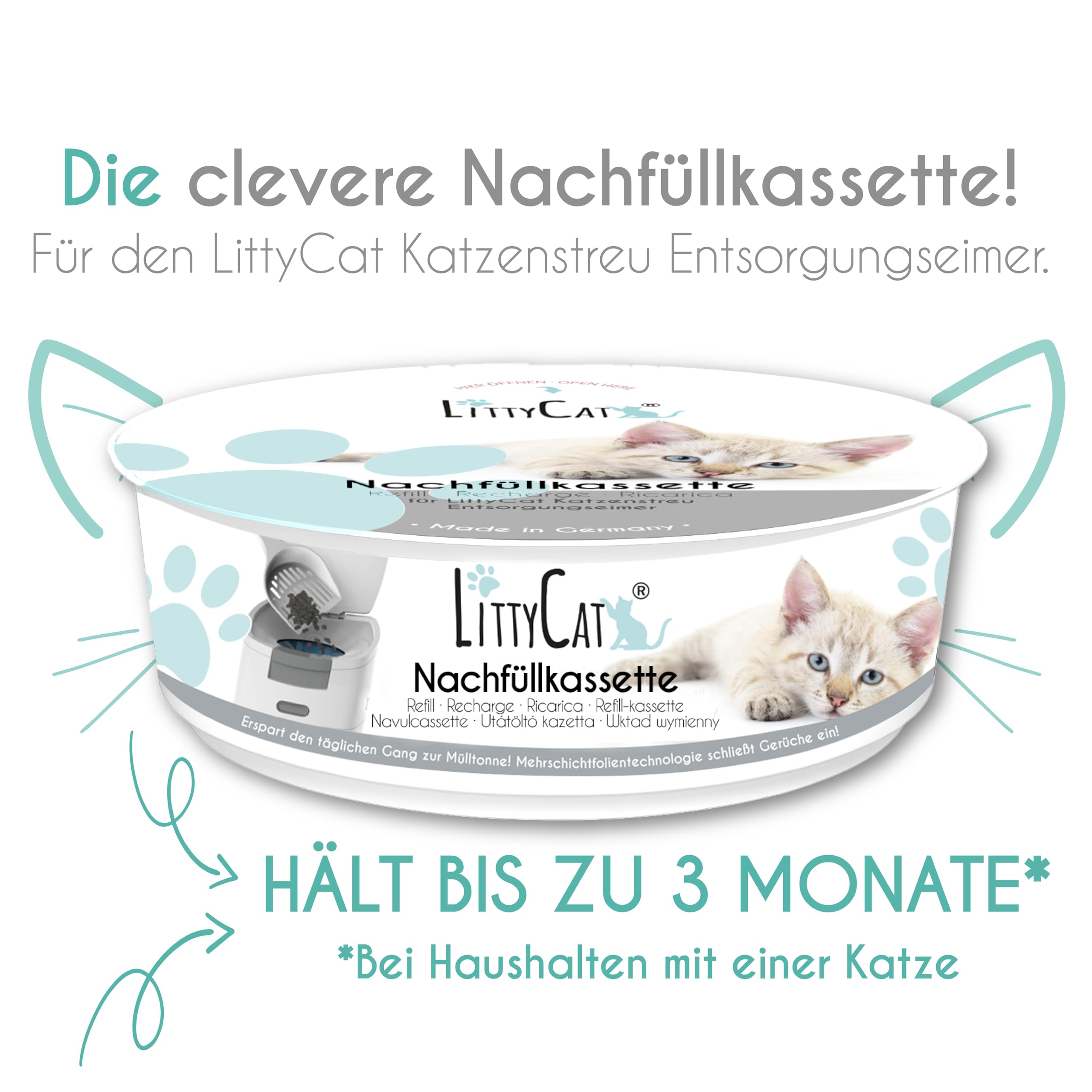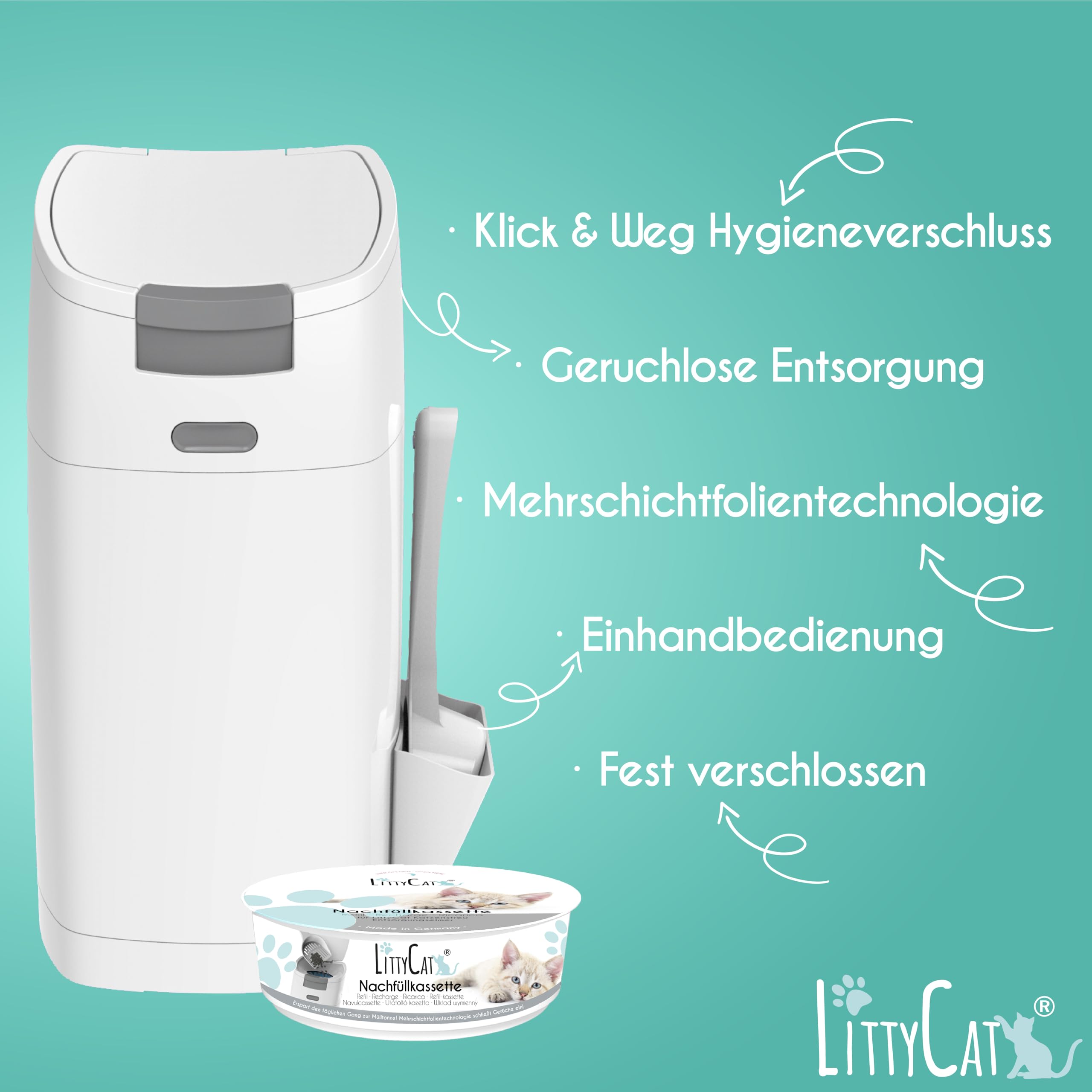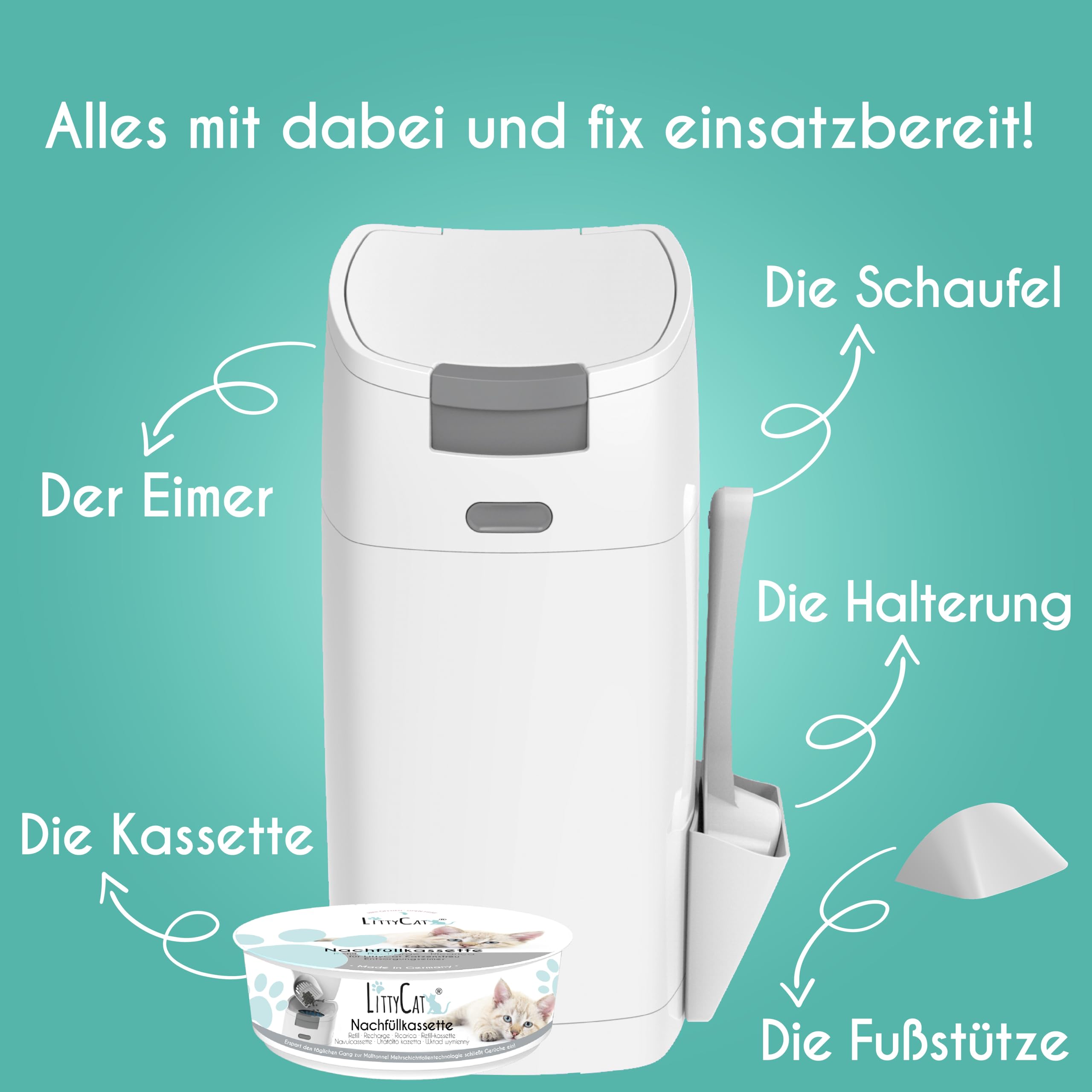 Littycat Katzenstreu Entsorgungseimer mit Schaufel - inkl. Nachfüllkassette - Katzenklo Mülleimer weiss-grau
