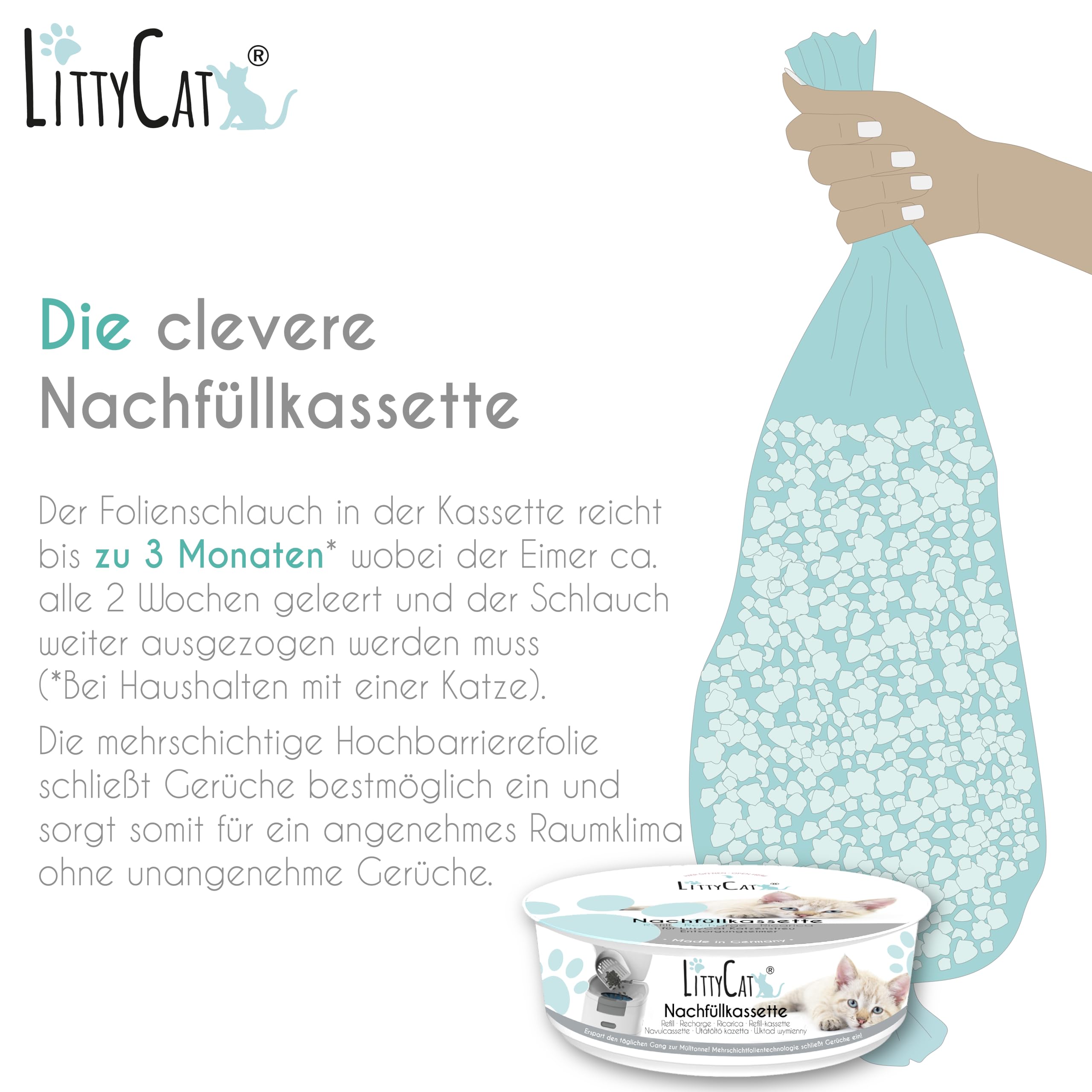 Entdecken Sie den Littycat Katzenstreu Entsorgungseimer mit Schaufel, der Ihnen eine geruchlose und hygienische Entsorgung von Katzenstreu ermöglicht. Das einzigartige Magnetverschlusssystem und die luftundurchlässige Mehrschichtfolientechnologie sorgen für einen bestmöglichen Geruchseinschluss. Der Eimer öffnet sich per Knopfdruck und verschwindet das Katzenstreu mühelos im Folienschlauch. Mit einem Fassungsvermögen von 2,03 kg und Abmessungen von 25 cm (L) x 21,5 cm (B) x 44 cm (H) ist er perfekt für Katzenbesitzer geeignet. Hergestellt in Deutschland, bietet er Ihnen eine zeitersparende und hygienische Lösung für die Katzenstreuentsorgung.
