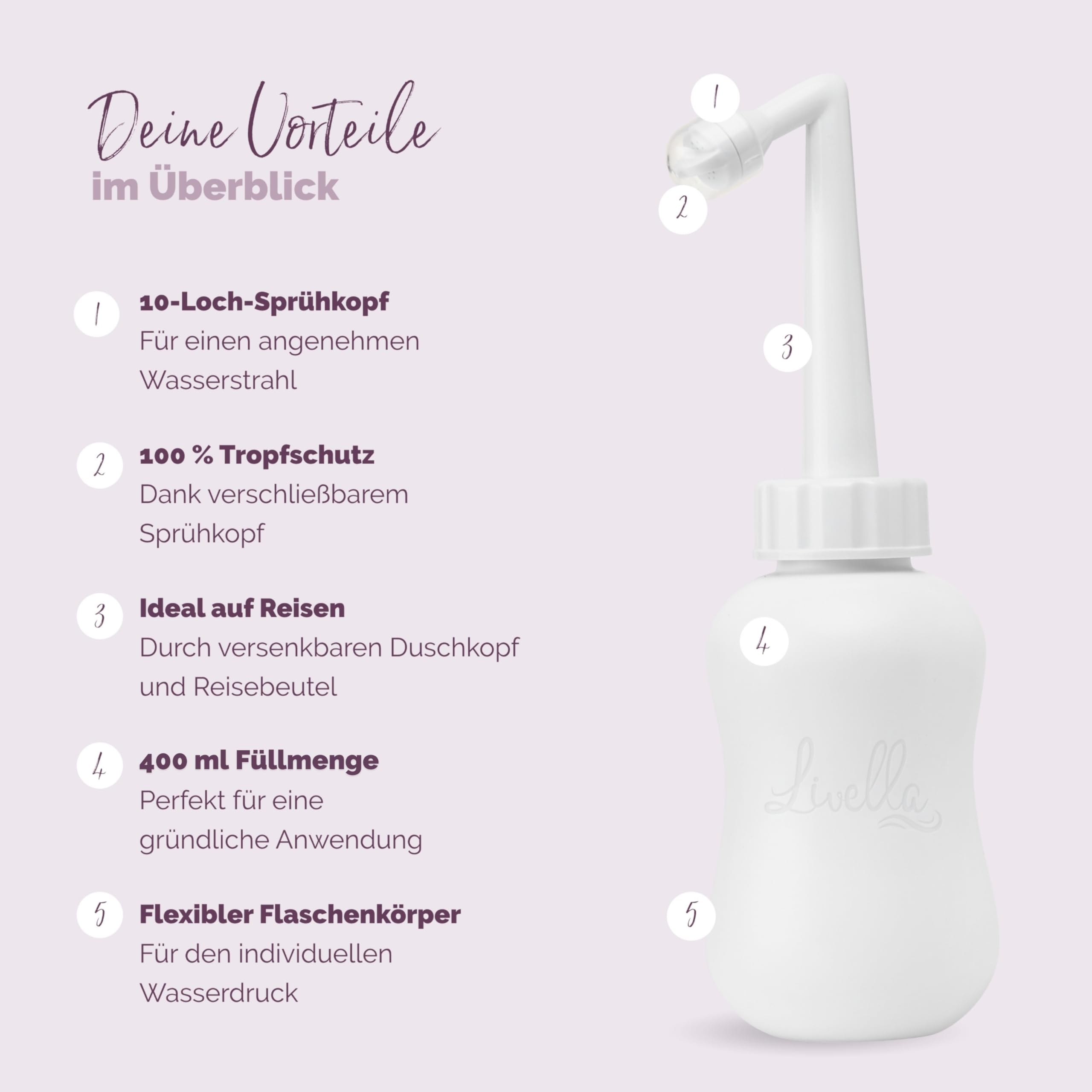 Livella Intimdusche in Weiß (400 ml) – Entwickelt in Deutschland - Für eine sanfte und hygienische Reinigung des Intimbereichs – Mehr Wohlbefinden im Wochenbett – Ideal als Reisebidet und Podusche
