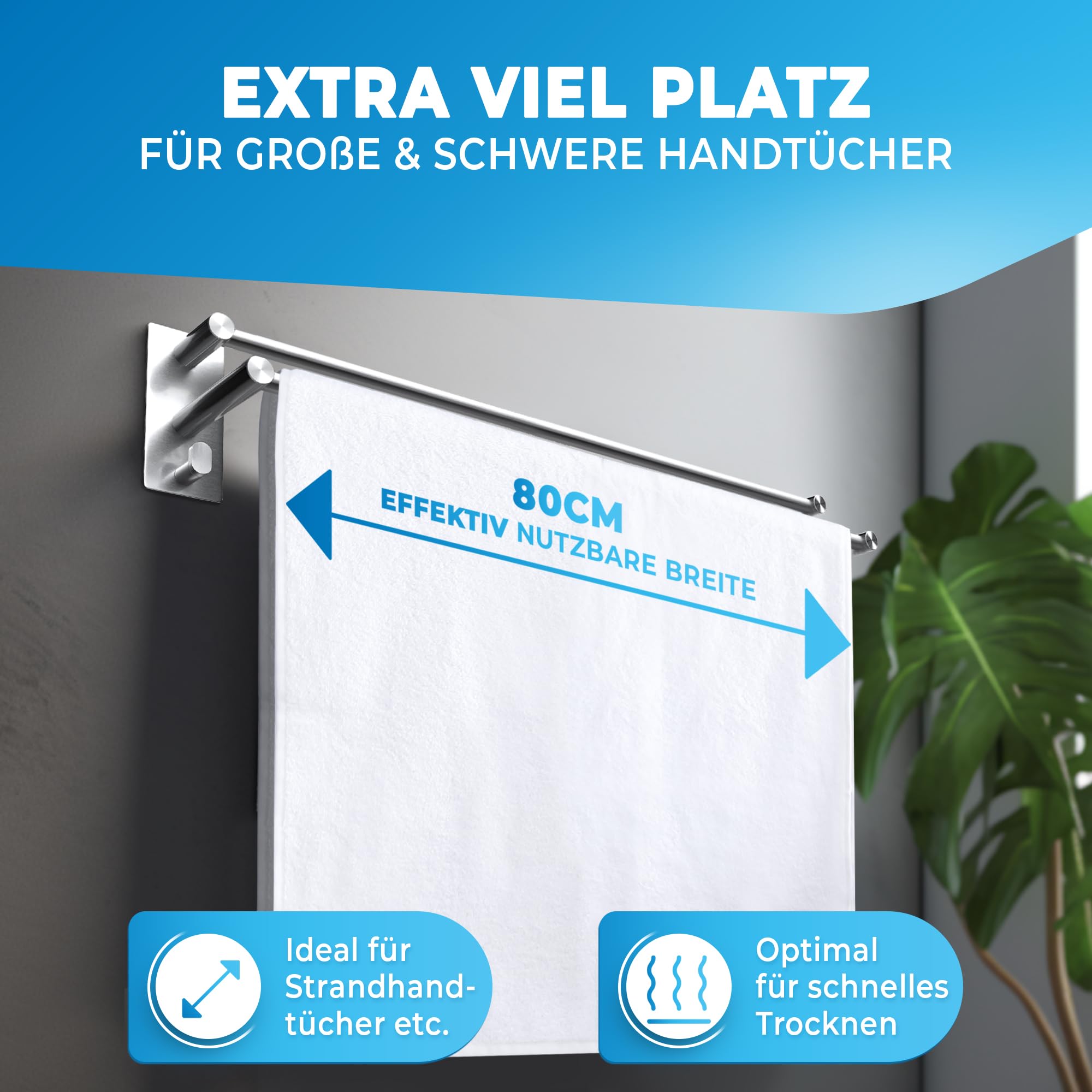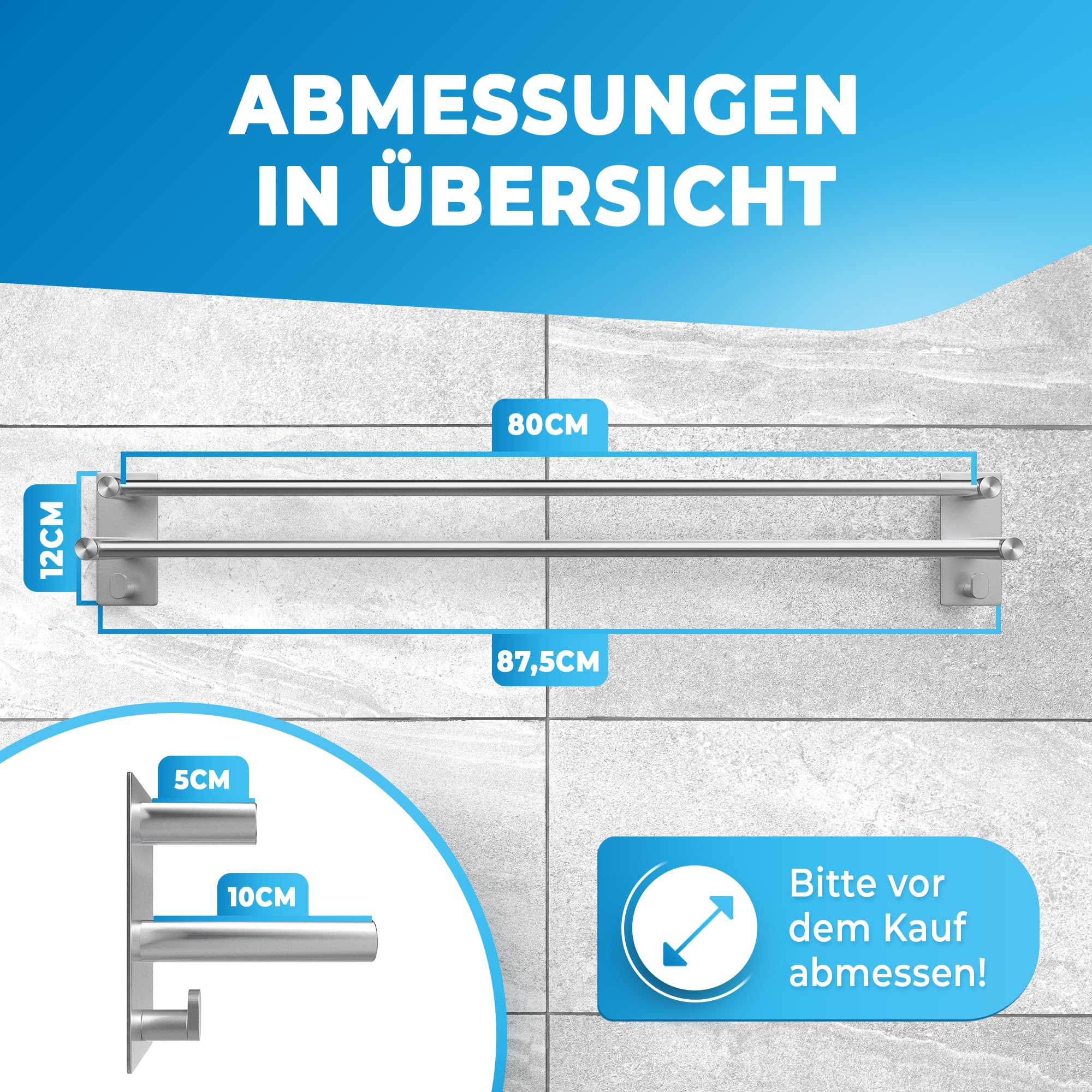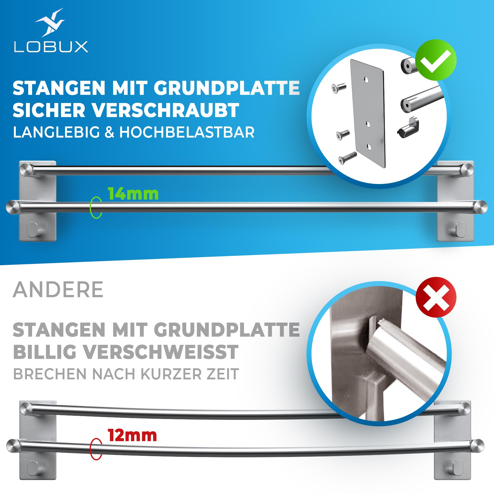 LOBUX® - Handtuchhalter ohne Bohren – 80cm, Edelstahl rostfrei – Handtuchhalter Bad doppelt, selbstklebend – Handtuchstange, Badetuchhalter inkl. 2 Handtuchhaken – für Badezimmer, Duschwand, Küche