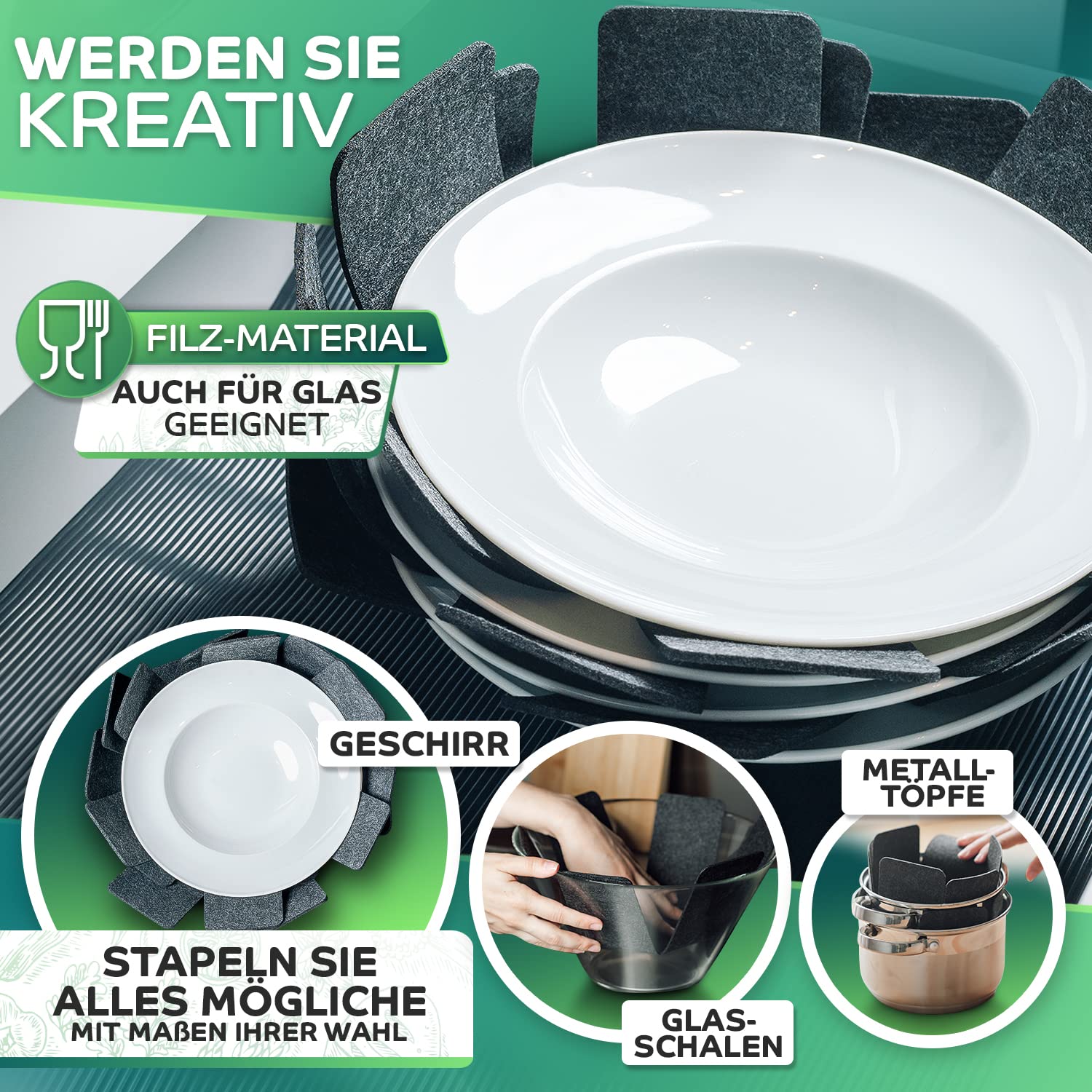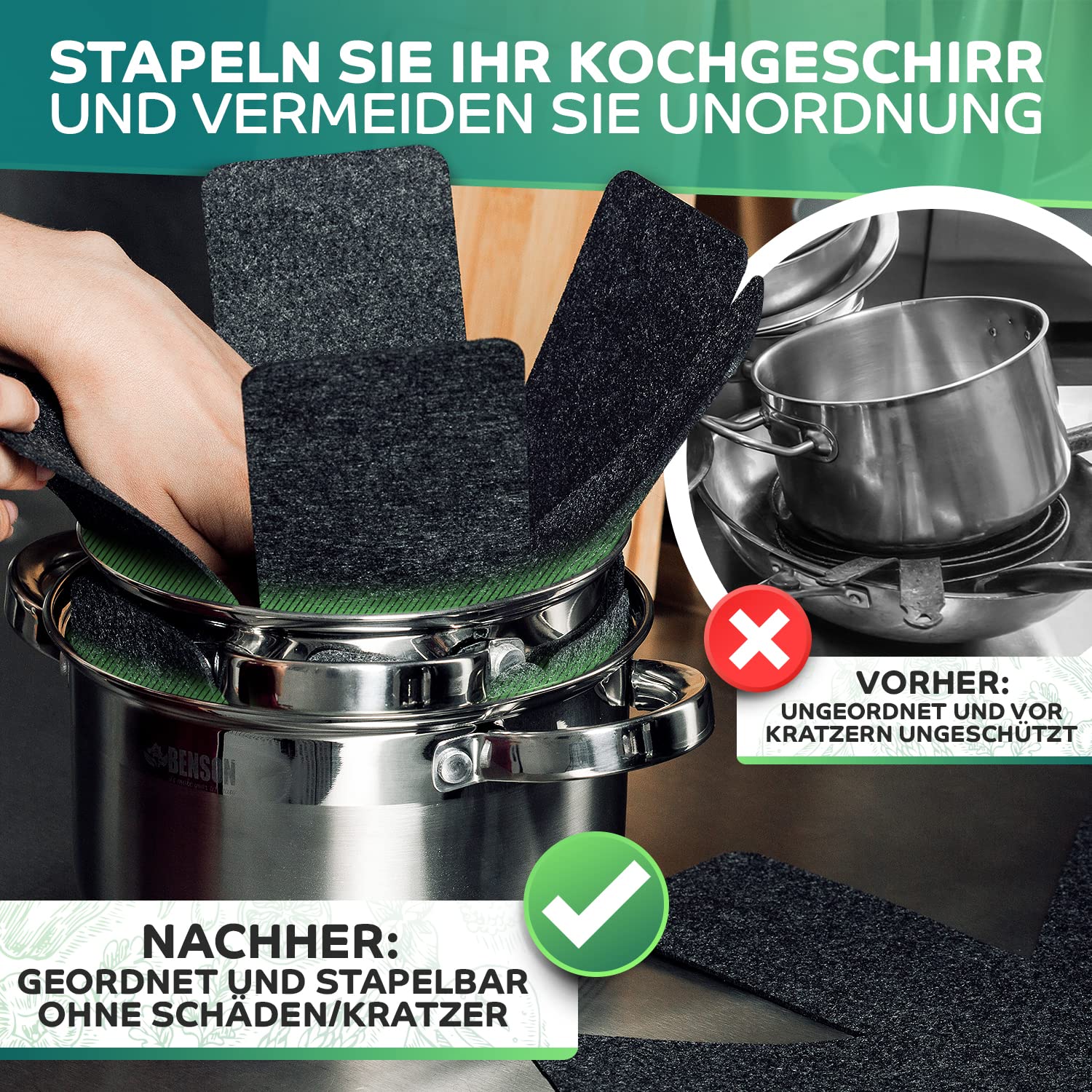 Schützen Sie Ihre Pfannen und Töpfe effektiv mit unserem Pfannenuntersetzer-Set aus hochwertigem Filz. Diese Pfannen Filz Trenner sind ideal, um Ihre Kochutensilien ohne Kratzer zu stapeln. Unser Tellerschutz Stapelschutz bietet zusätzlichen Schutz für empfindliche Oberflächen, während der Topf Schutz und der Pfannenstapler für eine platzsparende Aufbewahrung sorgen. Die Pfannen Untersetzer und Pfannen Stapelschutz bestehen aus robustem Filz. Die Pfannen Zwischenlagen und Pfannen Zubehör bieten eine perfekte Lösung, um Ihre Küchengeräte sicher zu stapeln. Unsere Pfannentrenner Filz sind besonders sanft zu den Oberflächen und verhindern ein Verrutschen. Für zusätzliche Sicherheit sorgen die Topftrenner Filz und Pfannen Einleger, die dafür entwickelt wurden, die Lebensdauer Ihrer Kochutensilien zu verlängern. Die Filz Pfannenschutz und Pfannen Kratzschutz schützen Ihre Pfannen vor Kratzern und anderen Schäden, die durch das Stapeln entstehen können. Mit dem Pfannenschutz Stapelschutz Filz und Topf Zwischenleger bleiben Ihre Töpfe und Pfannen in bestem Zustand. Unsere Pfannen Zwischenlage und Filz Pfannenschoner sind einfach zu verwenden und bieten einen optimalen Schutz. Die Filz Schoner Pfanne und Filz Töpfe sind ideal, um Kratzer zu verhindern. Der Pfannenstapelschutz und der Topfeinlagen Schutz sorgen dafür, dass Ihre Pfannen und Töpfe sicher gestapelt werden können. Das Pfannenschoner Filz Set enthält verschiedene Grössen, darunter auch extra starke Pfannenschoner, die für zusätzlichen Schutz sorgen. Die Filz für Pfannen und Schutz Pfannen Stapeln sind perfekt für jede Küche. Mit unserem Topf Schutz Filz und Topf und Pfannentrenner bleibt Ihre Küche gut organisiert. Unser Schutz für Töpfe Stapeln und Pfannen Abstandshalter sind unverzichtbare Helfer in jeder Küche. Das Pfannen Matte und Filz Zwischen Töpfe sorgen für einen sicheren Abstand zwischen Ihren Töpfen und Pfannen. Der Kochtopf Schoner und Pfanne Protector bieten den ultimativen Schutz.