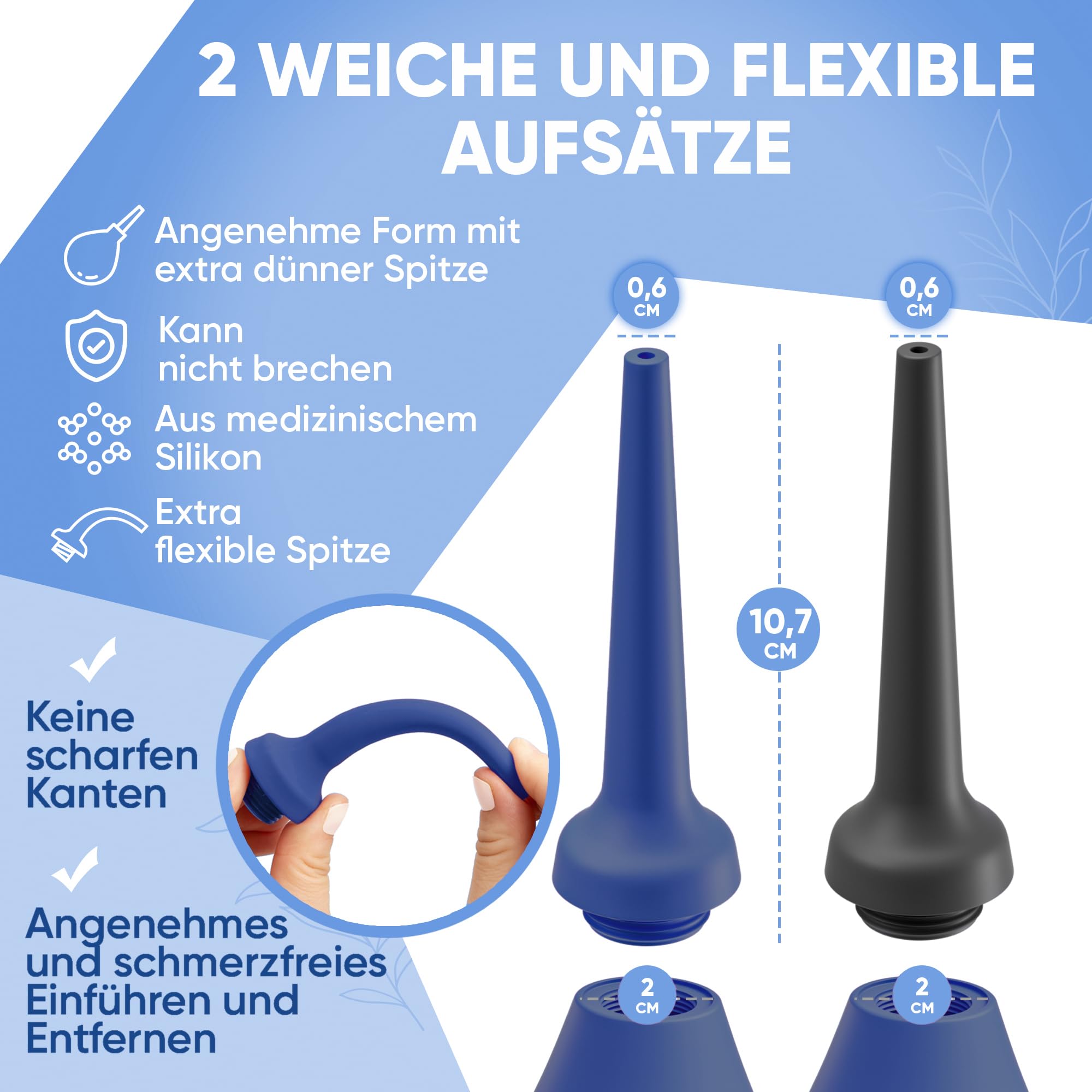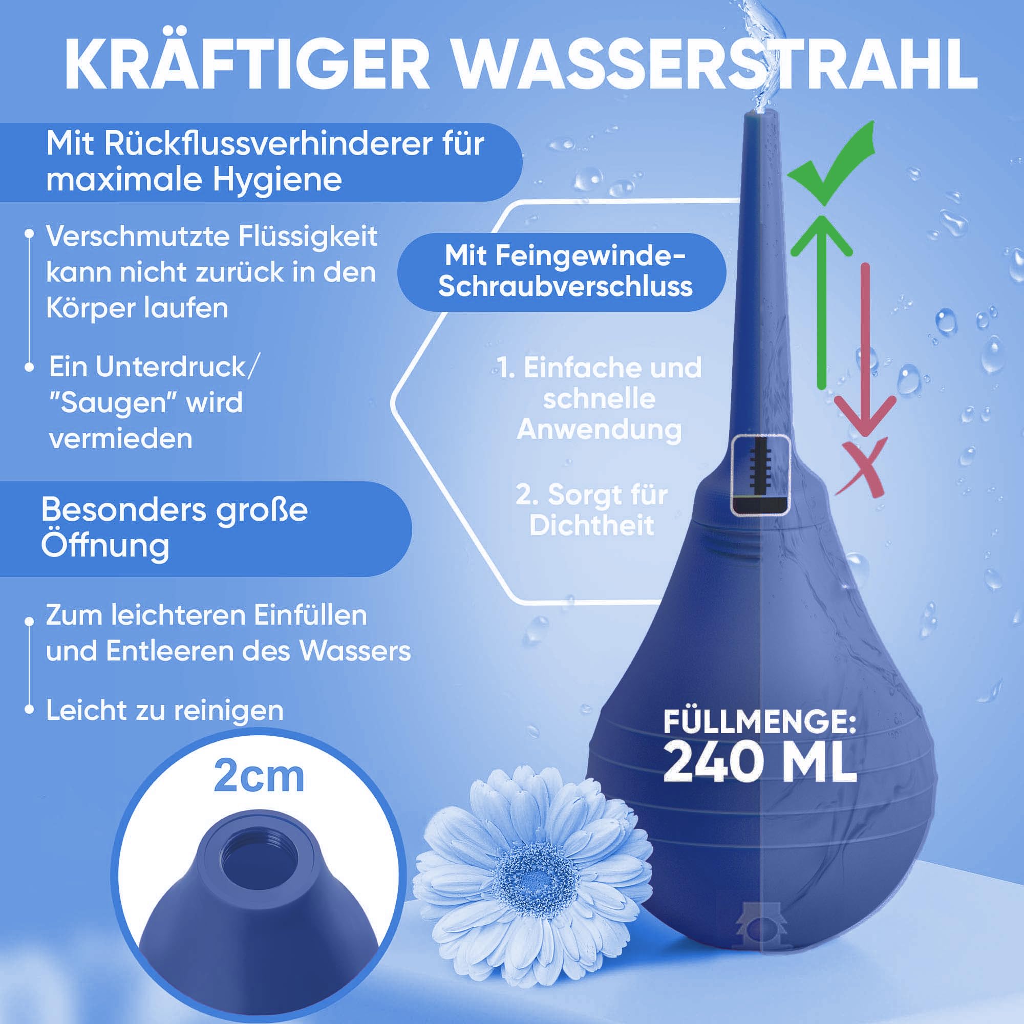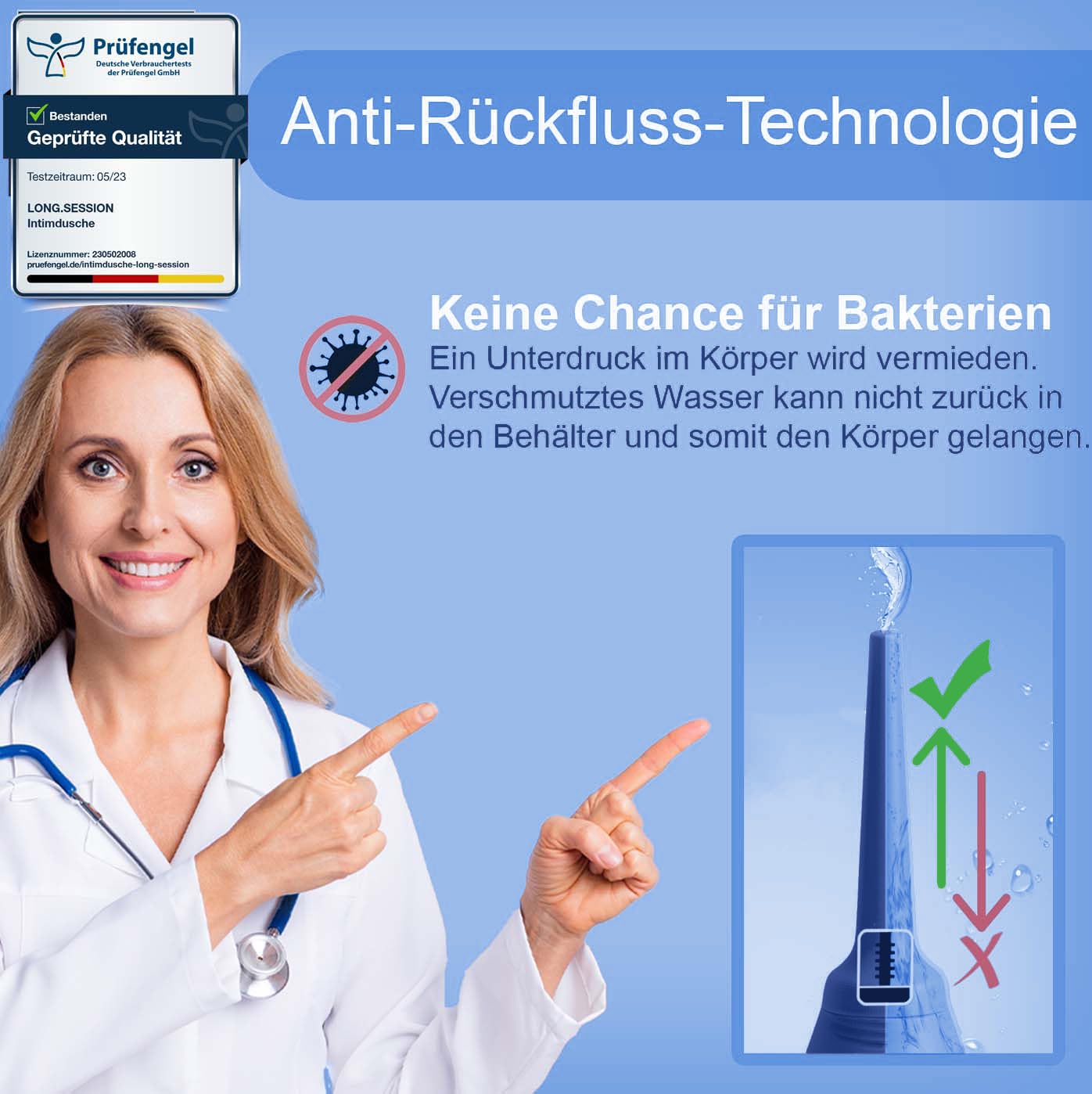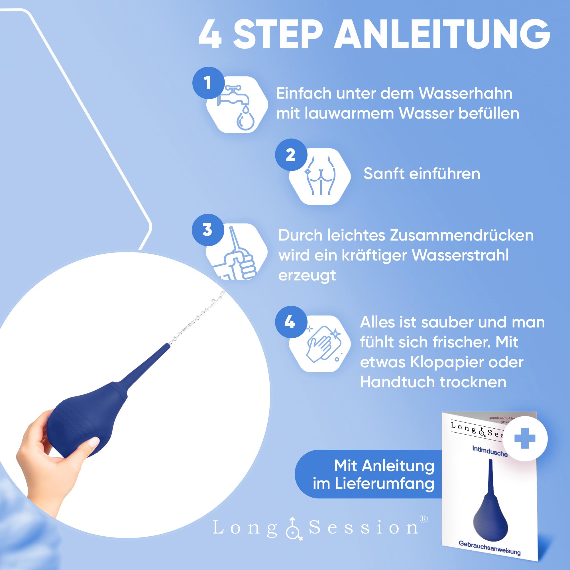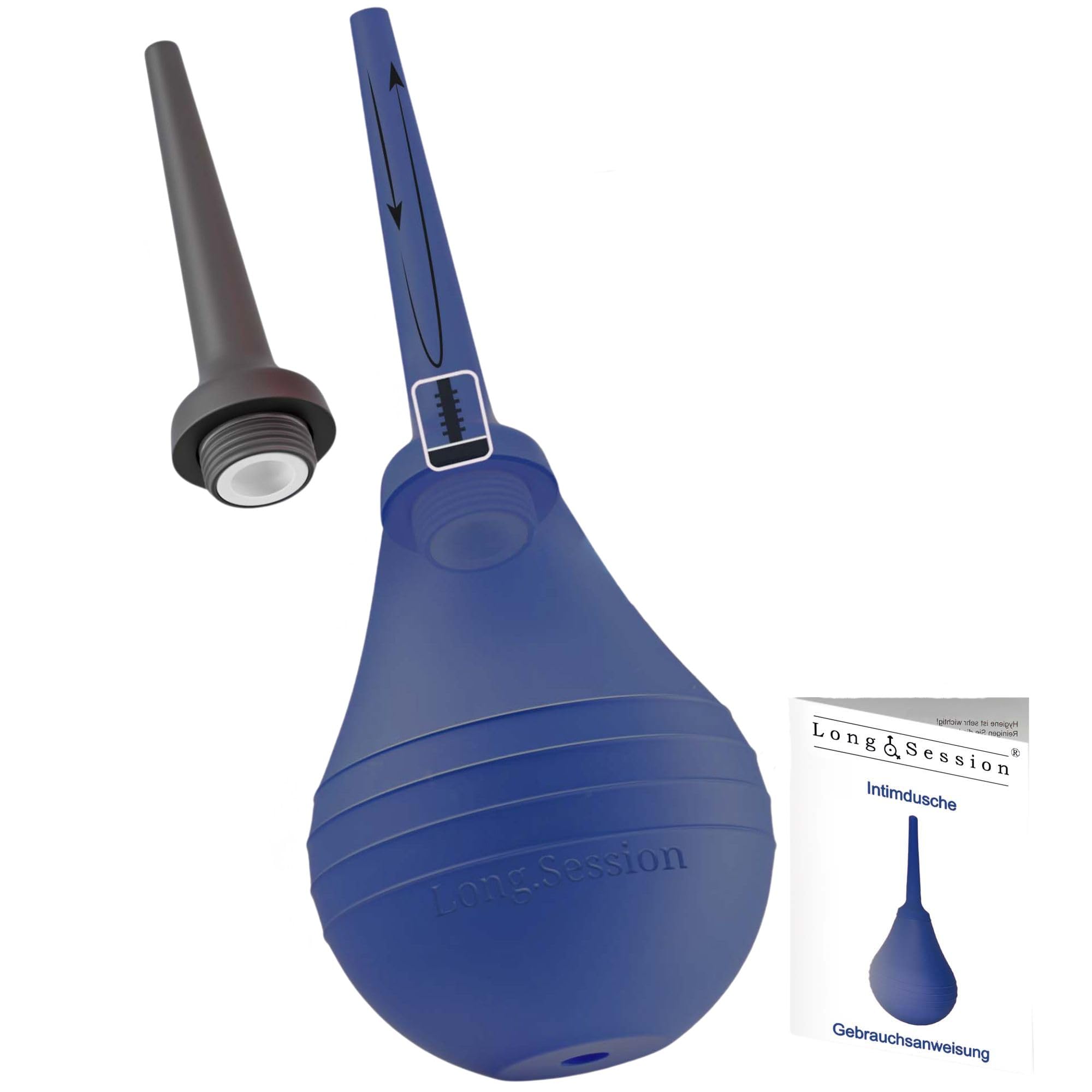 Long.Session Analdusche 240 ml mit Anti-Rueckfluss, Intimdusche Enema mit 2 Aufsaetzen, Blau