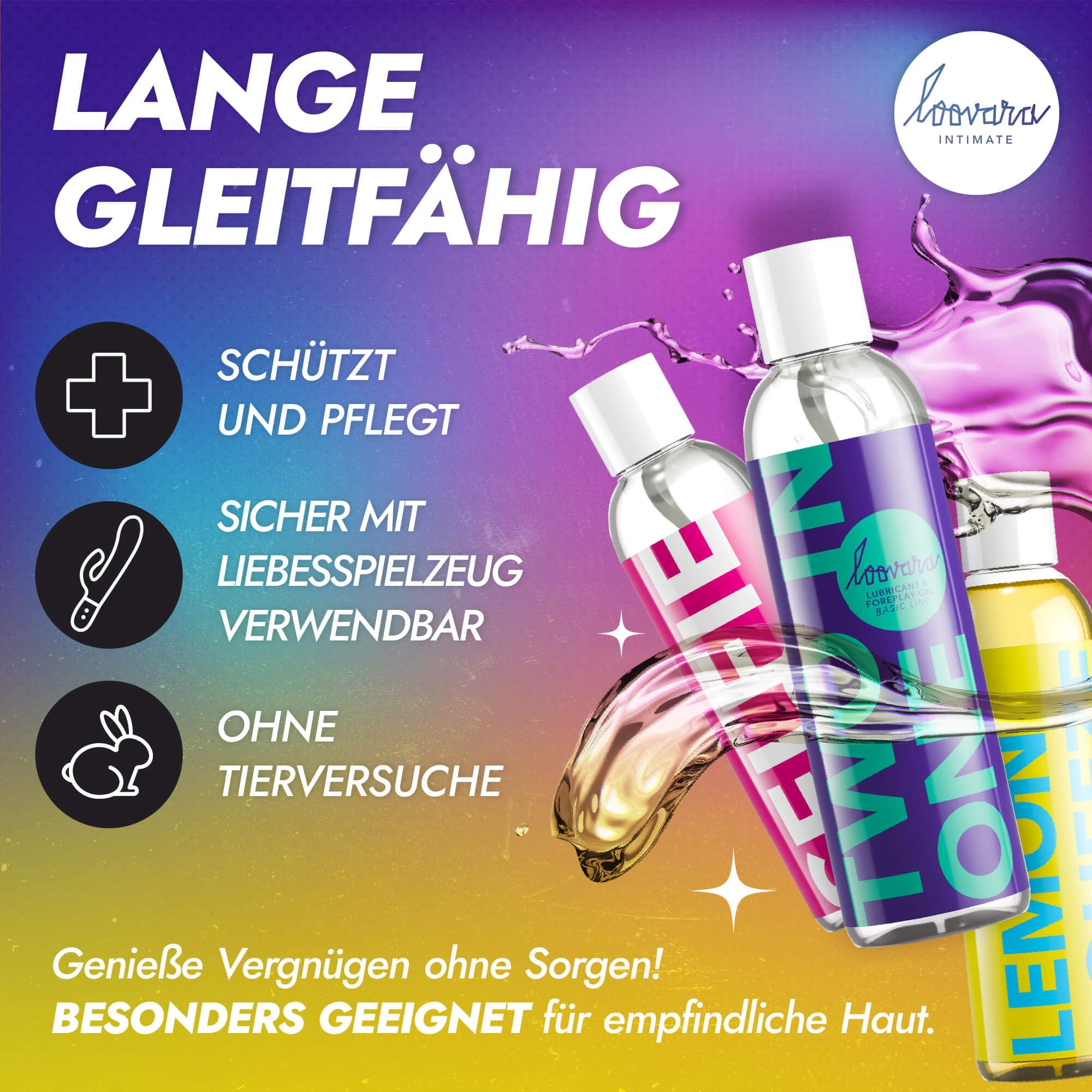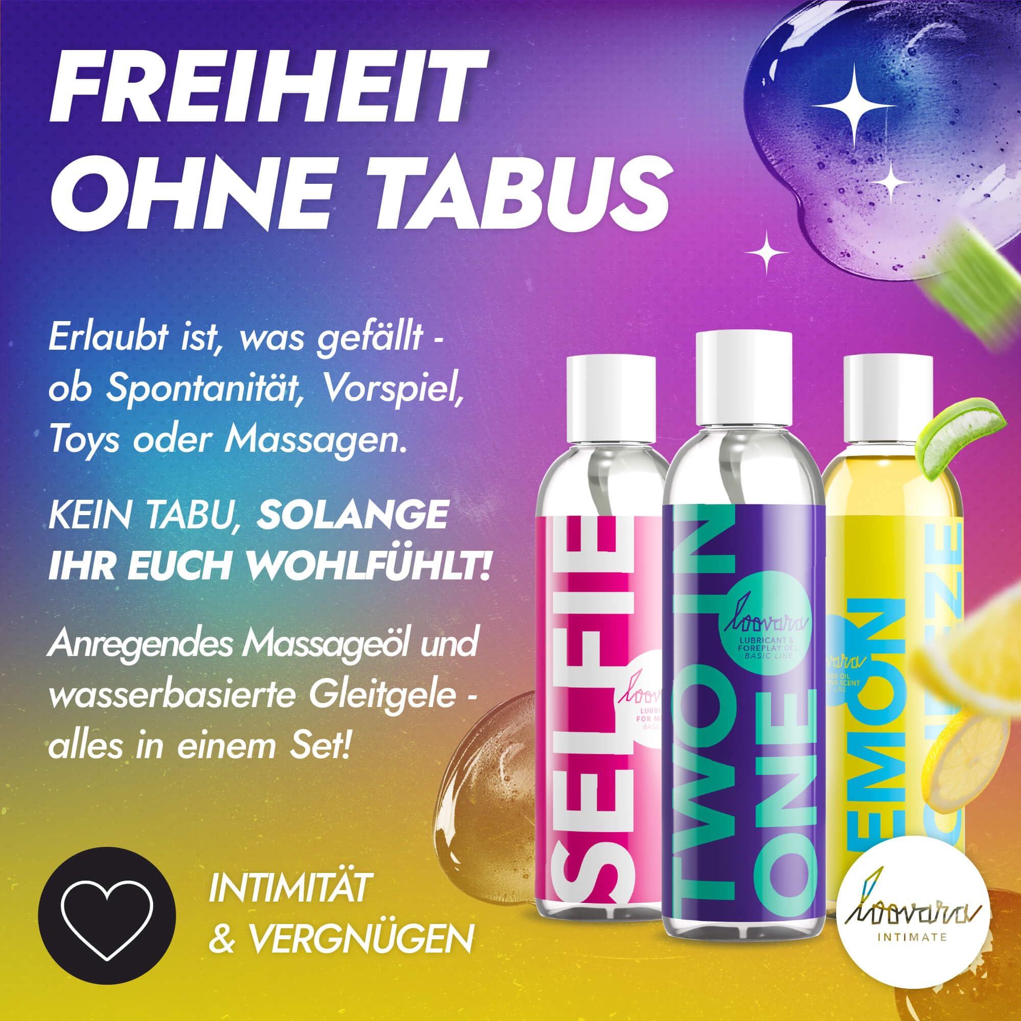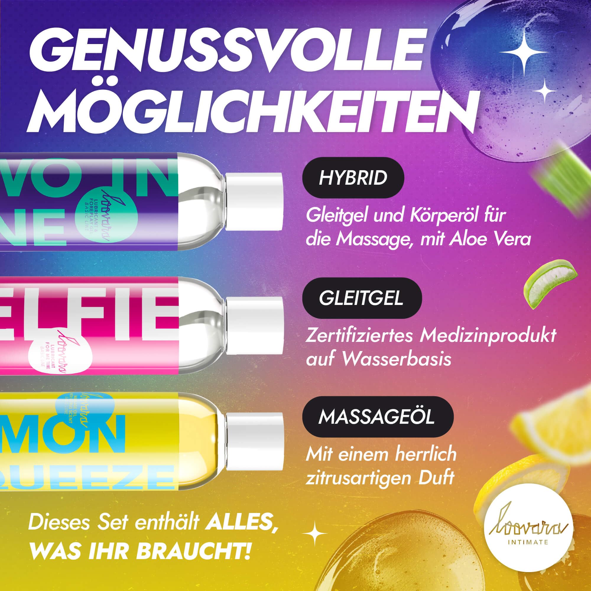 Das Loovara Vorteilspack macht den Sex flexibel. Ob entspannte Massage mit Happy End oder anregender Sex: Das Loovara Gel Set - Massageöl und Gleitgel im preiswerten Vorteilspack!Hier eine Übersicht über die wichtigsten Eigenschaften: Selfie Gleitgel, Lemon Squeeze Massageöl und Two in One - Massageöl und Gleitgel in EinemGleitgel und Massage-Öl in einem BundleInhalt: 3x 250 mlmit pflegender Aloe Veranur natürliche Inhaltsstoffe, frei von Parfümen und Zusatzstoffenfür Massage, Masturbation und Oralsex geeignetWoher stammt das Produkt? Alle Loovara Produkte werden grösstenteils in der Europäischen Union und teilweise auch in Deutschland hergestellt, geprüft und dokumentiert. Darüber hinaus werden bei der Herstellung natürliche Inhaltsstoffe, kein Parfüm und keine unnötigen Zusätze verwendet. Das bedeutet, dass jede einzelne Produktions-Charge dokumentiert und getestet wird. Maximale Sicherheit für unsere Kundinnen und Kunden!Welche Inhaltsstoffe enthält Loovara Two in One? Helianthus Annuus Seed Oil, Glycine Soja Oil, Brassica Campestris Oleifera Oil, Ricinus Communis OilWelche Inhaltsstoffe enthält Loovara Lemon Squeeze? Helianthus Annuus Seed Oil, Limonene, Linalool, Citral, CitronellolWelche Inhaltsstoffe enthält Loovara Selfie? Aqua (Water), Glycerin, Hydroxyethyl-Cellulose, Phenixyethanol, EthylhexyglycerinWird der Artikel neutral versandt? Die Artikel werden diskret in neutralen Versandkartons versendet. Von aussen ist nicht sichtbar, um welches Produkt es sich handelt.