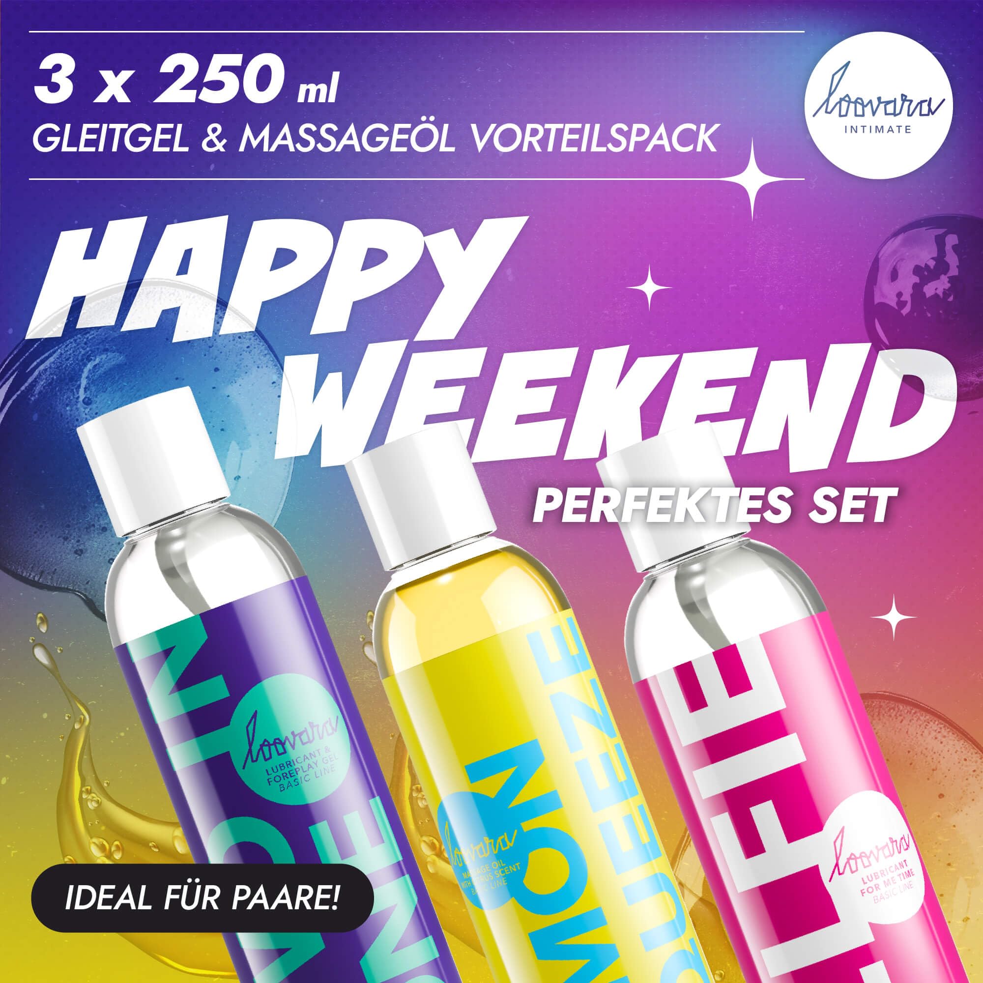 Loovara Gleitgel Massageöl 3x250ml Vorteilspack - HAPPY WEEKEND – pflegendes Massageöl Gleitgel Set, Vegan, natürlich, dermatologisch getestet, kondomsicher, Ideal für Vorspiel, Sex & Sex-Spielzeug