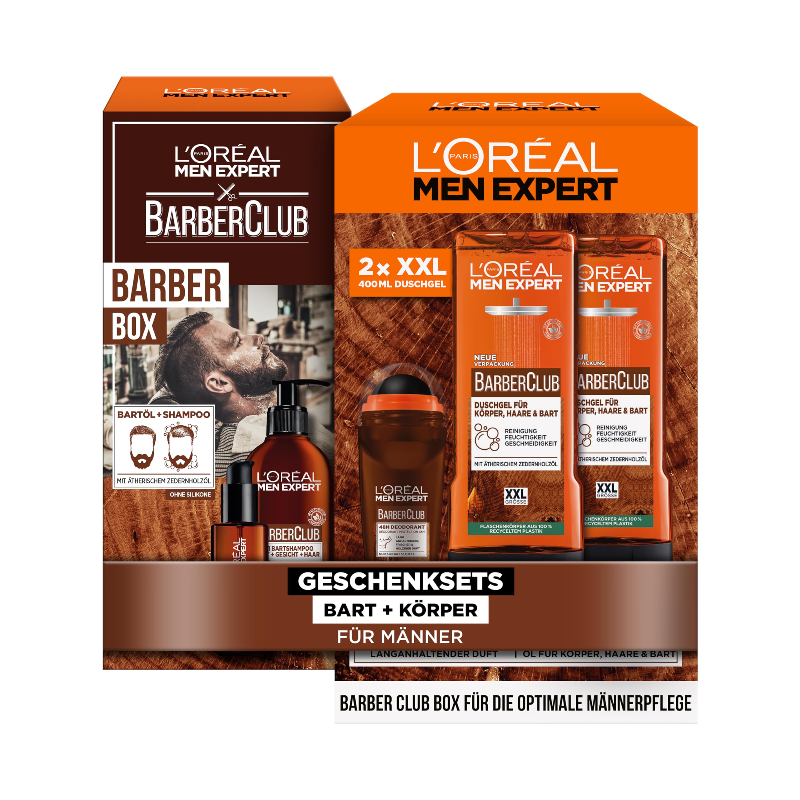 L'Oréal Men Expert Pflegesets für Bart und Körper für Männer, Mit Bartshampoo, Bartöl, 2x Duschgel und Deo, Geschenkset für Herren mit ätherischem Zedernholzöl, Barber Club, 5-teilig