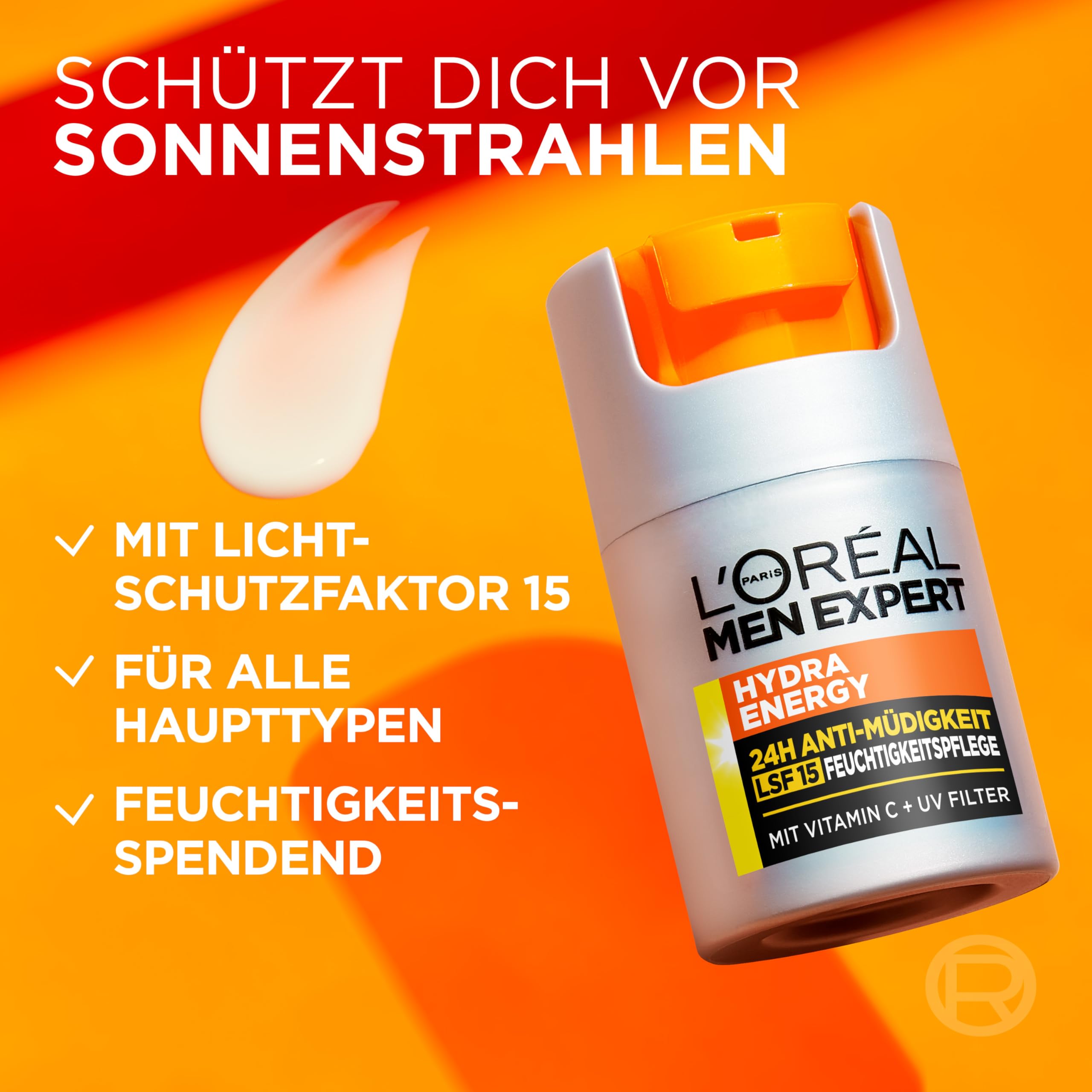 L'Oréal Men Expert Gesichtspflege mit LSF 15 für Männer, Belebende Feuchtigkeitscreme 24H Anti-Müdigkeit mit Sonnenschutz, Gesichtscreme für Herren mit Vitamin C und Proteinen, Hydra Energy, 1 x 50 ml