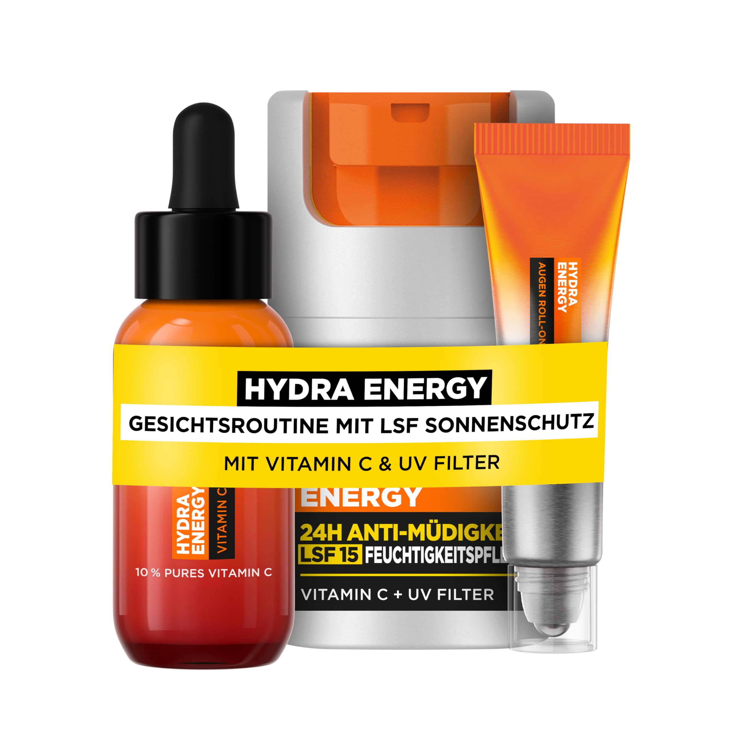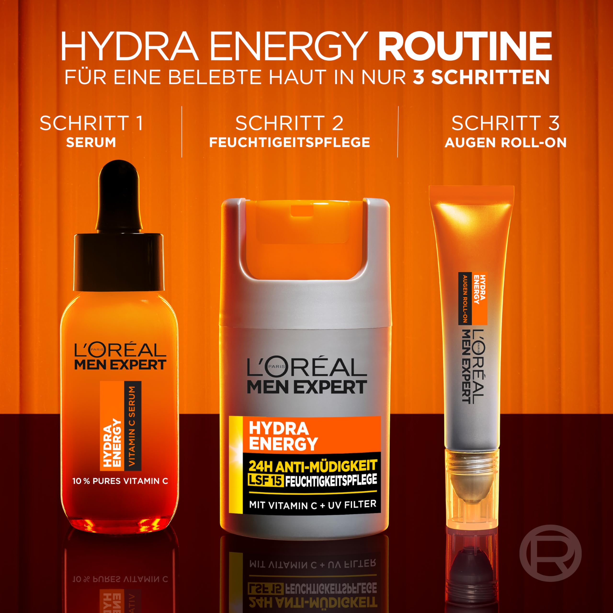 L'Oréal Men Expert Pflegeset mit Sonnenschutz für Männer, Mit Gesichtscreme LSF 15, Gesichtsserum und Augen Roll-On, Set für Herren mit Vitamin C, Hydra Energy, 3-teilig