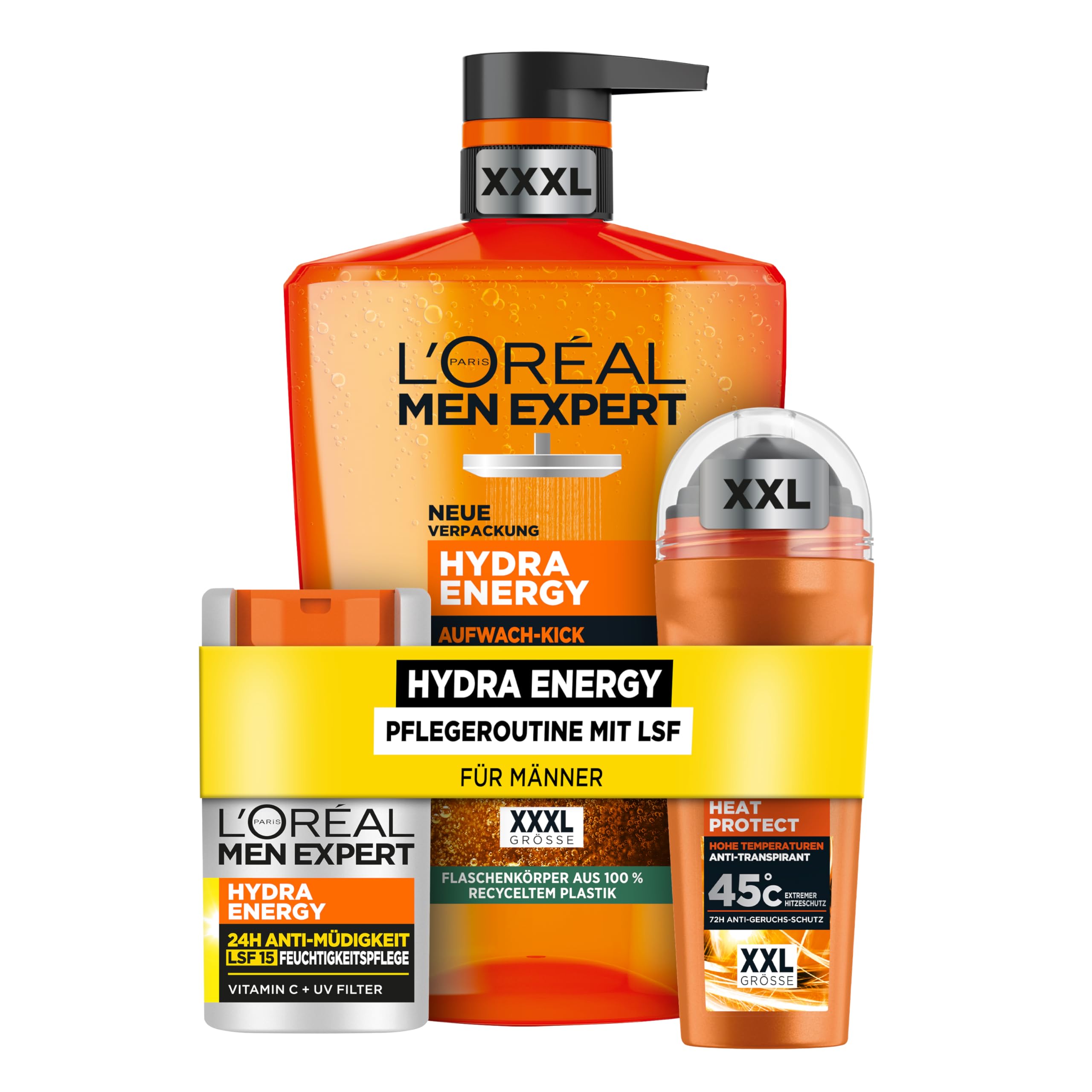 L'Oréal Men Expert Pflegeset mit Sonnenschutz für Männer, Mit XXXL Duschgel, XXL Deoroller und Gesichtscreme LSF 15, Set für Herren mit Taurin, Vitamin C und Keramik, Hydra Energy, 3-teilig