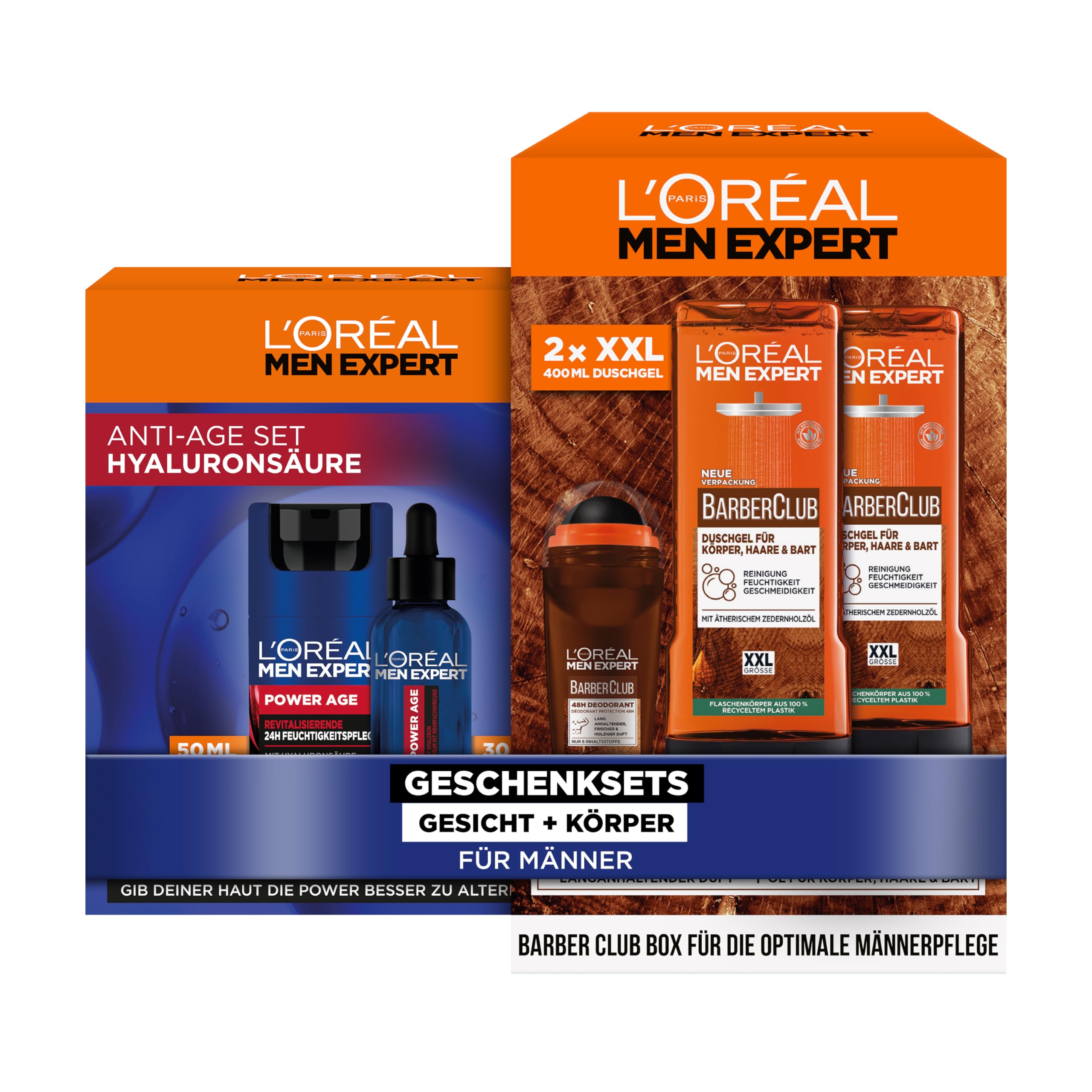 L'Oréal Men Expert Pflegesets für Gesicht und Körper für Männer, Mit Gesichtscreme, Gesichtsserum, 2x Duschgel und Deo Roll-On, Geschenkset für Herren, Power Age, Barber Club, 5-teilig