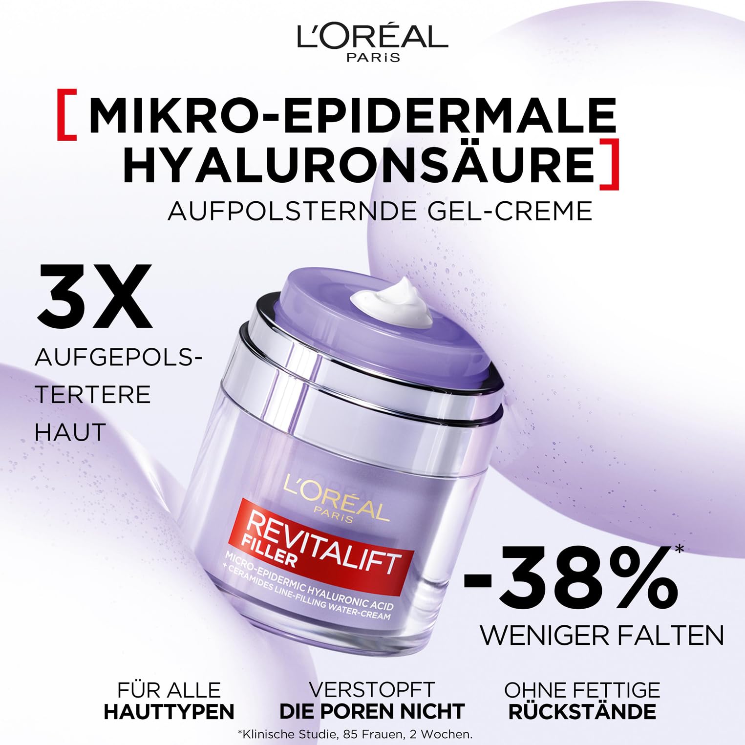 L'Oréal Paris Revitalift Filler Aufpolsternde Gel-Creme (50ml) – Mit Hyaluronsäure, Niacinamid & Ceramide – Intensive Gesichtspflege gegen Fältchen