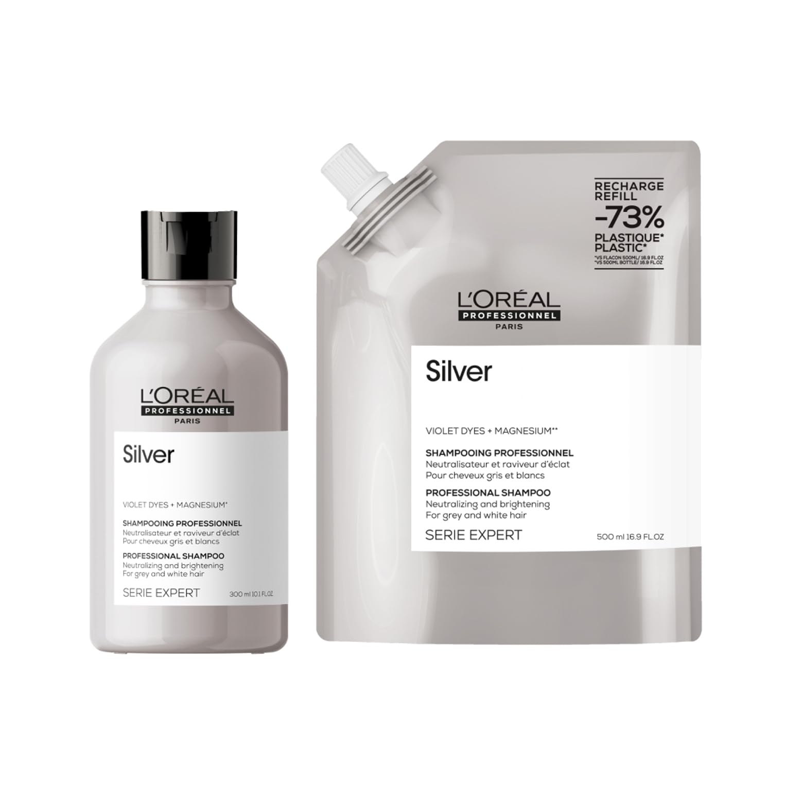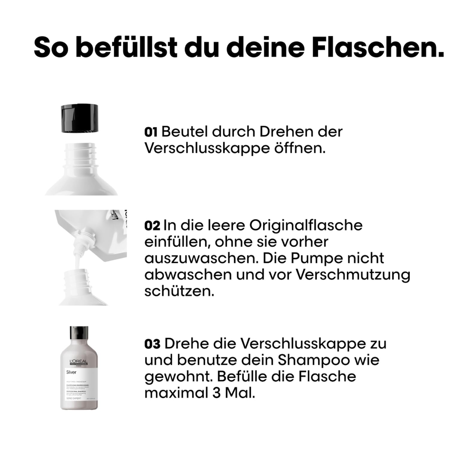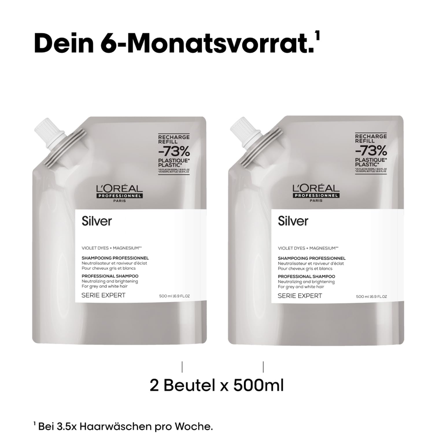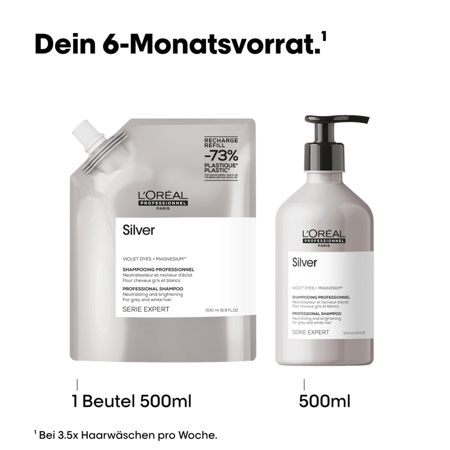 L'Oréal Professionnel Anti-Gelbstich Haarshampoo für weißes, graues & blondiertes Haar, Violett-Pigmente, Serie Expert, Silver Shampoo zum Nachfüllen, Refill, 500 ml