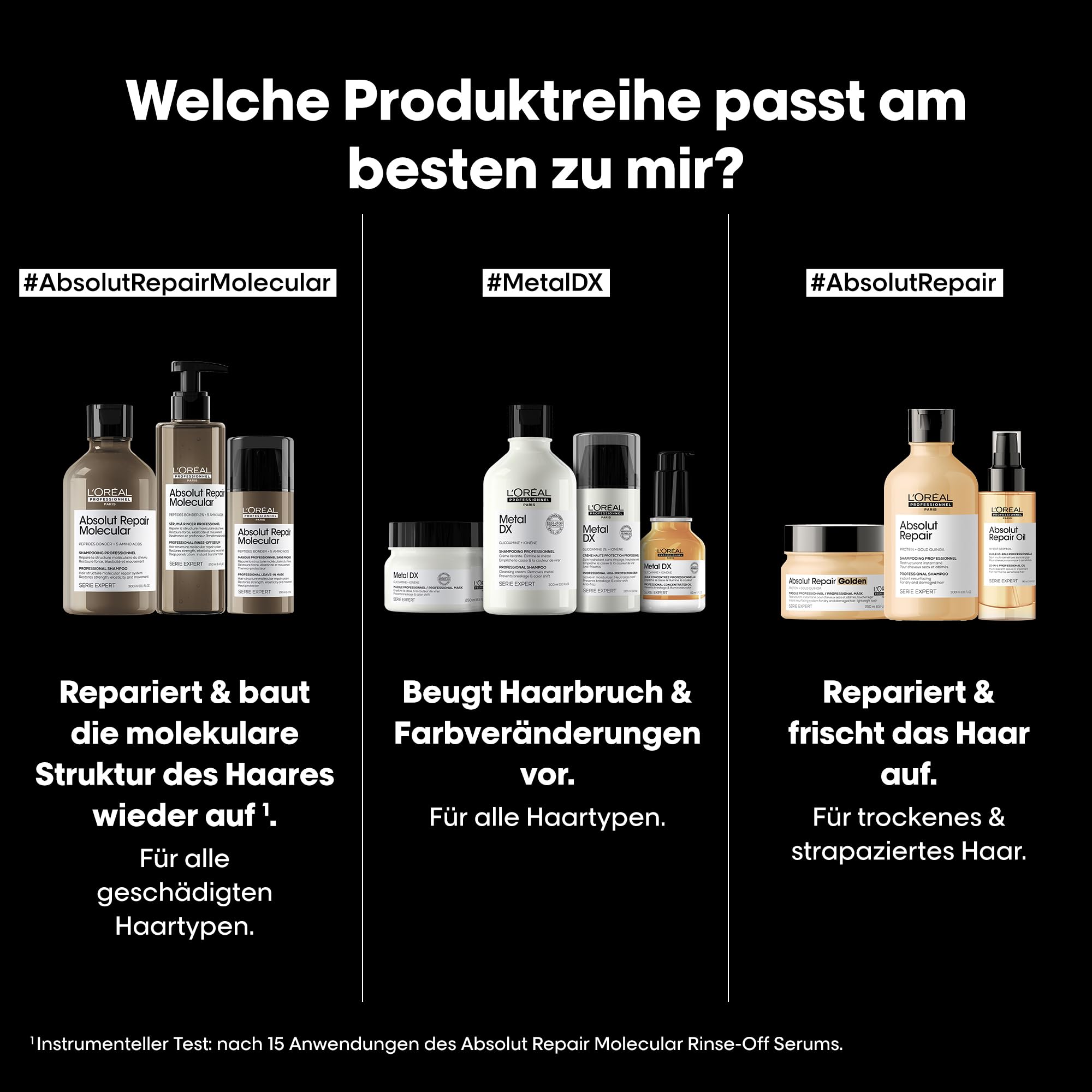 • Gleichmässig auf das nasse Haar auftragen, aufschäumen und abschliessend gründlich auswaschen; Für optimale Ergebnisse mit weiteren Serie Expert Absolut Repair Haarpflegeprodukten kombinieren. Für die tägliche Anwendung geeignet