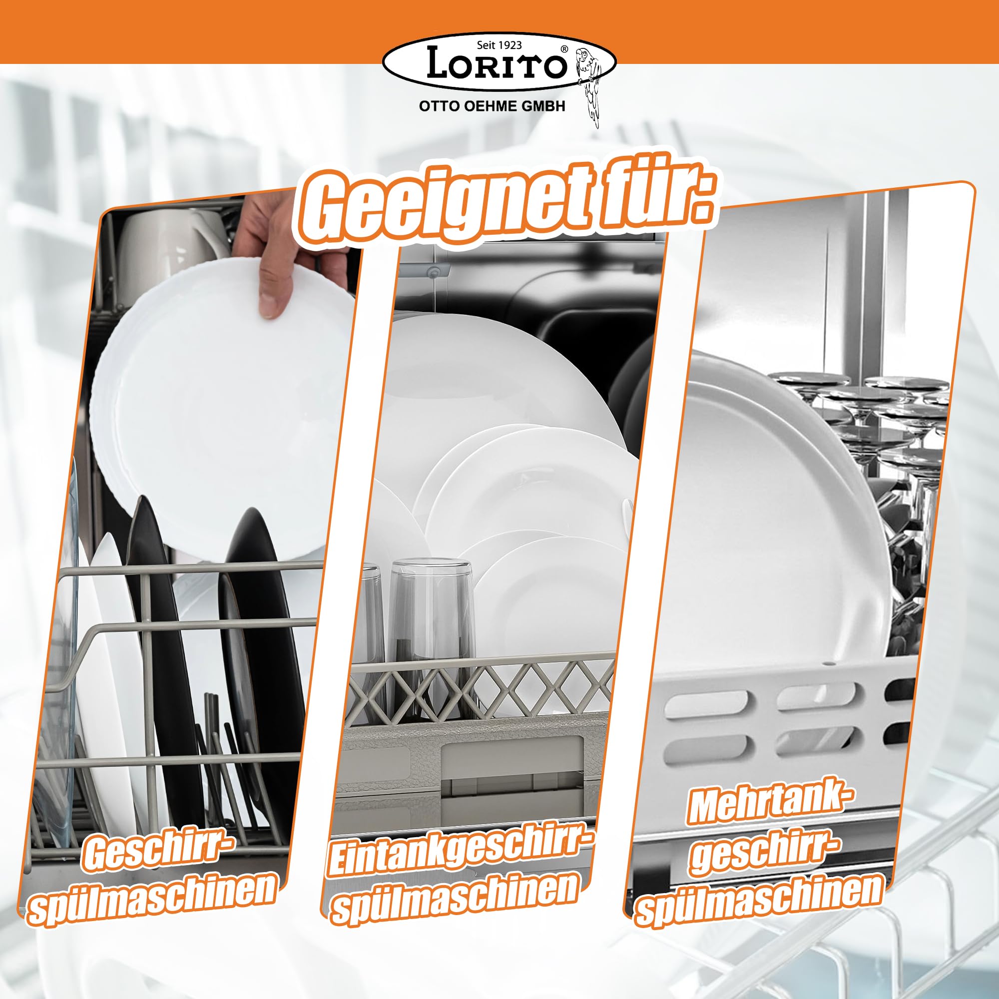 Mindestanzahl für die Bestellung von "Lorito frisch & sauber Spülmat Spülmaschine, 10 Liter, Geschirrspülreiniger für gewerbliche Geschirrspülmaschinen, schnelltrocknend, pflegend, 10 Liter Kanister" ist 1.