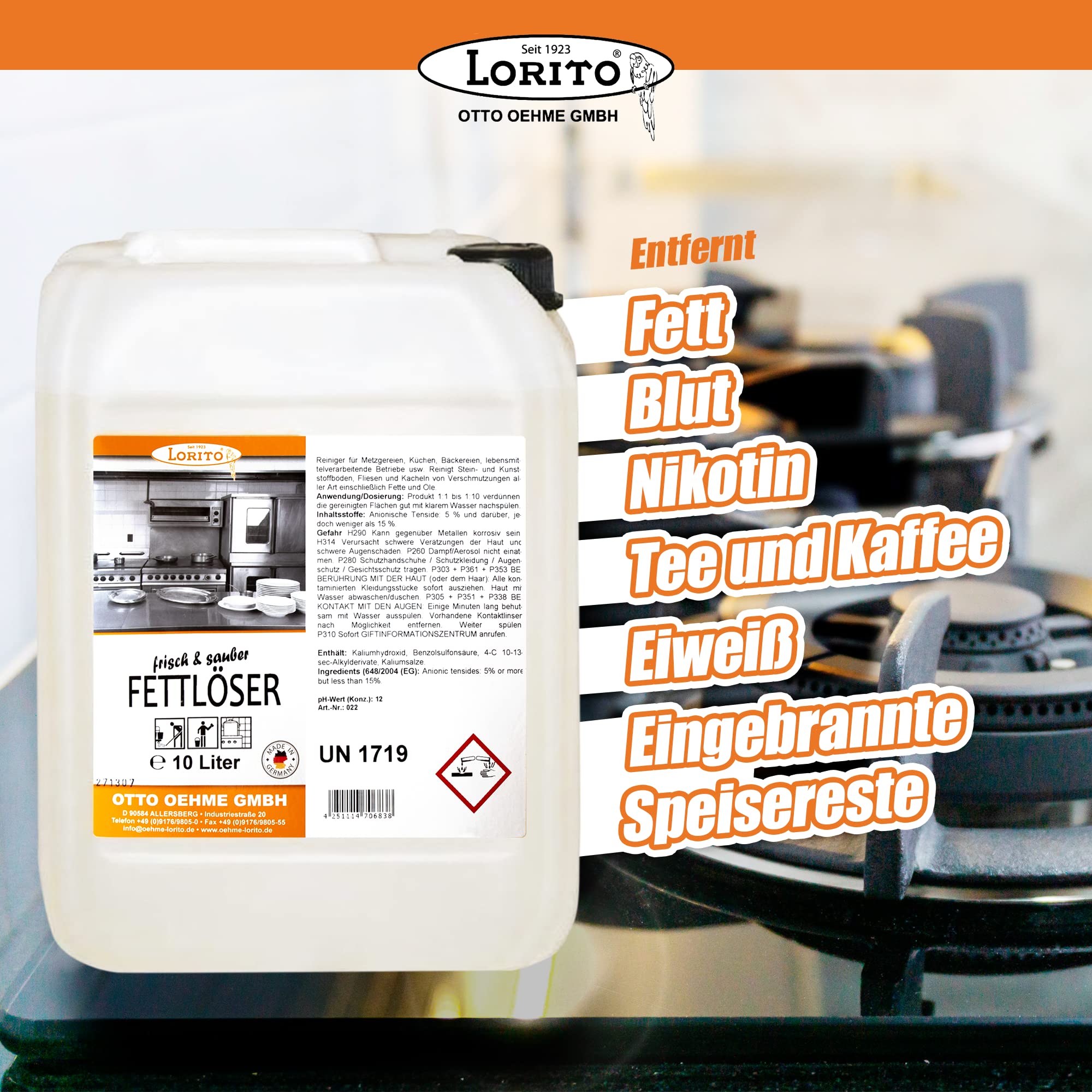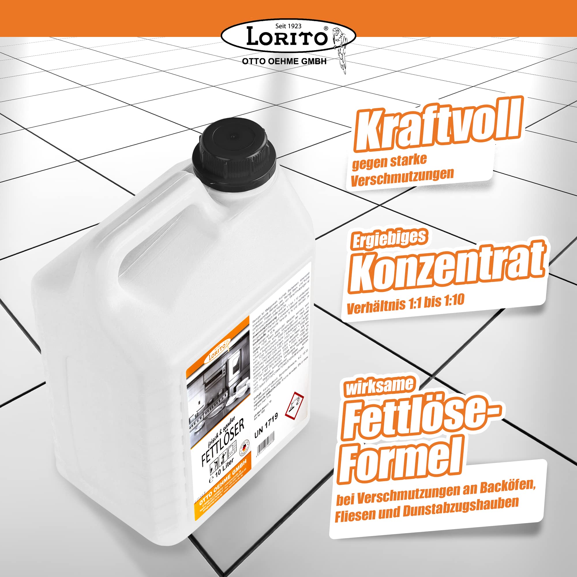 Lorito Profi-Fettlöser stark für Gastronomie & Küche 2x 10 Liter, Küchen-Reiniger Konzentrat für Dunstabzugshaube, Grill, Backofen und Fliesen
