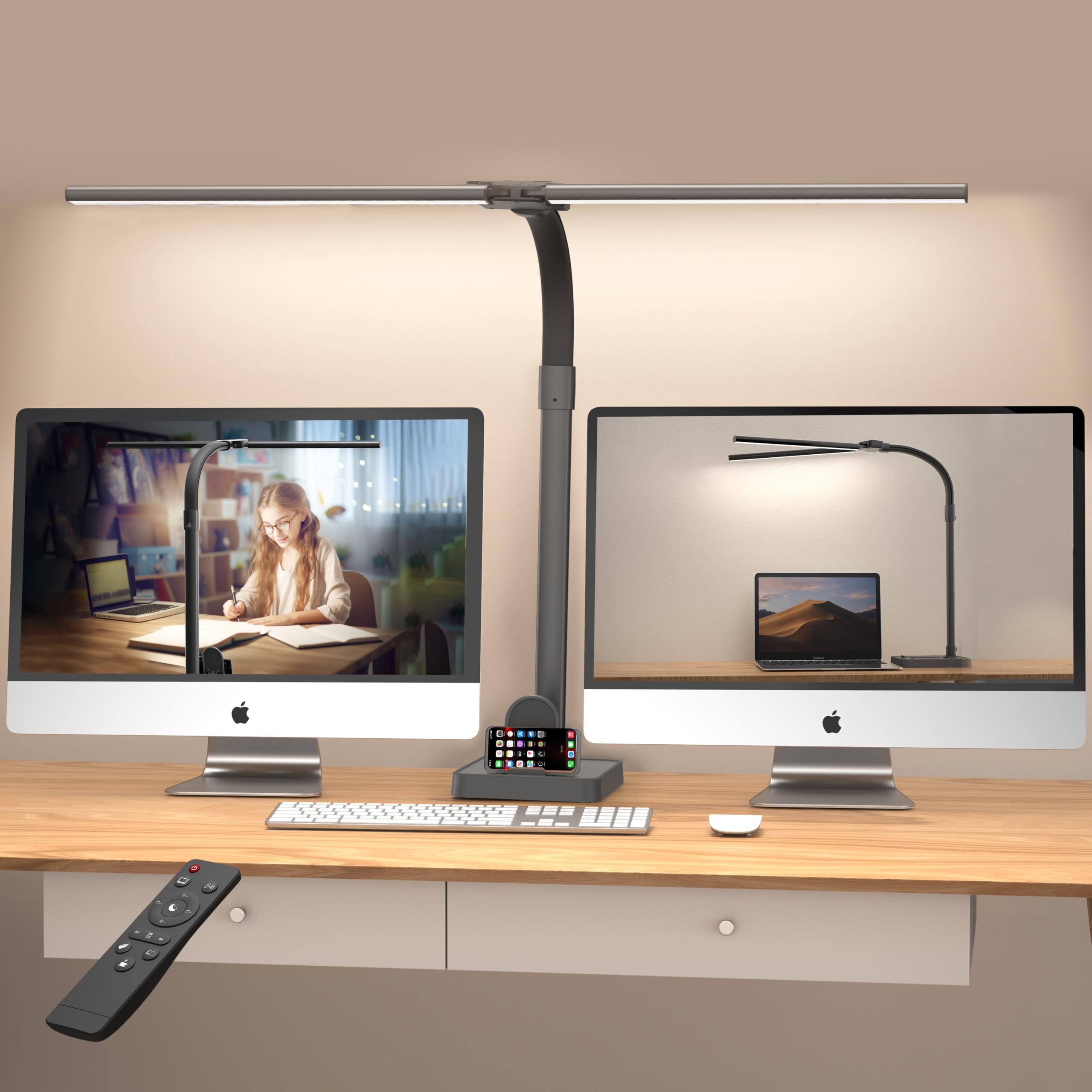 LOTTBUTY Doppelkopf Schreibtischlampe LED dimmbar,24W 80CM Homeoffice Tageslichtlampe Schreibtisch Lampe, Schwanenhals Büro Tischlampe schwarz, Augenschutz Monitorlampe,5 Farbmodi