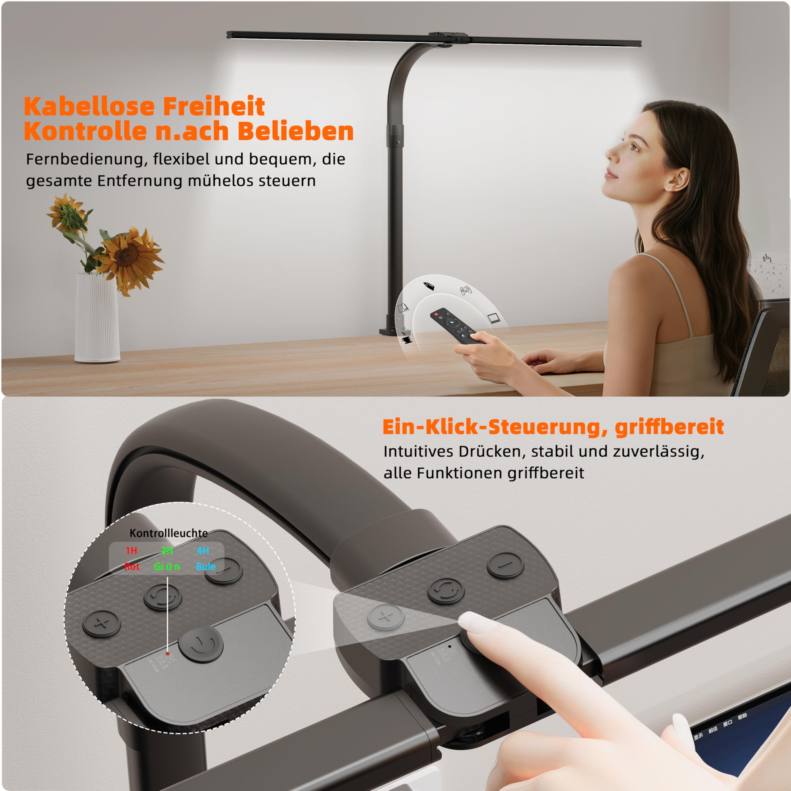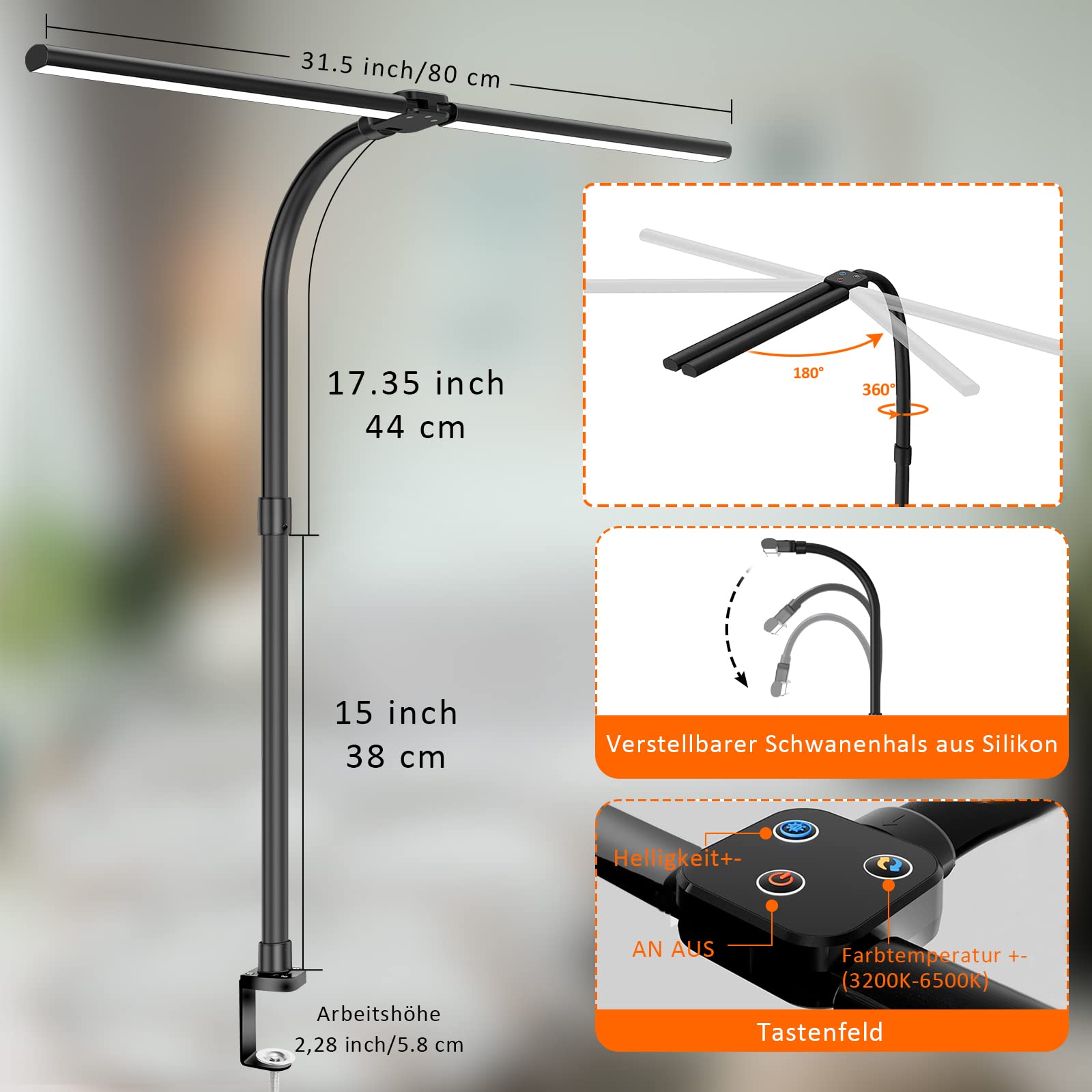LOTTBUTY Doppelkopf Schreibtischlampe LED dimmbar,24W 80CM Homeoffice Tageslichtlampe Schreibtisch Lampe, Schwanenhals Büro Tischlampe (Schwarz,Klemmbar)