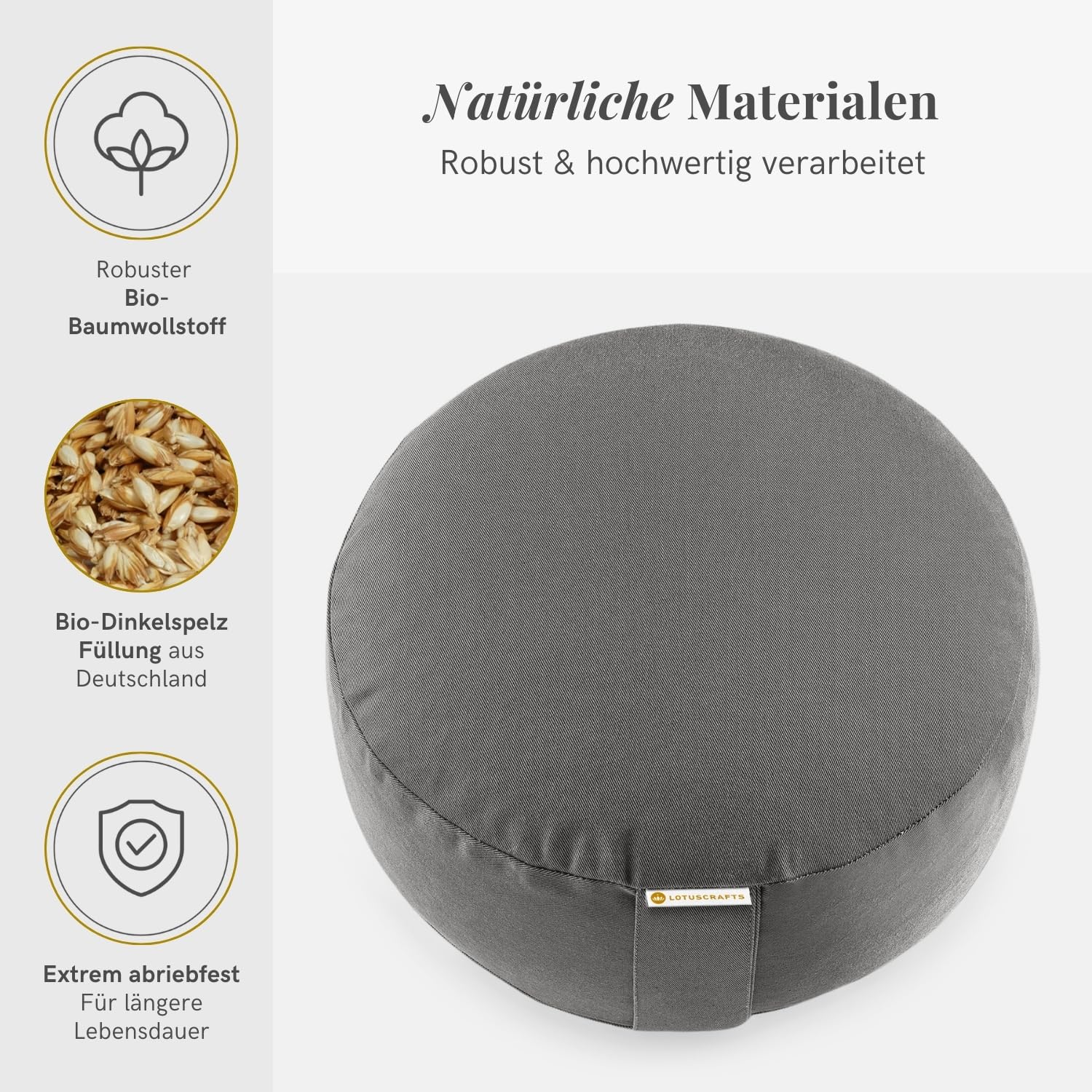 Lotuscrafts® Meditationskissen mit 15 cm Sitzhöhe, Yoga Kissen mit Dinkelfüllung, Yogakissen Rund, Bodenkissen Rund, Yogakissen Meditationskissen, Yogakissen Bezug waschbar, GOTS Zertifiziert