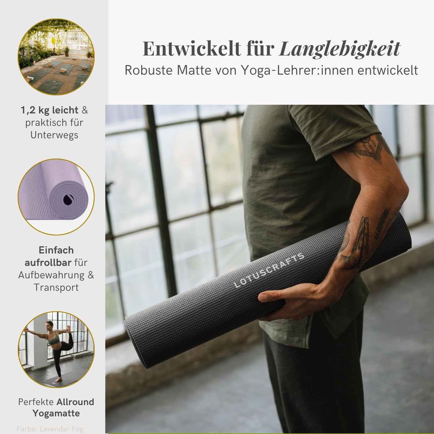 Lotuscrafts® Yoga Matte Rutschfest, 183 x 61 x 0,5 cm, Leichte Fitnessmatte auch als Gymnastikmatte, Sportmatte - Hautfreundlich & Schadstoffgeprüft