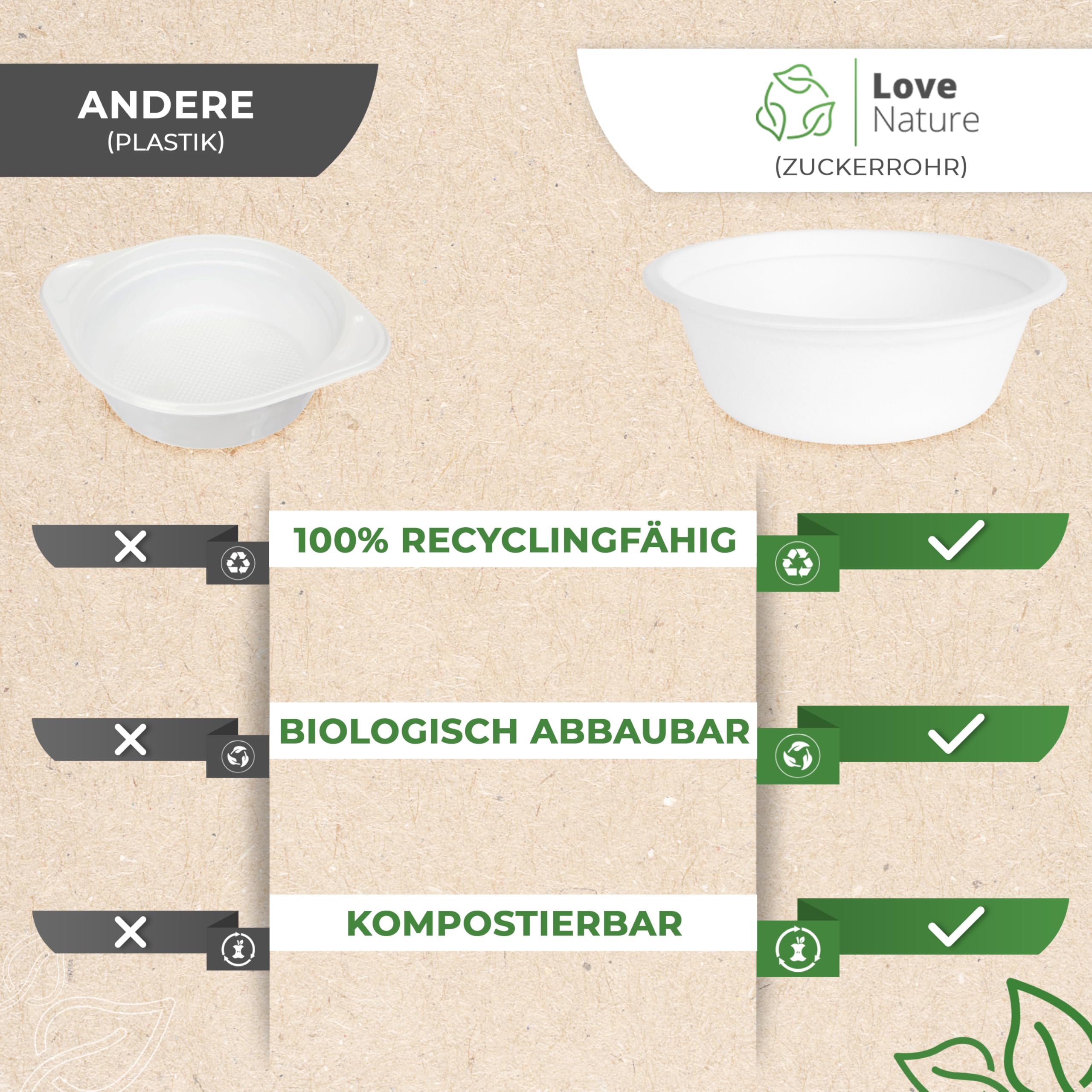Achten Sie auf die Umwelt Das Aufräumen nach einem Grillfest oder einer Party mit Freunden nimmt meist viel Zeit in Anspruch. Manche Menschen verwenden Partygeschirr aus Kunststoff, das sich nur schwer recyceln lässt. Sie enthalten viele gesundheitsgefährdende Stoffe. Papier geschirr saugt sich schnell mit Getränken oder Fetten voll und wird instabil. Ökologische Lösung All diese Probleme können mit einwegschale von Love Nature gelöst werden. Die Verwendung von Bagasse als Material macht dieses einweg schüssel guten Alternative zwischen Papier und Plastik. Der Zuckerrohrbrei erleichtert die Entsorgung, da die gebrauchten Gegenstände in die Biotonne geworfen werden können. Gesundes Essen Die Abwesenheit von Aufdrucken und das "OK compost Austria"- Zertifikat garantieren, dass Love Nature Produkte keine schädlichen Substanzen für Mensch und Umwelt enthalten. Das einweggeschirr suppenschale ist vollständig biologisch abbaubar und kann kompostiert werden. Das einwegteller suppenteller aus Zuckerrohrmark ist eine der Einwegverpackungen für Lebensmittel, die in der Mikrowelle verwendet werden können. Das bedeutet, dass Sie Ihre Mahlzeit leicht wieder aufwärmen können, ohne sie in einen anderen Behälter umfüllen zu müssen. Perfekte Passform Einmal schüssel aus Zuckerrohrschnitzeln passen perfekt zu jeder Art von Party. Sie eignen sich für Partys, Geburtstage und können dank ihrer Eigenschaften in der Gastronomie, in Restaurants oder Food Trucks eingesetzt werden. Sie können den einweg schüssel auch verwenden, um Lebensmittel für 24 Stunden im Kühlschrank aufzubewahren.