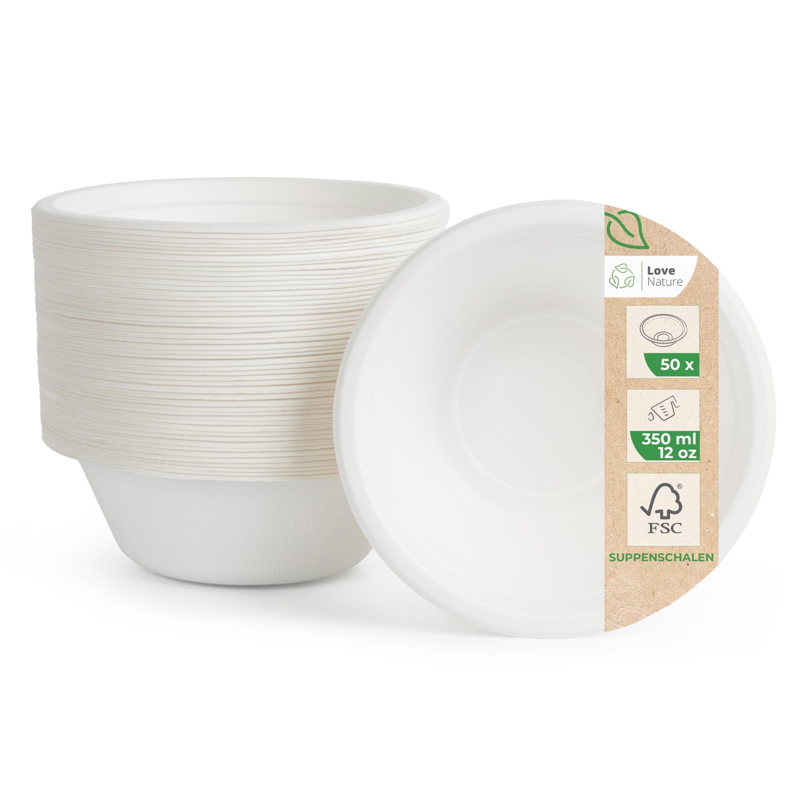 Love Nature Ökologische Einweg Suppenschalen aus Zuckerrohr Schnitzel - (350ml - 50 Stück) Suppenschüssel mit Langanhaltender Wärmespeicherung - Langlebige Suppenteller Einweg - Einwegschalen