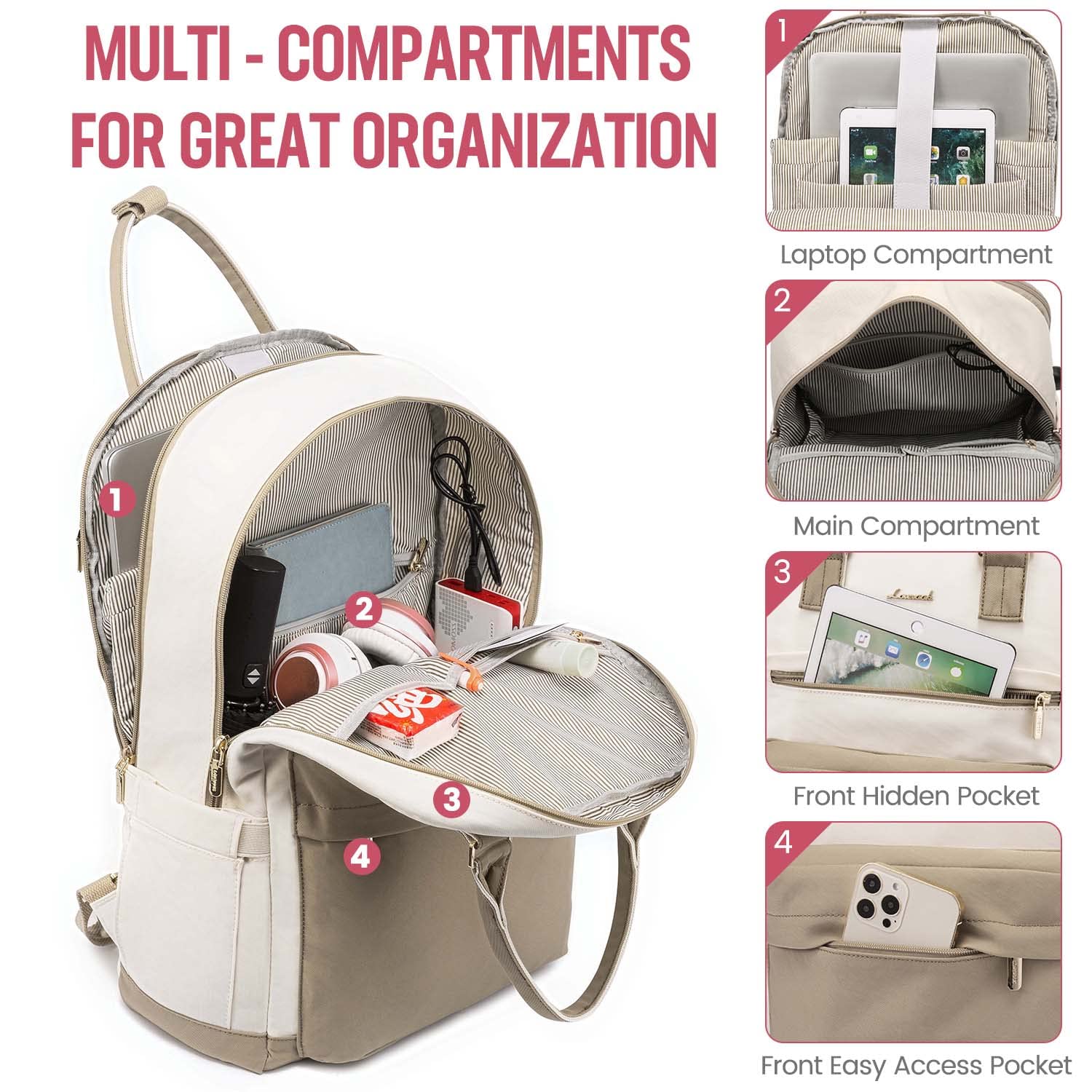 LOVEVOOK Rucksack Damen, 17 Zoll Laptop Rucksack Gross Schulrucksack Mädchen Teenager mit USB Ladeanschluss & Laptopfach, Daypacks Tagesrucksack Wasserdicht für Schule Uni Reise Arbeit, Khaki Beige