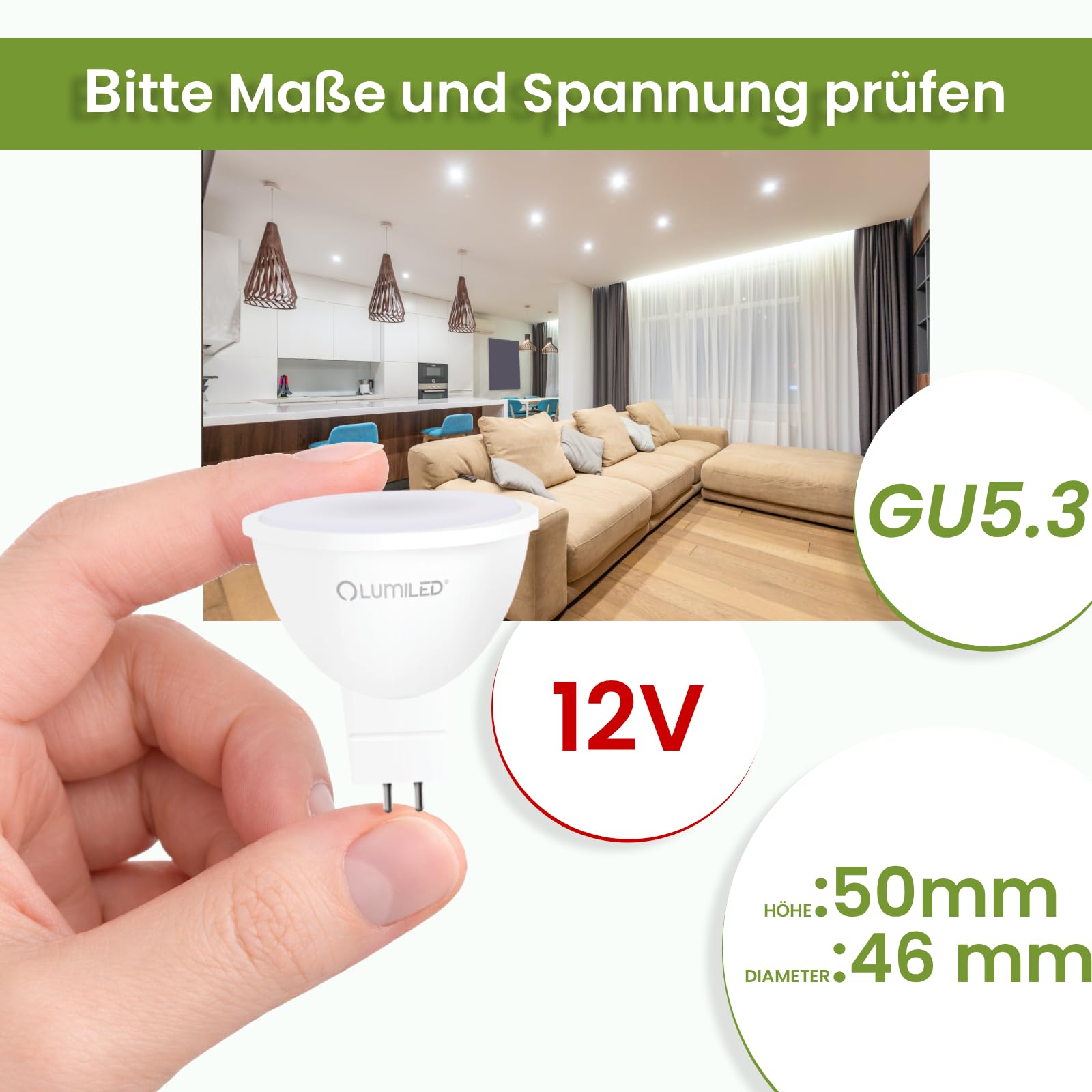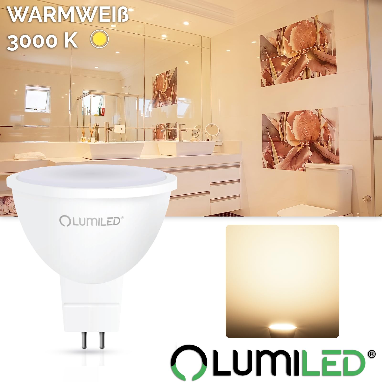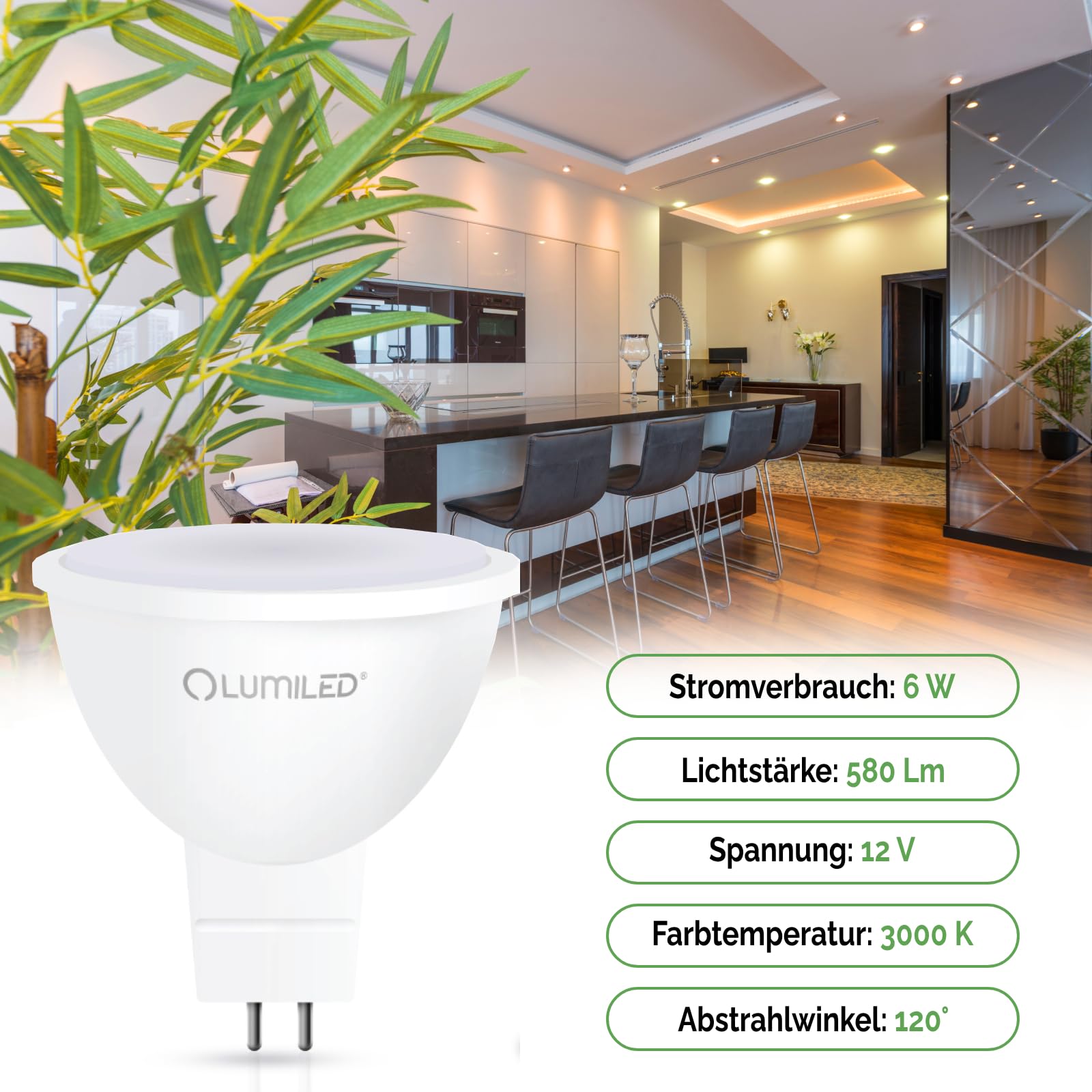 LED-Leuchtmittel GU5.3 6 WattDie LED-Lampen der renommierten Firma LUMILED mit 6 W Leistung (vergleichbar mit traditionellen Lampen mit einer Leistung von 50 W) sind ein hochwertiges LED–Leuchtmittel. Das Set besteht aus zehn Packungen mit jeweils 1 Lampe pro Packung. Der grösste Vorteil von LED–Lampen ist der um bis zu 90% geringere Stromverbrauch gegenüber Standardleuchtmitteln.Die LED Lampe kann in allen traditionellen Leuchten mit einer GU5.3 Fassung verwendet werden. Das Leuchtmittel lässt sich einfach und problemlos austauschen. Wählen Sie die Beleuchtung, die für Sie, Ihre Familie und Ihr Haus am besten ist.Technische Daten:Hersteller: LUMILEDModell: MR16Fassung: GU5.3Form: ReflektorLeuchtmittelleistung: 6 WattLichtstrom: 580 lmAbstrahlwinkel: 120°Lichtfarbe: 3000 K – WarmweissDurchschnittliche Lebensdauer: 20 000 StundenSchaltzyklen: 50 000Material: KunststoffLänge x Breite: 50 x 46 mmSpannung: 12VFarbwiedergabeindex (CRI/Ra) > 80%Anzahl der Glühbirnen pro Packung: 10 StückDas Produkt wurde aus hochwertigen Materialien hergestellt, die eine lange Lebensdauer gewährleisten. Wer bei uns kauft, erwirbt ein neues, originalverpacktes Produkt. Nur der Kauf von Markenprodukten garantiert eine hohe Qualität, Energieersparnis und einen sicheren Betrieb.