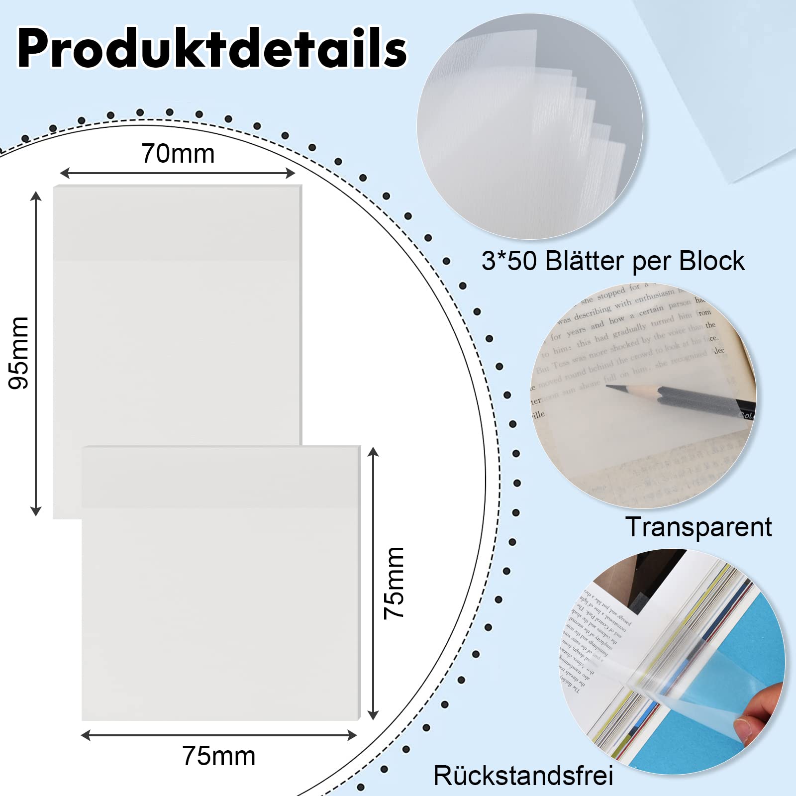 150 Blätter Transparente Haftnotizen, Wasserdichte Selbstklebendes Sticky Notes, Wiederbeschreibbare Notizzettel Tolles Büromaterial für Studenten und Mitarbeiter (100PK 7.5 * 7.5cm+50PK 9.5 * 7cm)