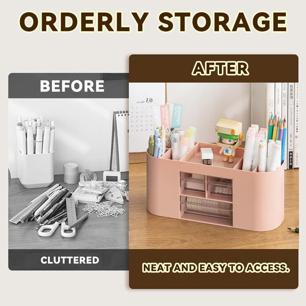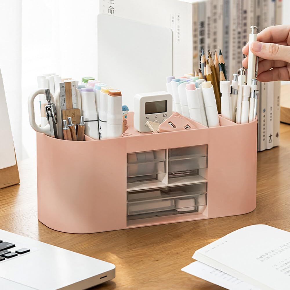 Lvjkes Stiftehalter Aufbewahrungskiste, Schreibtisch organizer 10 Fächer Grosse Kapazität, Doppelschicht transparente Schublade, Kann Bleistifte, Buntstifte, Verschiedene Schreibwaren aufnehmen (Rosa)