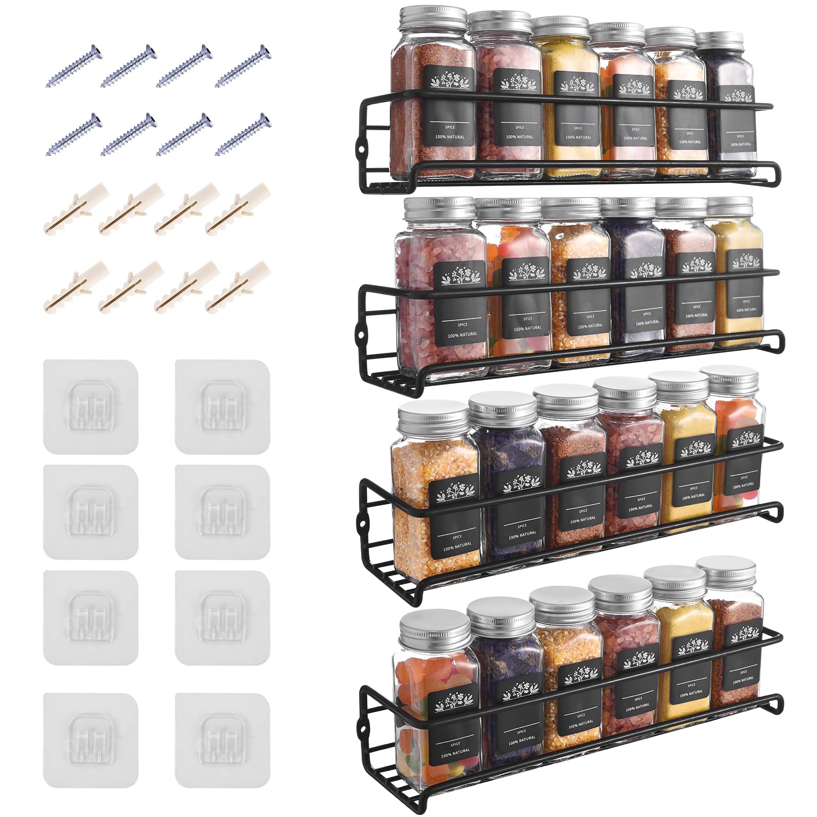 LXUDN Rocneuna 4-Teiliges Set Gewürzregal Wand Ohne Bohren, Schwarz Gewürzständer Mit Breiterem Innenschlitz Hält Grössere Gewürzgläser,29×8×6CM Benutzt als Küchenschrank Organizer Küchenregal Wand