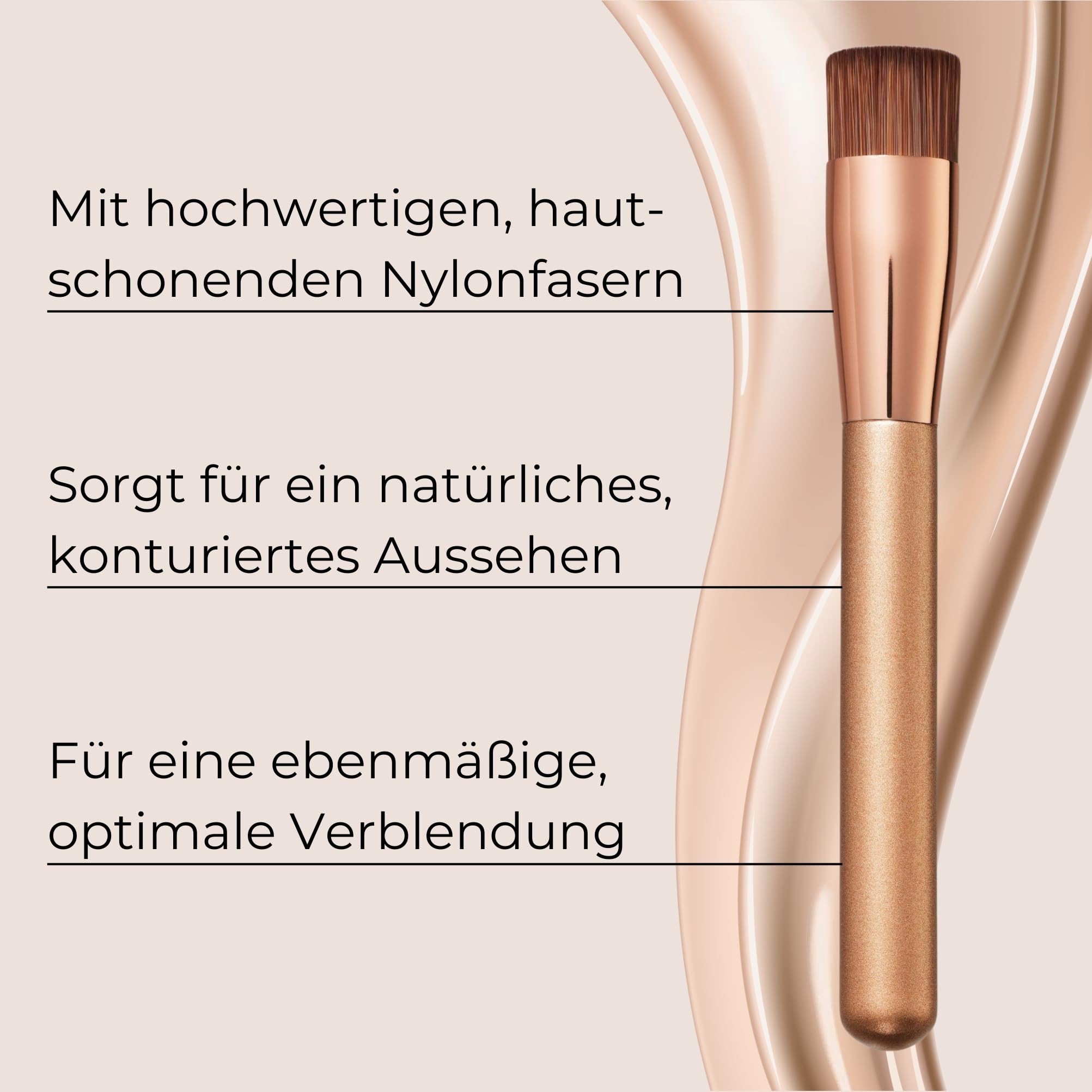 Die ultraweichen synthetischen Fasern sind besonders sanft zur Haut und eignen sich auch für empfindliche Hauttypen. Sie nehmen die optimale Produktmenge auf und geben sie kontrolliert ab, sodass sich die Deckkraft individuell aufbauen lässt – von leicht bis deckend, ohne Maskeneffekt. Im Vergleich zur Anwendung mit den Fingern sorgt der Pinsel für ein saubereres, gleichmässigeres Ergebnis und ein sichtbar verfeinertes Finish.