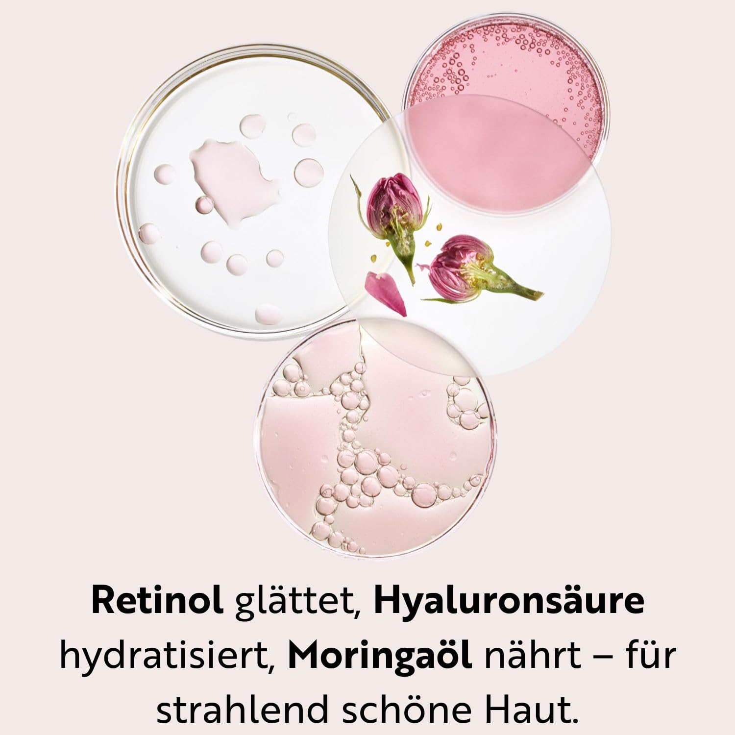 - Falten mildern: Fragmentierte Hyaluronsäure zieht schnell ein und polstert Falten von innen heraus auf.
