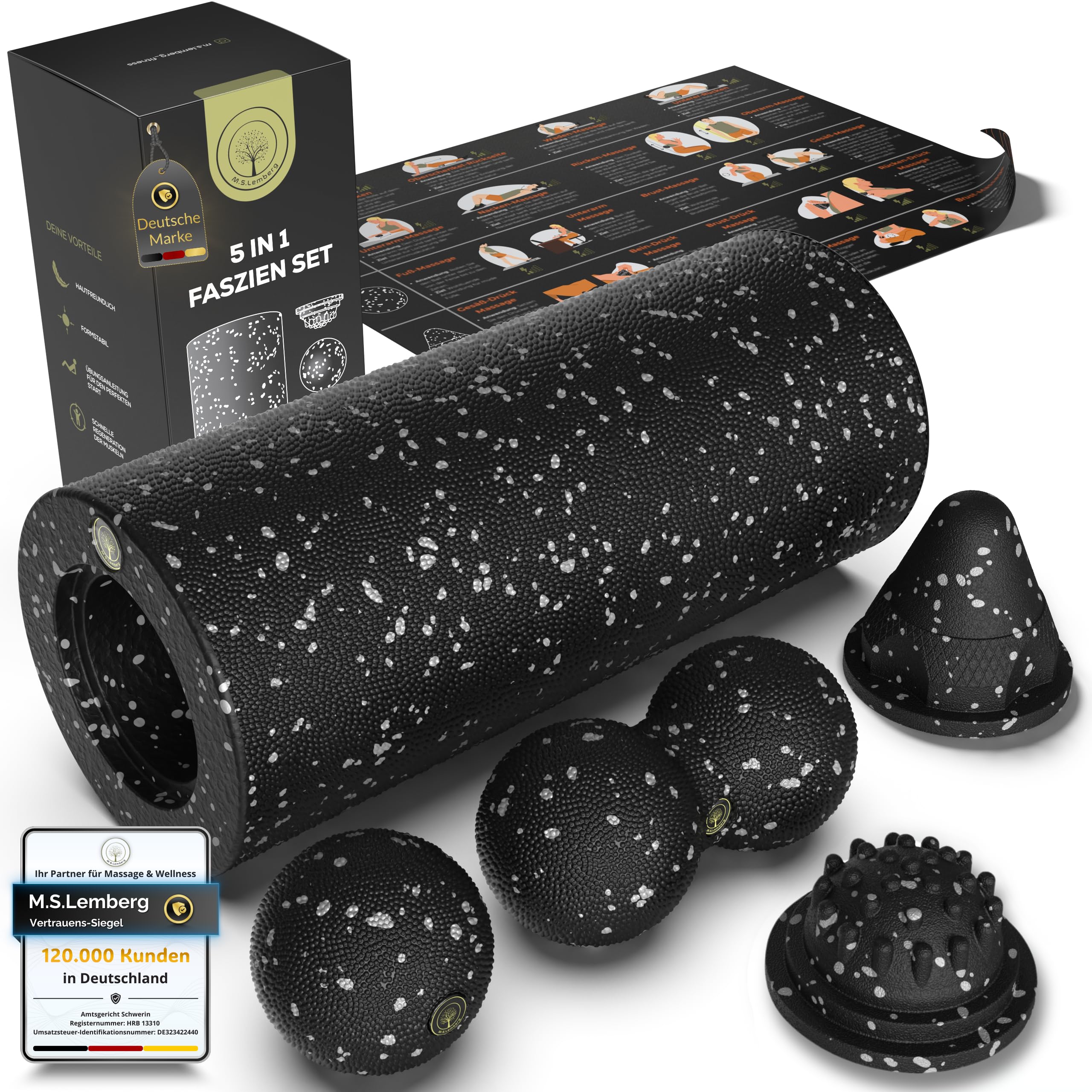 M.S.Lemberg® 5in1 Faszienrolle Set inkl. Faszienball, Duoball, Triggerpunkt Drücker, Trigger Twist, A3 Poster - Faszien Foam Roller Massage Rolle für Wirbelsäule Rücken Nacken Beine Yoga Pilates