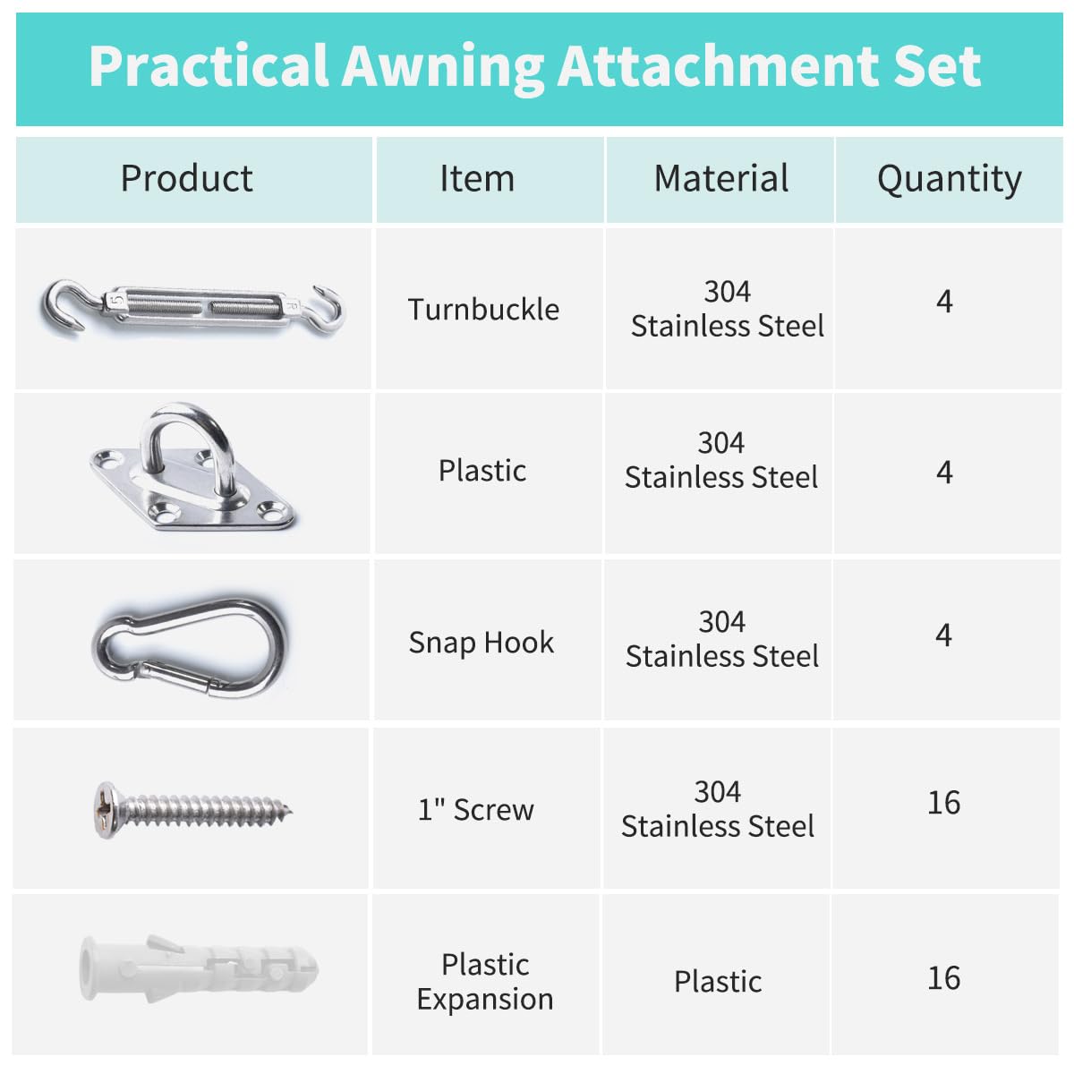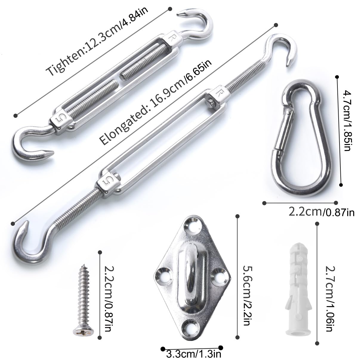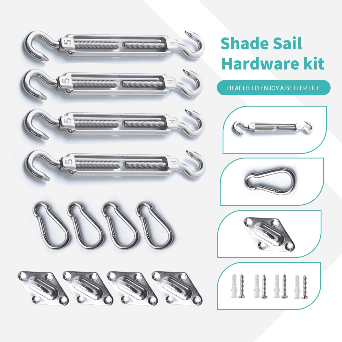 Produktbeschreibungen Paket: 4x Spannschraube, 4x Rautenförmig Wandhalterung, 4x Karabiner Details: - Material: rostfreier Edelstahl - 4er Set für viereckige Sonnensegel - Spannschraube: Spannbereich 12.3-16.9cm 【Hochwertiges Material】 Hergestellt aus hochwertiger rostfreiem 304 edelstahl, langleibig, rostfrei und mehrer sicher. 【Sicherer Befestigung】 Befestigung Zubehör Montage Aufbau Set für Rechteck Sonnensegel Installation. Mithilfe des Montagekits können Sie Ihr Sonnensegel sicher und einfach aufhängen. 【Viereck Kit】 Enthält je 4 Wandhalterungen, Karabiner und Spannschloss, welche passend für alle viereckigen Sonnensegel. 【Praktische Sonnensegel Befestigungs Set】 Speziell für Out-door Sonnensegel. Geben Sie ein perfektes Sommer.
