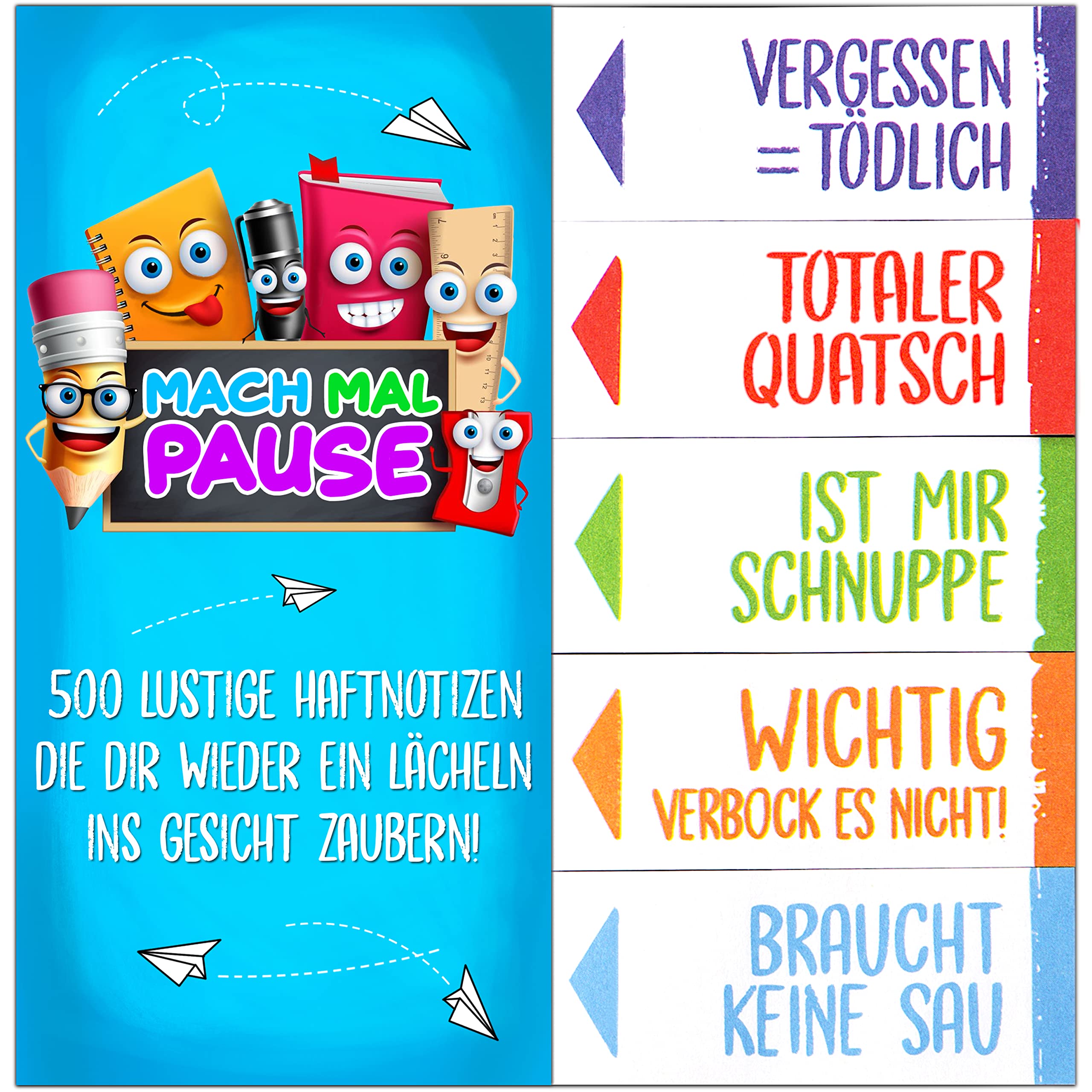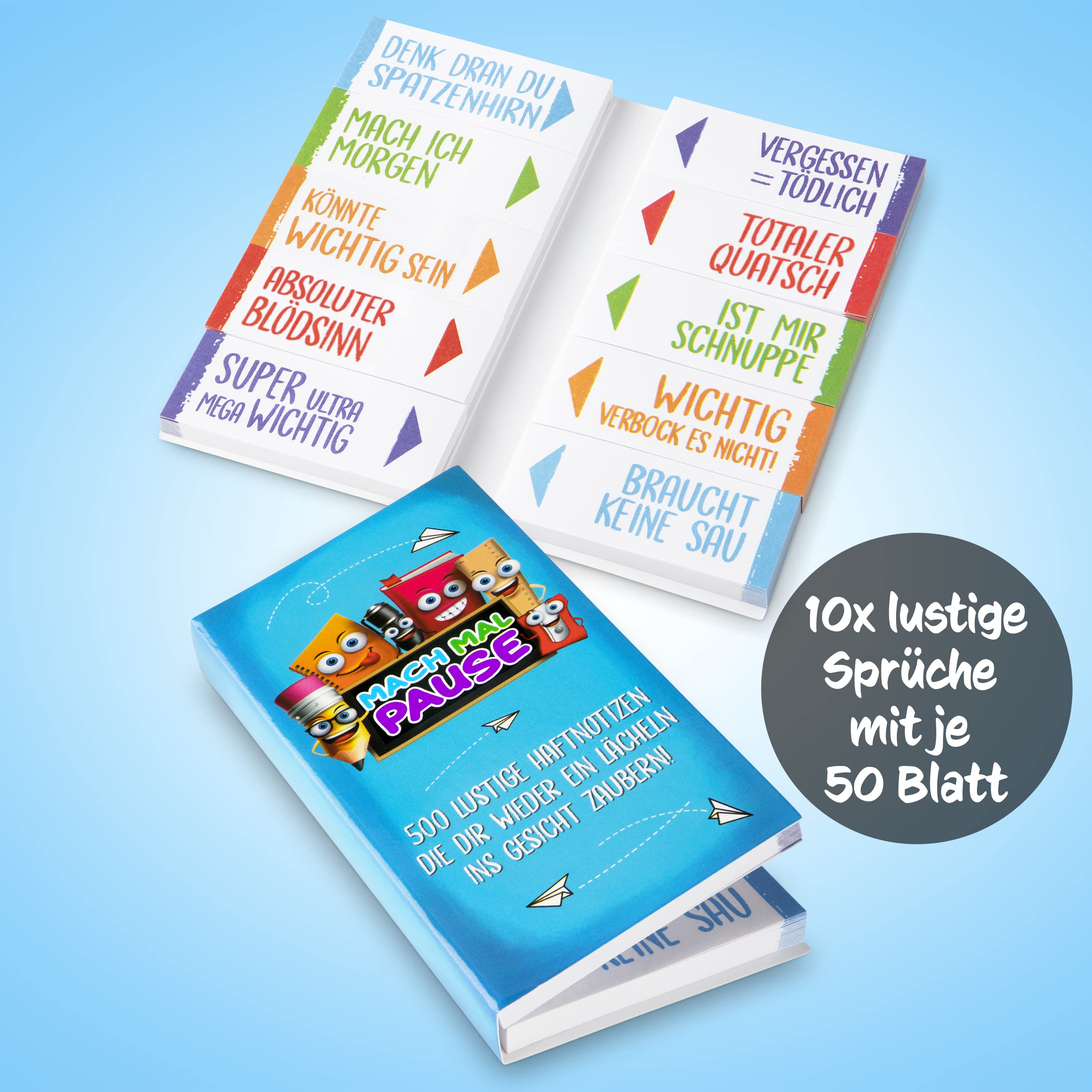 MACH MAL PAUSE® 500x Lustige Haftnotizen - die bunten Klebezettel (10x50 Blatt) sind das Geschenk für Studenten Kollegen u. Schüler - die Sticky Notes zum lernen u. markieren für Schule Uni Büro