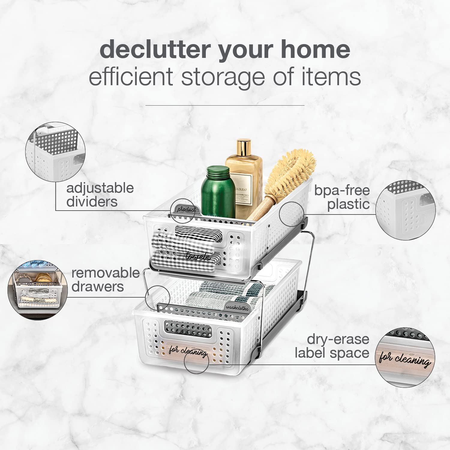 Maximize the space in your home or office with the Madesmart 2-Tier Organizer. Simple and convenient, this multipurpose organizer offers a practical storage solution to use in kitchen cabinets or pantries, under bathroom sinks, on desks, or other areas to keep your home or office space clean and organized. It's designed with two removable storage baskets that provide easy access to your essentials, and both baskets have two adjustable dividers to help you further separate your items for easy custom organization. Declutter your bathroom with under-sink organization for your soaps, makeup, brushes, and other bath products, or tidy up the tricky-to-organize items in your bedroom like electronics, toys, crafts, medicine, and beyond. It can also be used as a desk organizer for various office supplies to utilize otherwise unused vertical space or anywhere in the kitchen to store your cleaners, spices, snacks, and much more. Durable and efficient, this storage organizer is made with high-quality BPA-free plastic for years of quality use and is optimized for quick and easy assembly, and it features convenient space for dry-erase labeling on the baskets and dividers.