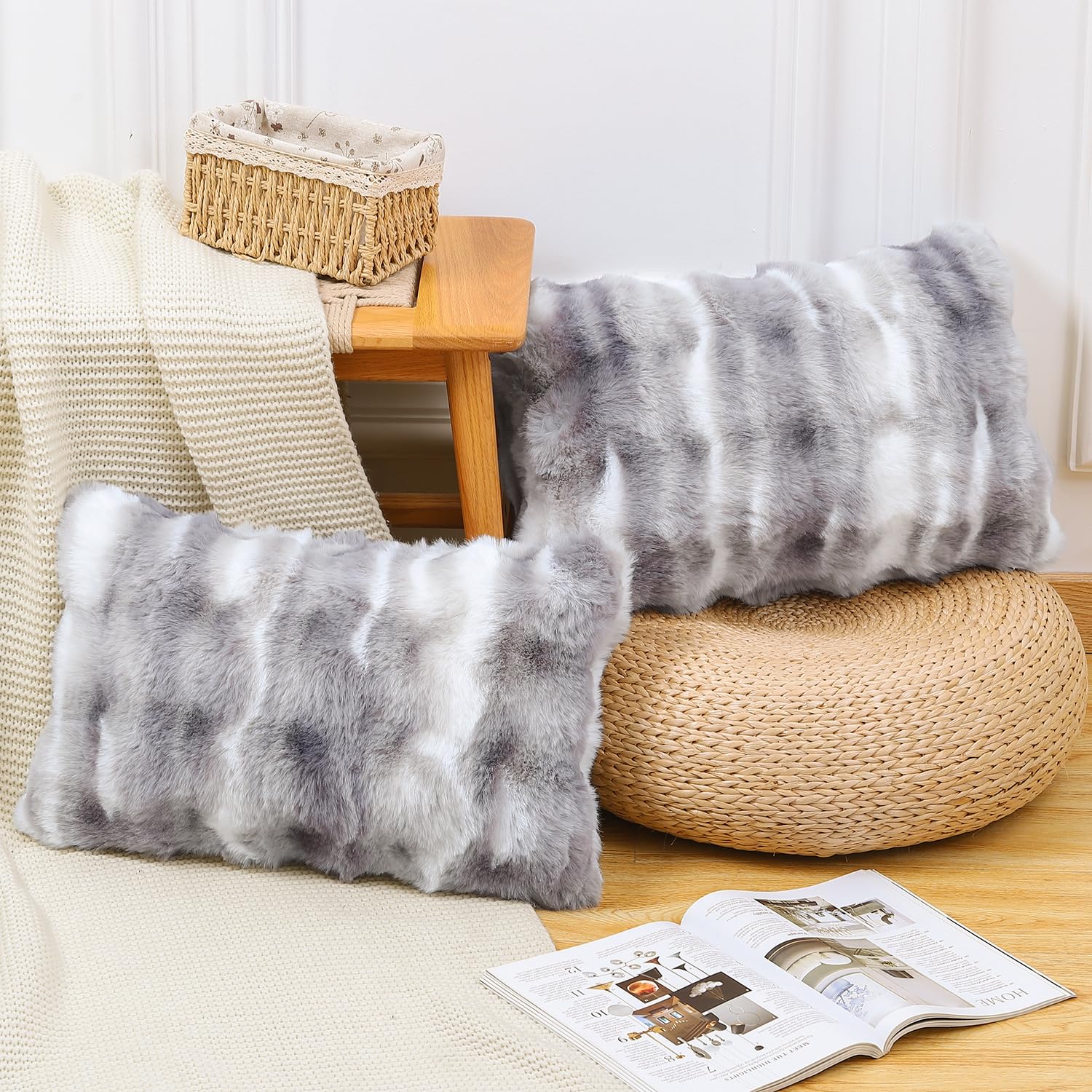 Madizz 2er Set Sanft Plüsch Kurze Wolle Samt Dekorativ Zierkissenbezüge Luxus Stil Kissenbezug für Sofa für Schlafzimmer Weiss Grau 30x50 cm