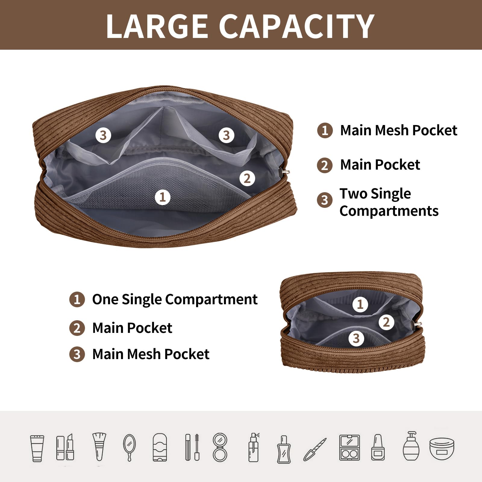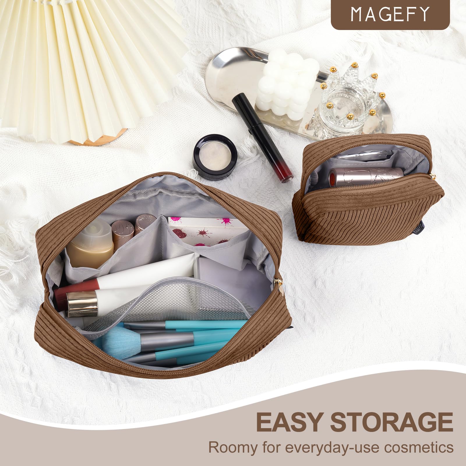MAGEFY Kosmetiktasche Kleine Make up Tasche für Handtasche, Cord Schminktasche Damen mit Fächern Reise Makeup Tasche für Frauen(Braun)