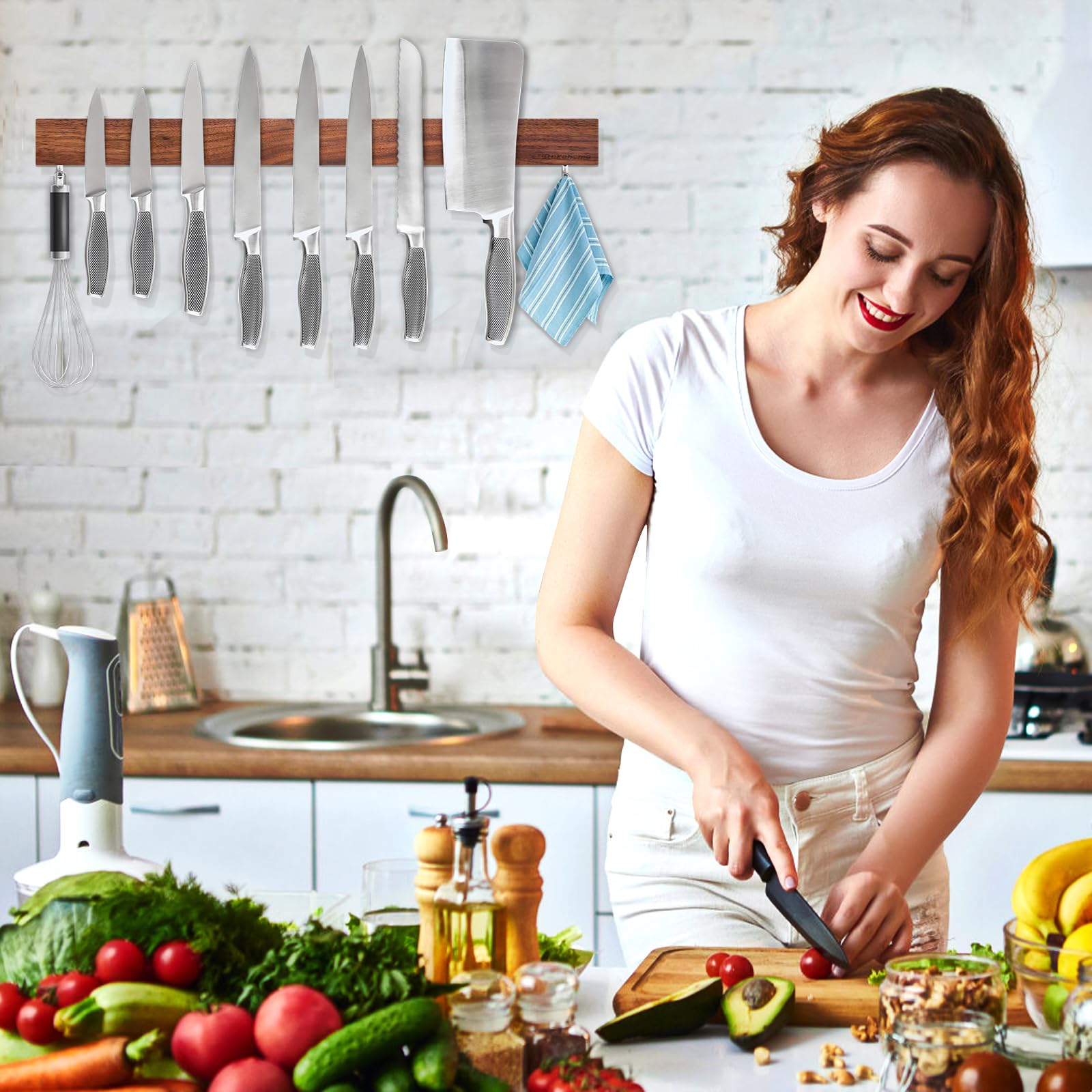 Magnetleiste Messer, 50cm Messerhalter magnetisch aus Walnussholz mit 2 Haken, Magnet Messerhalter Holz mit extra Starkem Magnet