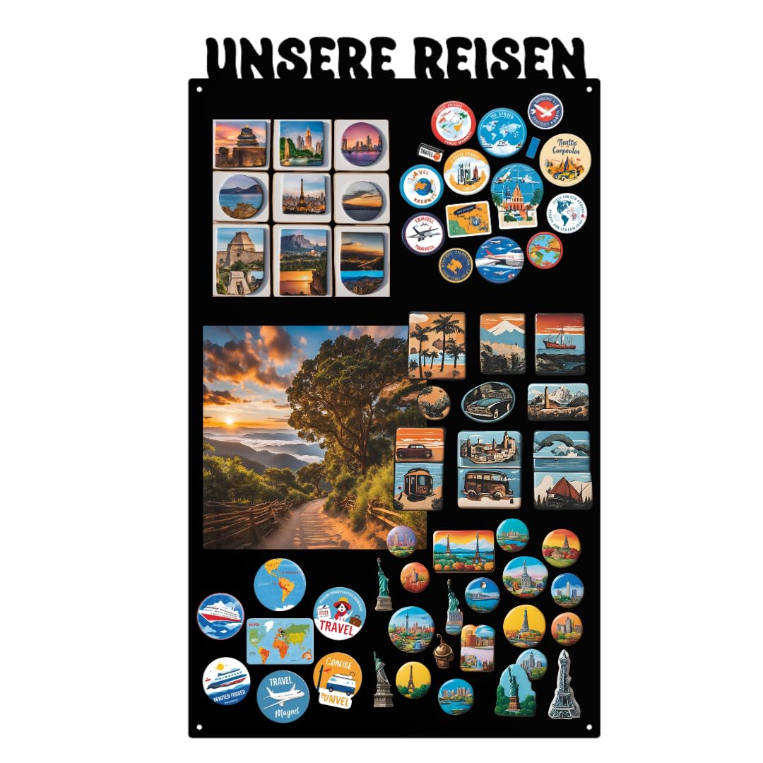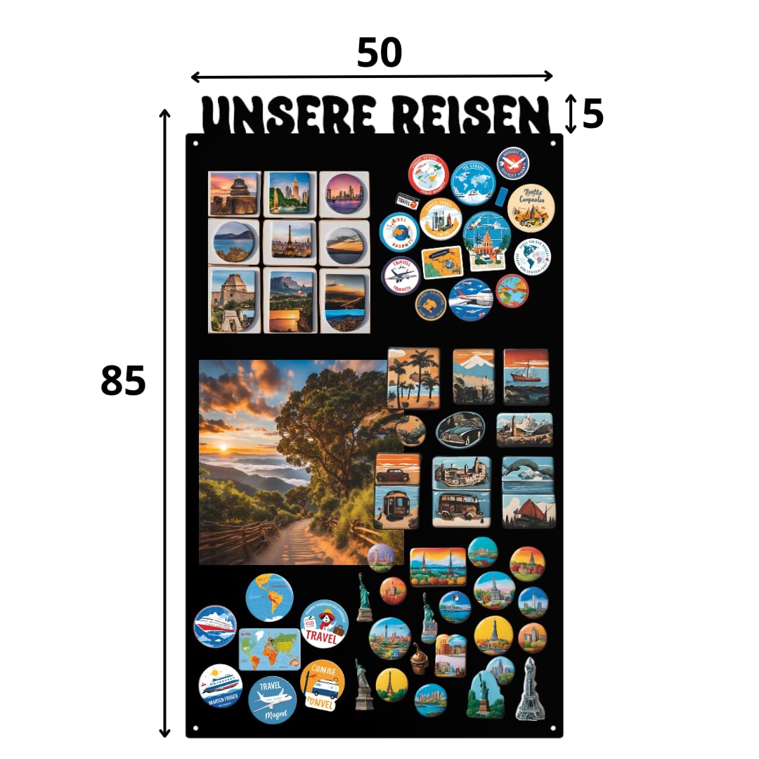 • Magnettafel „Unsere Reisen” – der perfekte Ort für Reiseerinnerungen – Stilvolle Magnettafel mit ausgeschnittenem Schriftzug „Unsere Reisen“. Ideal zur Präsentation von Fotos, Magneten und Souvenirs. Durch das besondere Design entsteht eine persönliche Reisekollage, die jedem Raum eine dekorative Note verleiht