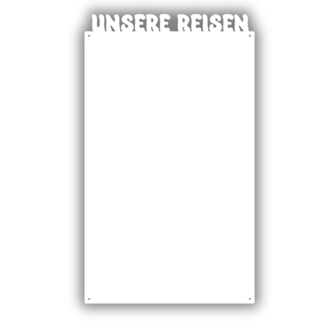 Magnettafel „Unsere Reisen” – der perfekte Ort für Reiseerinnerungen – Stilvolle Magnettafel mit ausgeschnittenem Schriftzug „Unsere Reisen“. Ideal zur Präsentation von Fotos, Magneten und Souvenirs. Durch das besondere Design entsteht eine persönliche Reisekollage, die jedem Raum eine dekorative Note verleihtBeschreibbar mit Kreidemarkern – Die Magnettafel eignet sich nicht nur für Magnete, sondern auch zum Schreiben mit Kreidemarkern. Perfekt als Planer im Büro oder Notiztafel zu Hause. Geschriebene Texte lassen sich einfach mit einem feuchten Tuch entfernenEinfache Wandmontage – Die Tafel kann mit den mitgelieferten Schrauben stabil an Beton, Ziegel oder Gipskarton befestigt werden. Selbstklebende Abdeckkappen sorgen für eine dezente Optik und ein elegantes ErscheinungsbildRobuste und langlebige Konstruktion – Hergestellt aus 1 mm starkem Stahlblech für hohe Widerstandsfähigkeit. Die pulverbeschichtete Oberfläche schützt vor Kratzern und Abnutzung und bleibt dauerhaft formstabil