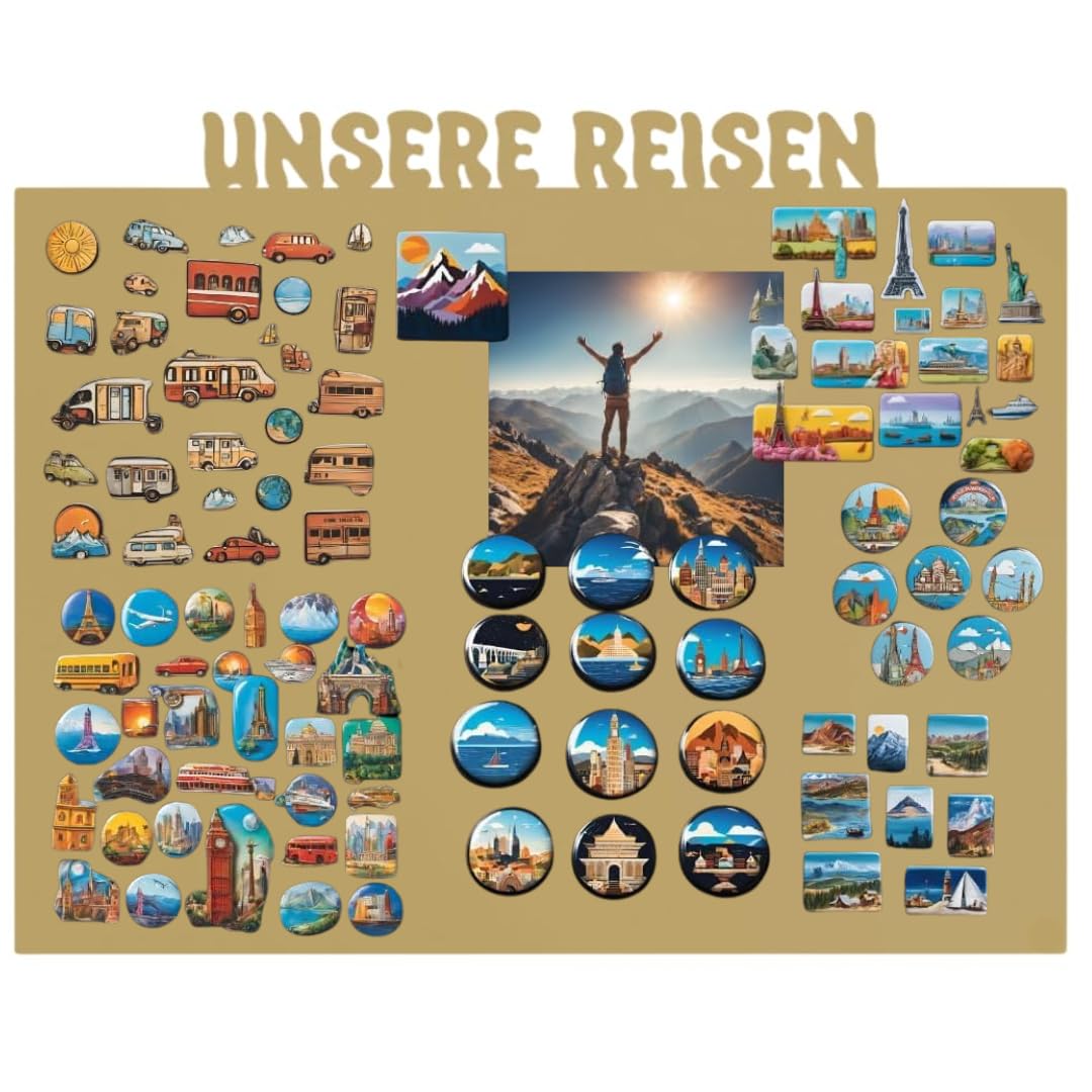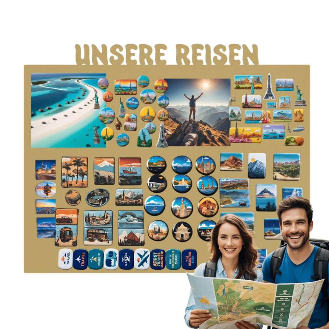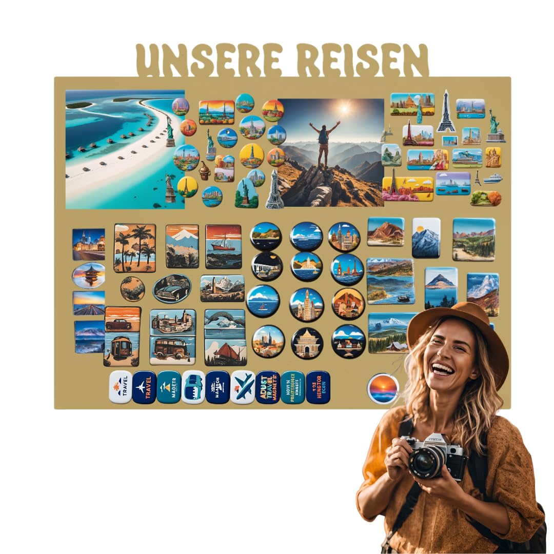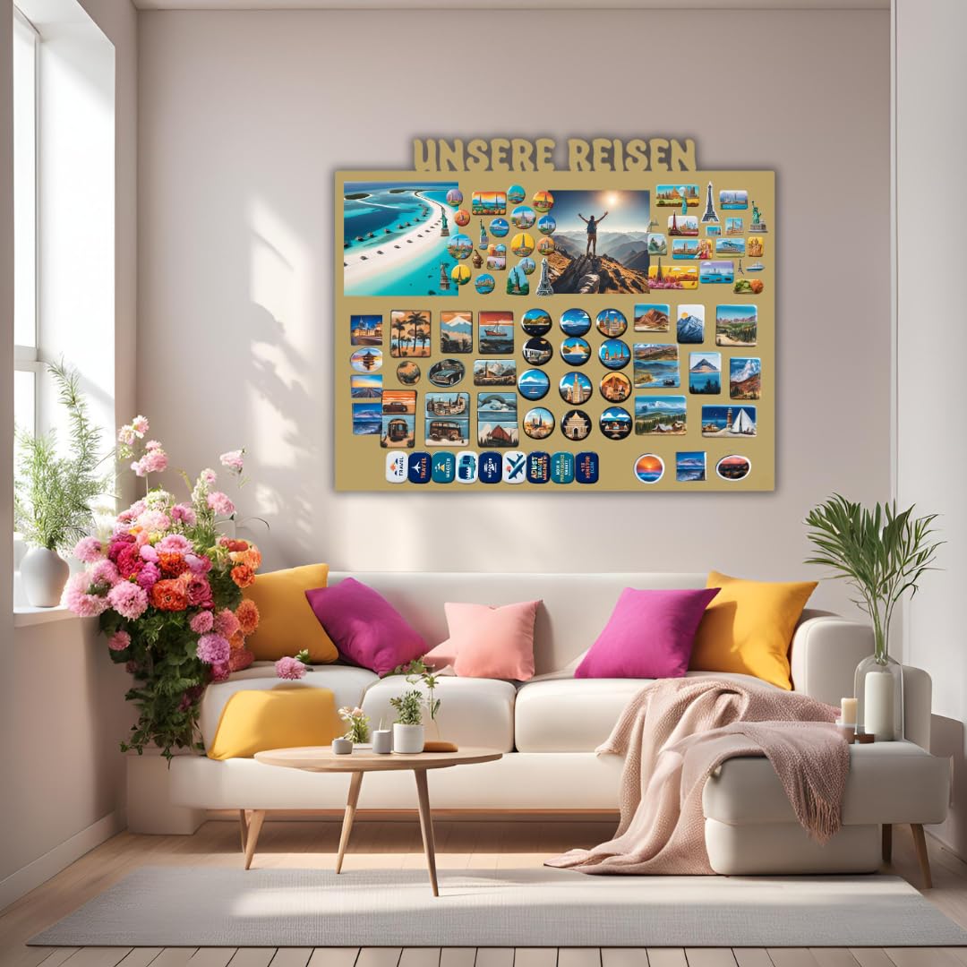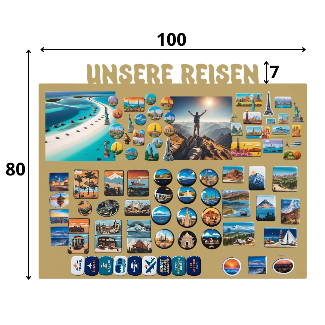 Anwicar Magnettafel Unsere Reisen - Rahmen 100 x 80 cm magnetische Pinnwand aus Stahl - ideal für Reise - Magnete und Erinnerungen - beschreibbare Magnettafel - inkl. Montageset - Gold