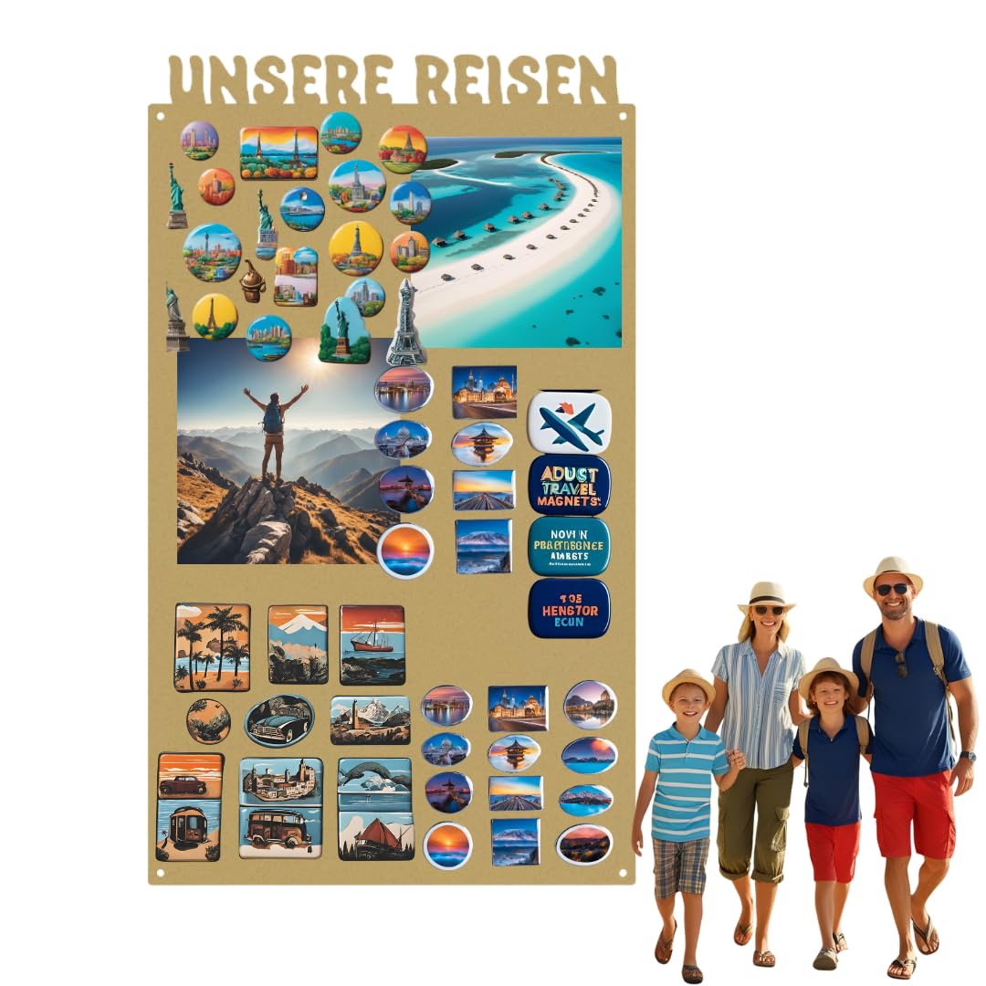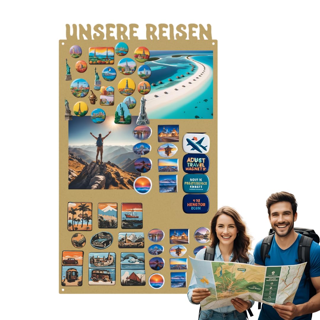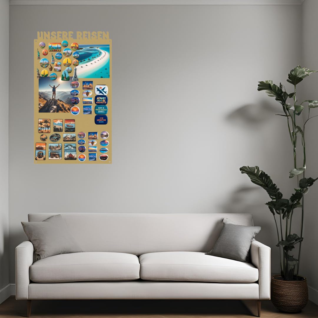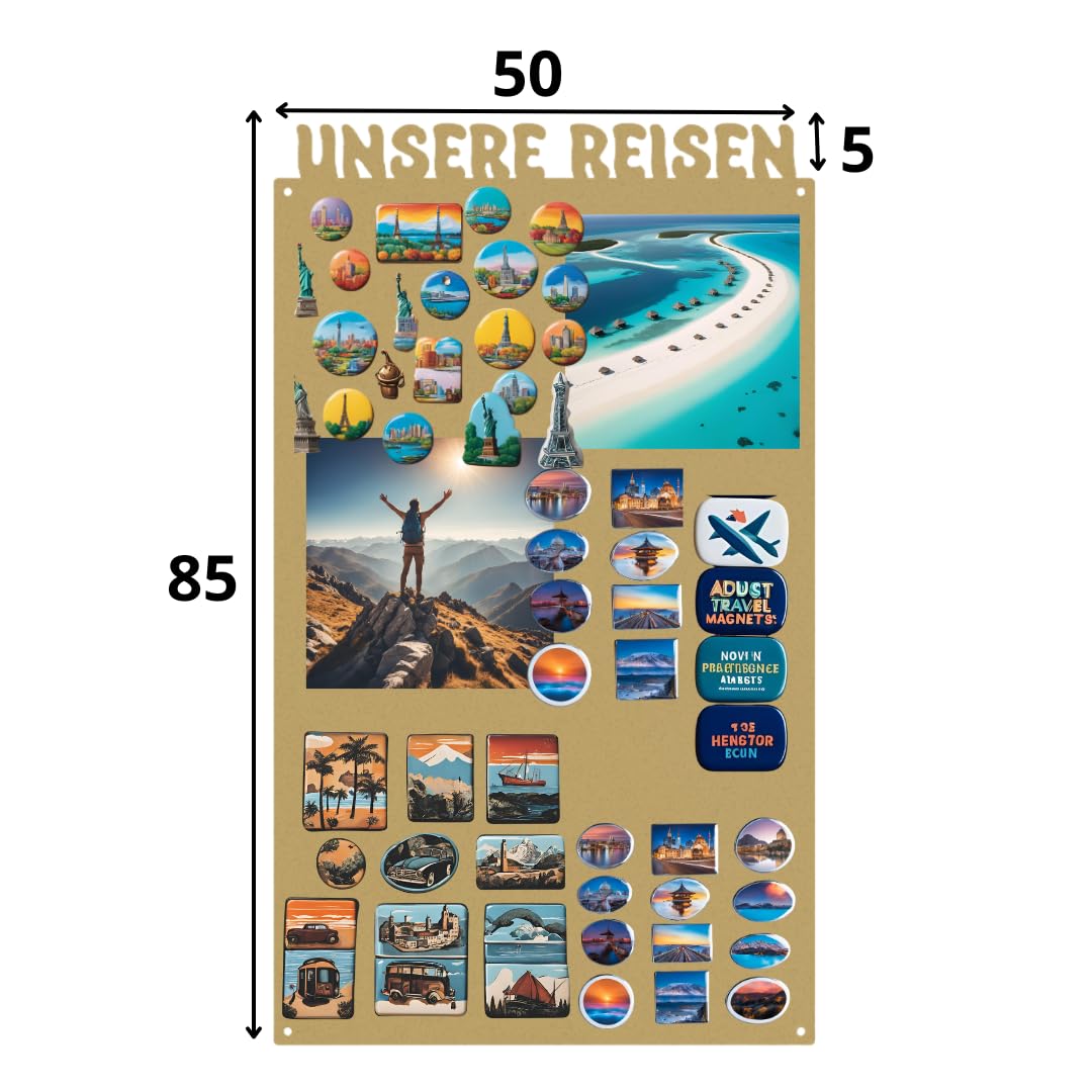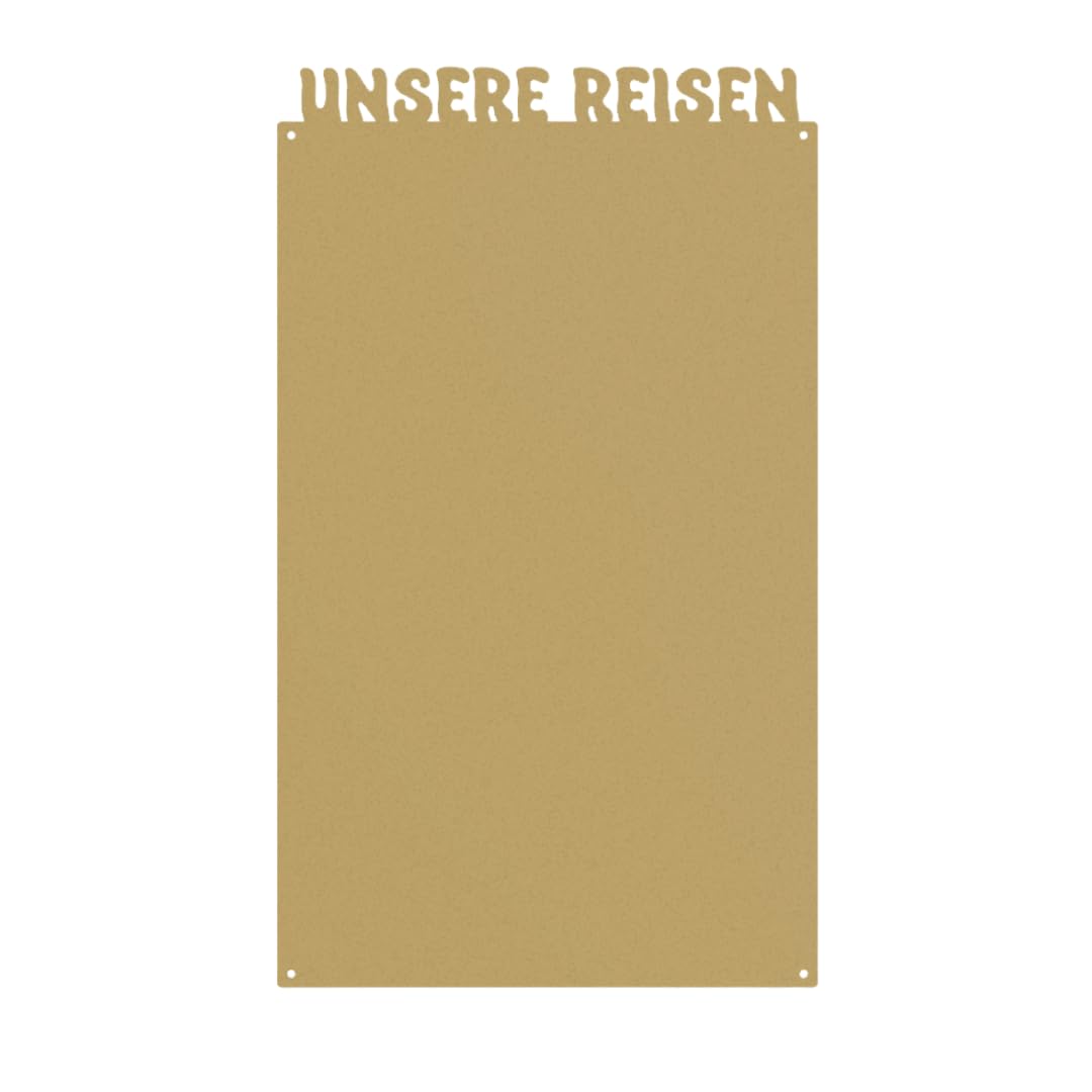 Anwicar Magnettafel Unsere Reisen - Rahmen 85 x 50 cm magnetische Pinnwand aus Stahl - ideal für Reise - Magnete und Erinnerungen - beschreibbare Magnettafel - inkl. Montageset - Gold