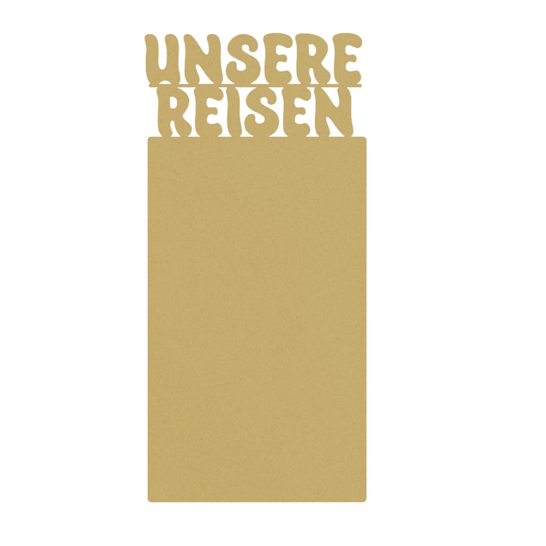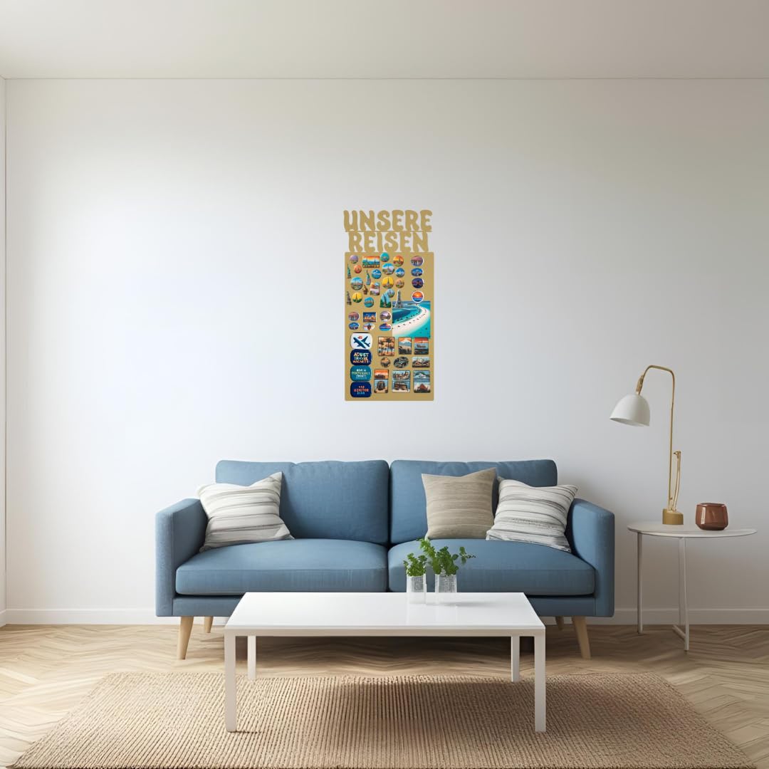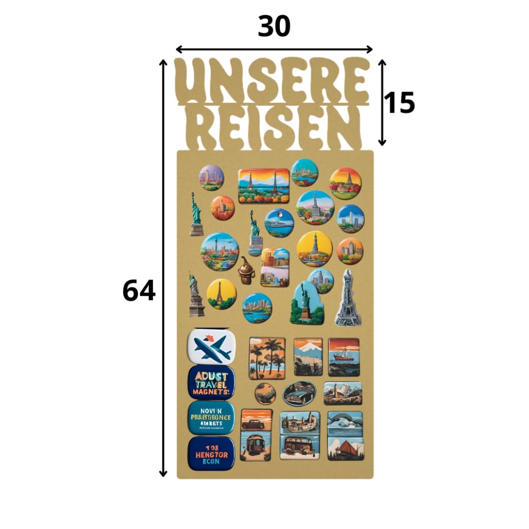 Anwicar Magnettafel Unsere Reisen - Rahmen 64 x 30 cm magnetische Pinnwand aus Stahl - ideal für Reise - Magnete und Erinnerungen - beschreibbare Magnettafel - inkl. Montageset - Gold