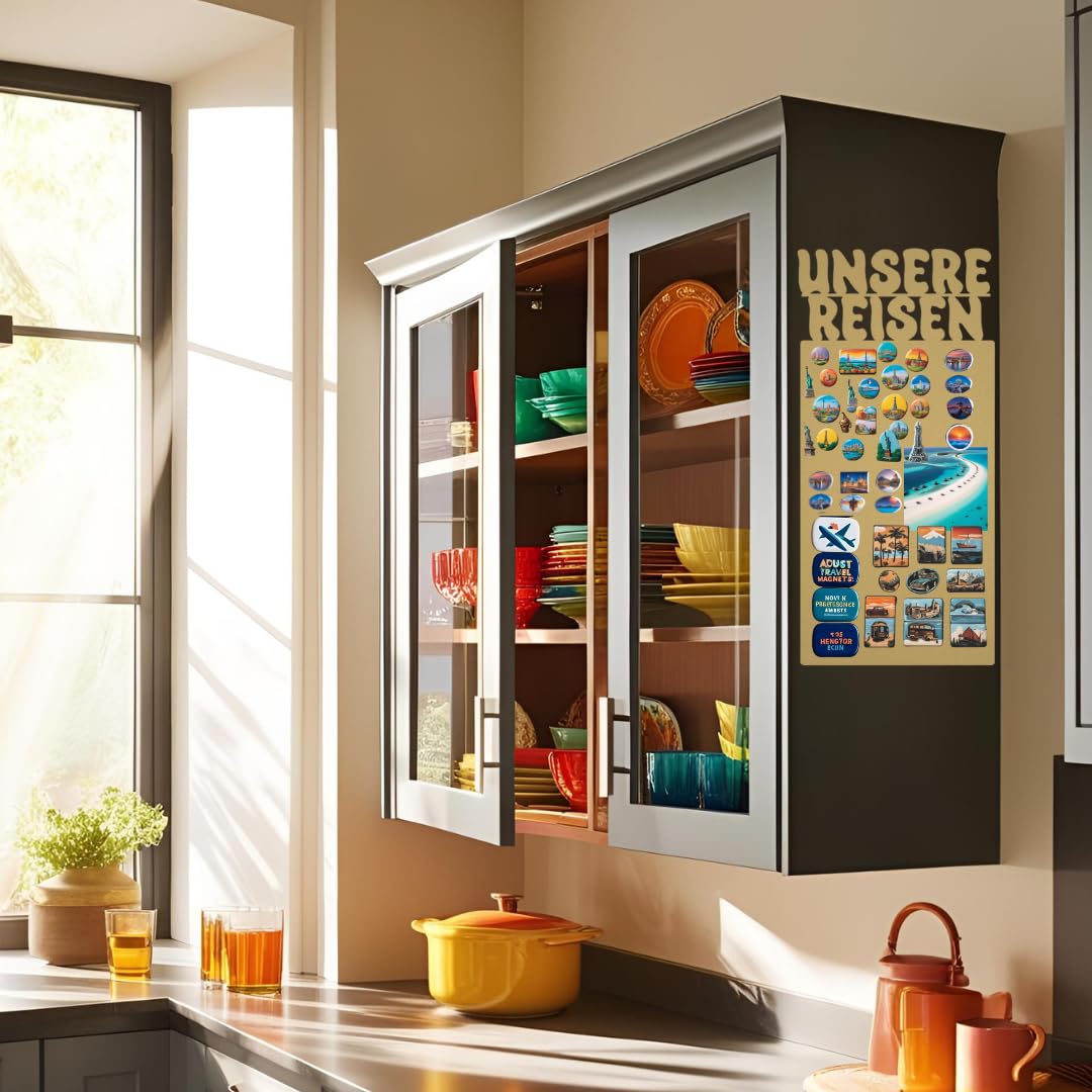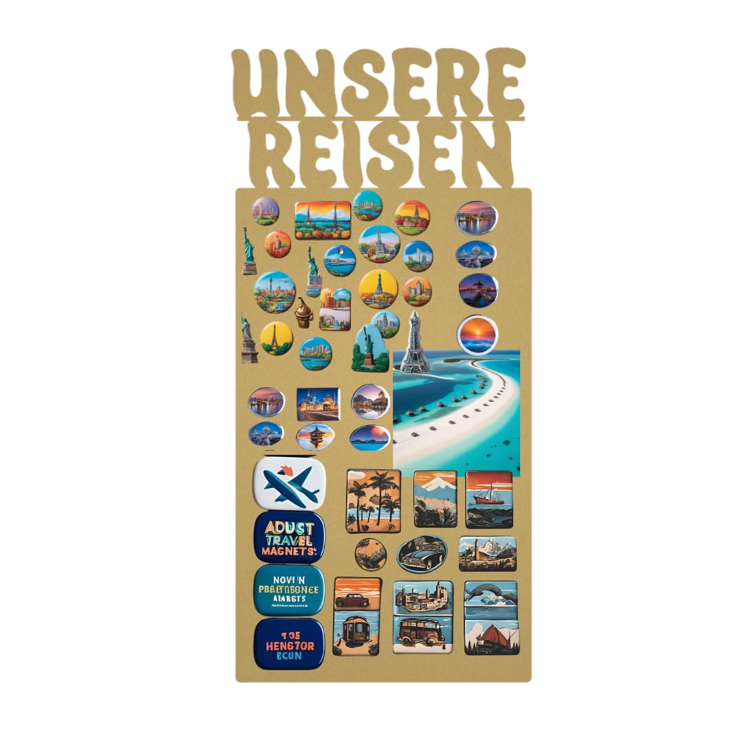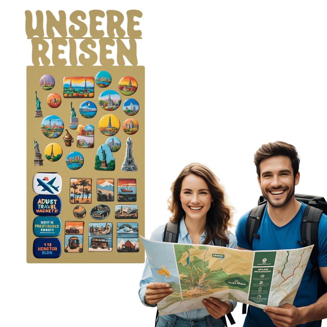 Anwicar Magnettafel Unsere Reisen - Rahmen 64 x 30 cm magnetische Pinnwand aus Stahl - ideal für Reise - Magnete und Erinnerungen - beschreibbare Magnettafel - inkl. Montageset - Gold