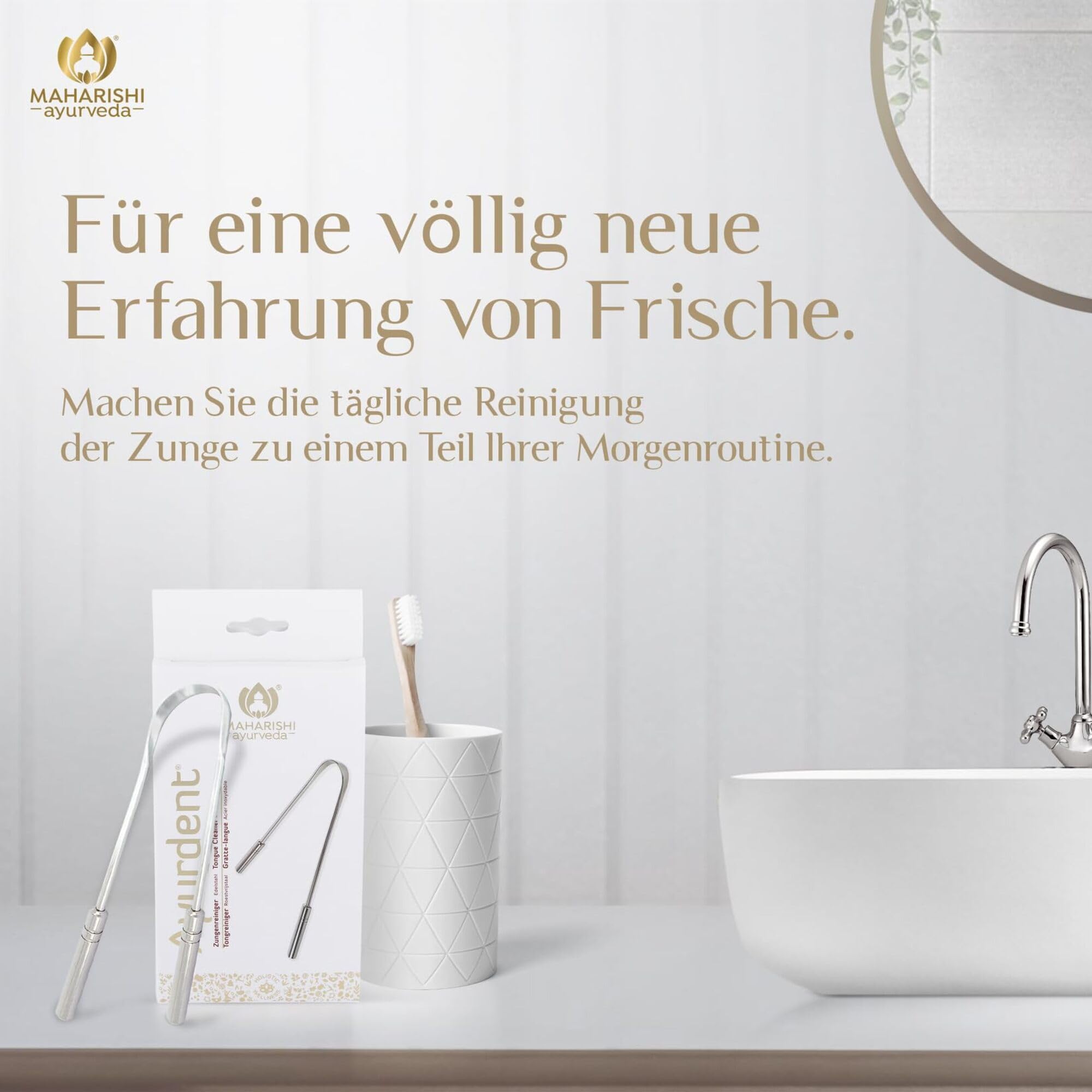 Ob beim Sprechen, Schmecken oder bei der Verdauung: Unsere feinsinnige Zunge ist ein wertvolles Werkzeug. Grund genug, ihr mehr Aufmerksamkeit zu schenken. Unser Zungenreiniger aus rostfreiem Edelstahl für eine effektive Zungenreinigung. Unterstützung bekommt das Reinigen der Zunge selbst von der Spitze der amerikanischen Zahnärztekammer: ""Ich glaube wirklich, wir heben die Mundhygiene damit auf eine höhere Stufe"", so der Sprecher des Zahnärzteverbandes und Professor für Zahnmedizin in Boston, Richard Price. Gebrauchsanweisung: Für eine effektive Zungenreinigung einfach den Reiniger 3-4 mal von hinten nach vorn über die Zunge ziehen. So können Toxine und Bakterien nicht zurück in Ihren Körper gelangen. Jahrtausendealte Tradition: 1. Die Reinigung der Zunge reduziert faulige Gase und schlechten Atem zu etwa 75 %. 2. Das individuelle Kariesrisiko reduzieren und die Zahngesundheit stärken 3. Schlüsselrolle bei der Bekämpfung von Mundgeruch. Eine völlig neue Erfahrung von Frische: Machen Sie die tägliche Reinigung der Zunge zu einem Teil der ayurvedischen Morgenroutine - mit unserem Zungenreiniger aus Edelstahl.