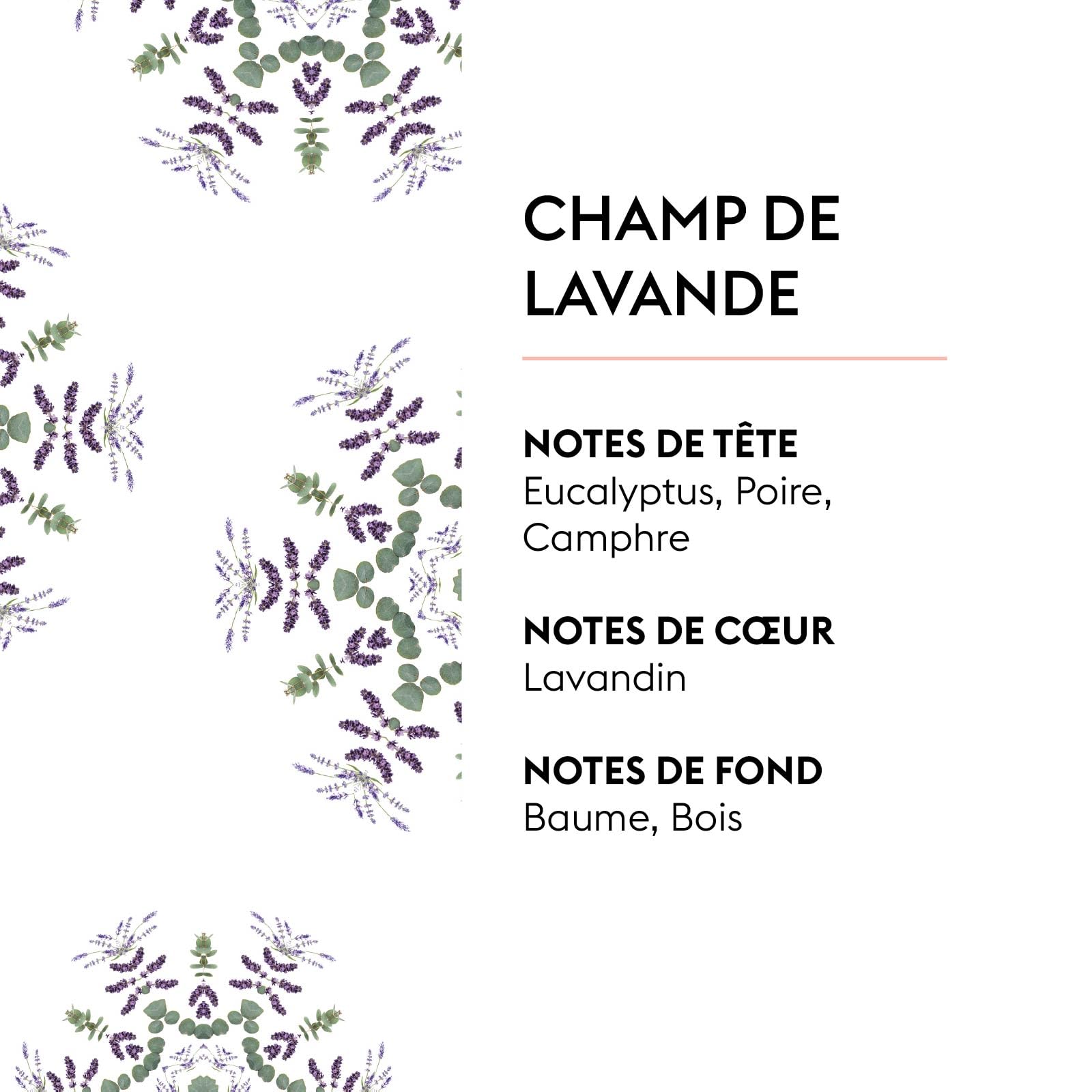 Ein blumiger Duft mit frischen Lavendelnoten, gemischt mit einem leichten Kampfer, um eine belebende und anregende Wirkung zu erzielen. Zusammensetzung: Duftstoffe, Aqua, Isopropylalkohol.