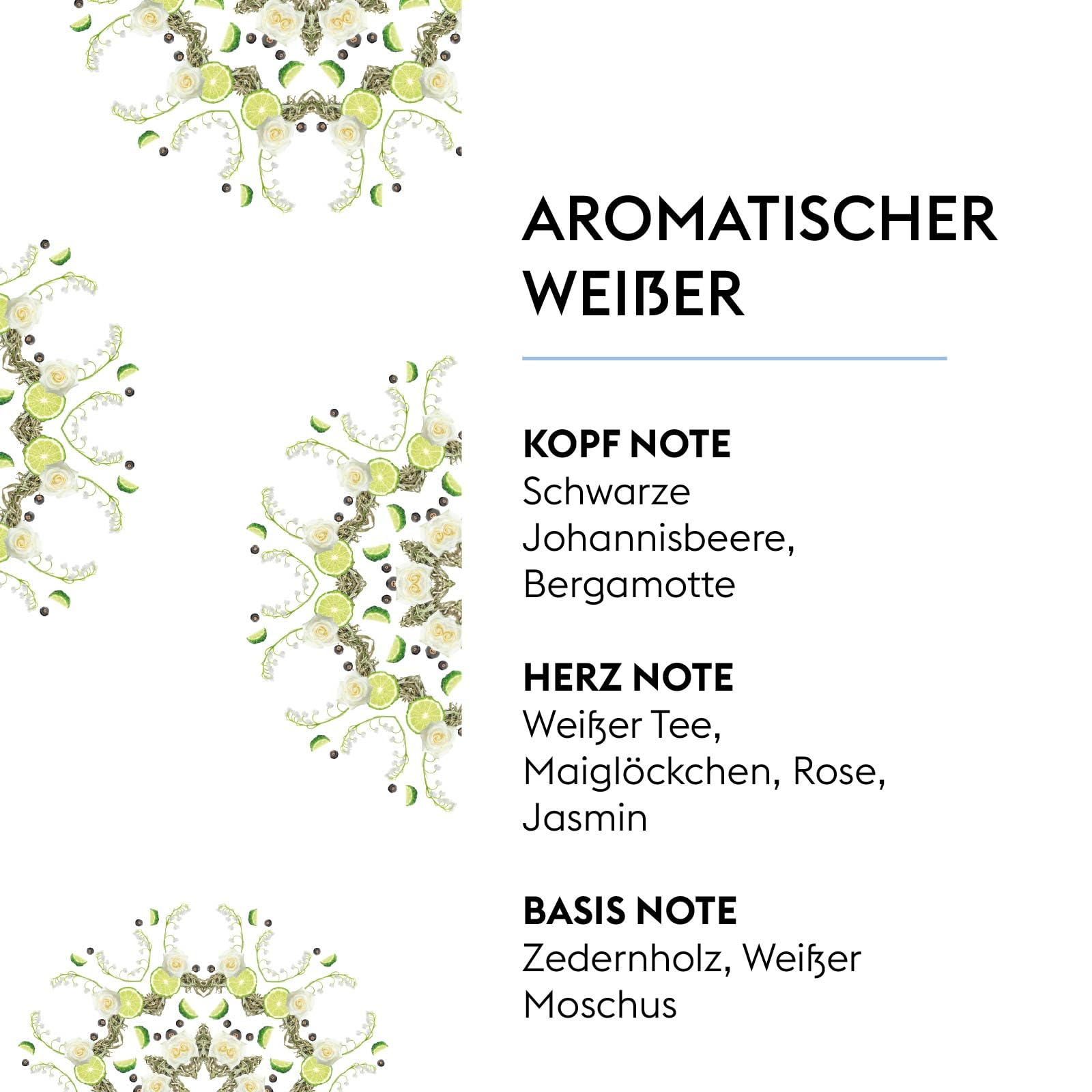 • Frische Tee-Blüten-Duftsignatur – Die lebendige Kopfnote aus schwarzer Johannisbeere und Bergamotte sorgt für einen klaren, belebenden Auftakt, während weisser Tee, Maiglöckchen, Rose und Jasmin ein elegantes, ausgewogenes Herz bilden.