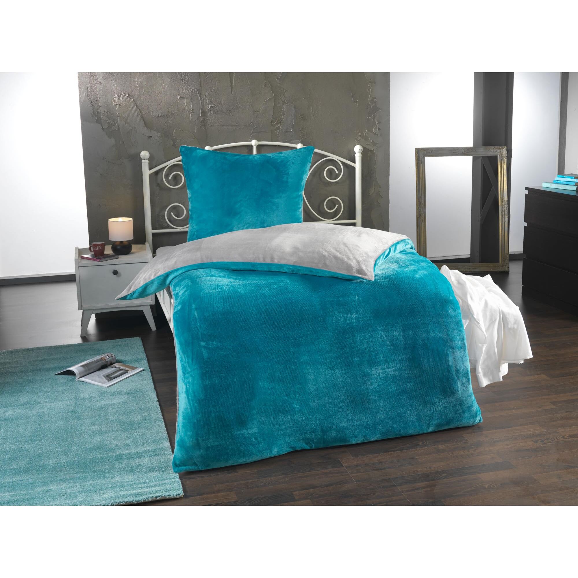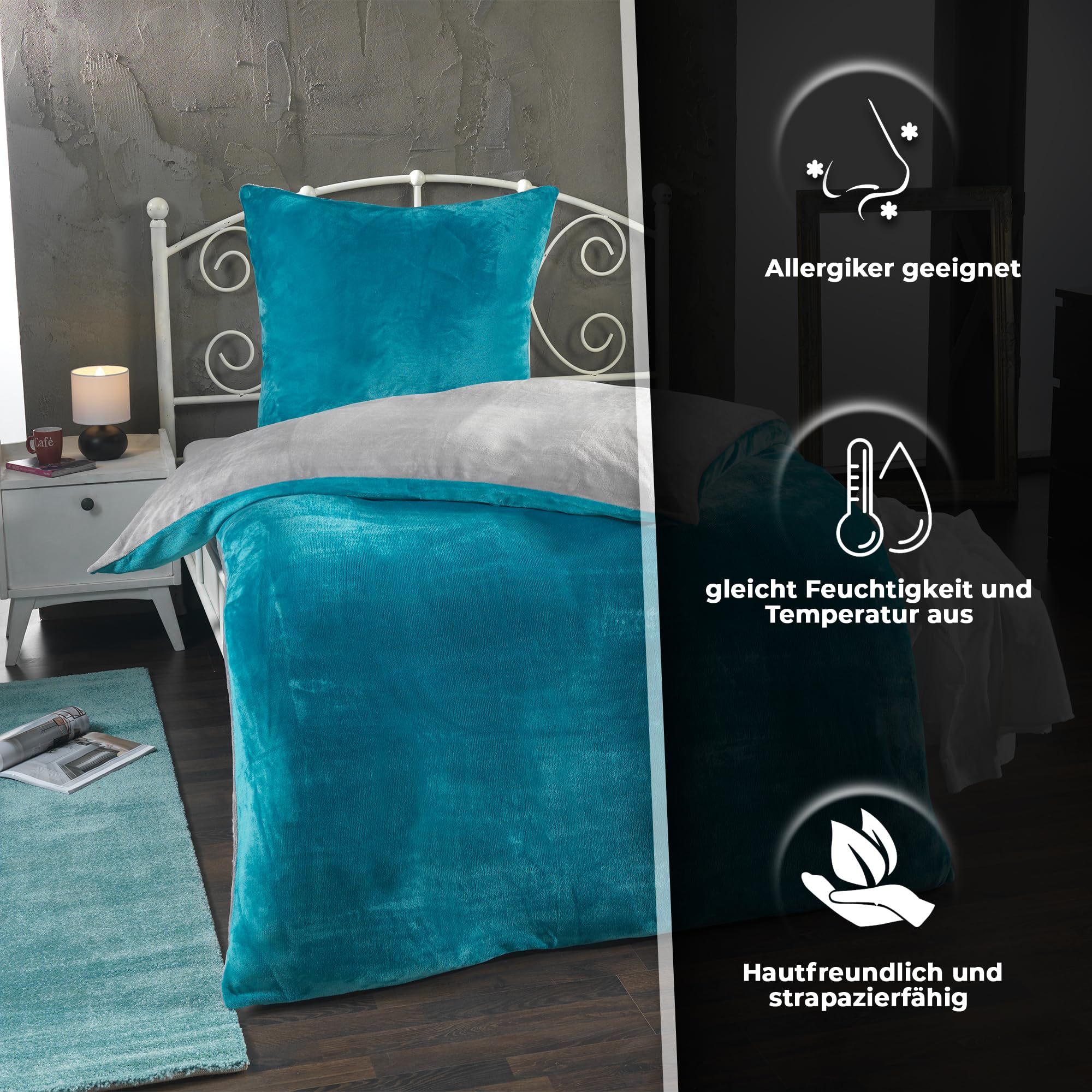 MALIKA Winter Plüsch Wendebettwäsche Nicky-Teddy 'Cashmere Touch' 135-155 - 200x200 Coral Fleece, Farbe:GRAU-Petrol, Grösse:135 x 200 cm
