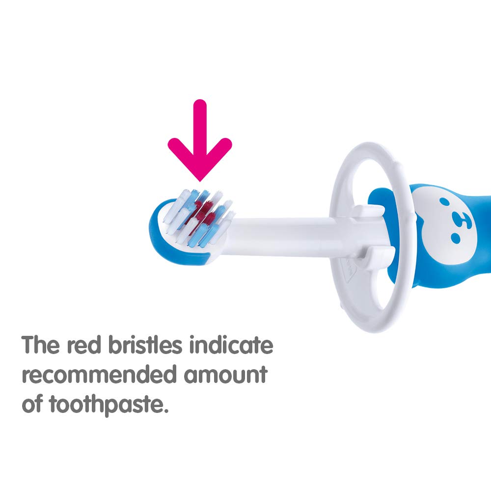 • Rote Borsten – zeigt die richtige Platzierung und Menge an Zahnpasta an, um sicherzustellen, dass Ihr neugeborenes Junge oder Mädchen jedes Mal mit der idealen Menge versorgt wird.