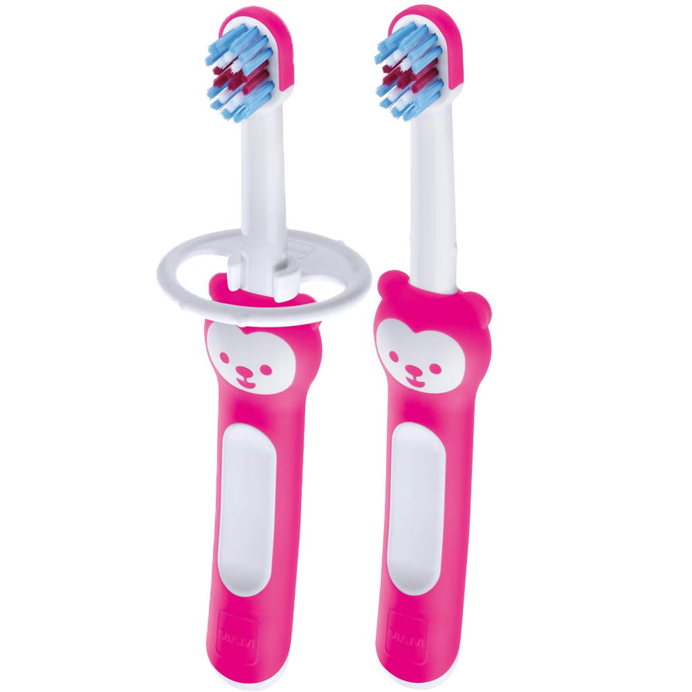MAM Baby Zahnbürste 2er Pack Baby Zahnbürste mit Sicherheitsschildern, ideal für den Unterricht der Zahnhygiene für Säuglinge, Zahnbürste für Babys, ab der Geburt, Rosa